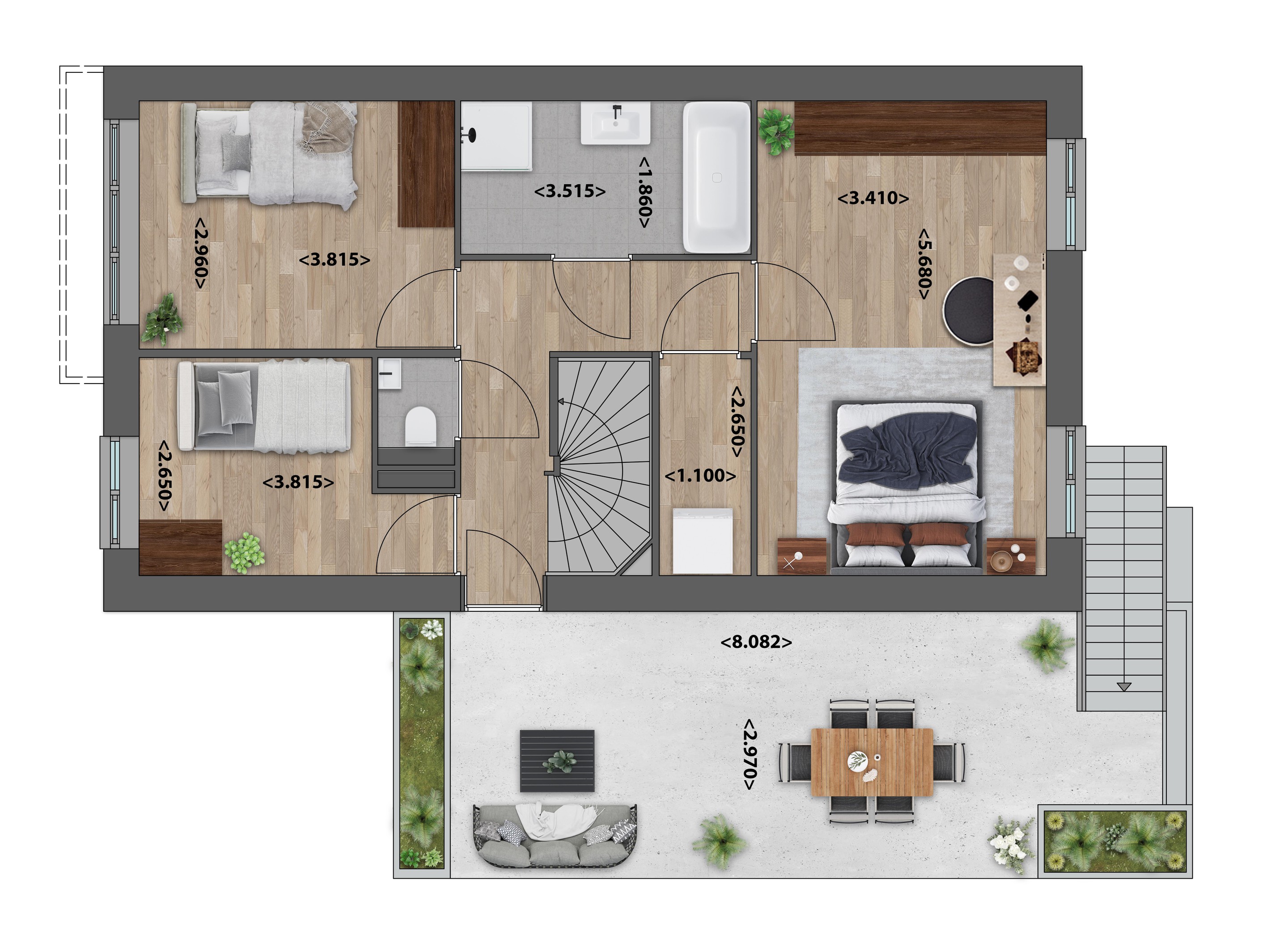 Eerste verdieping De eerste verdieping biedt ruimte, rust en comfort met drie slaapkamers, een luxe badkamer, separaat toilet én een royaal dakterras.