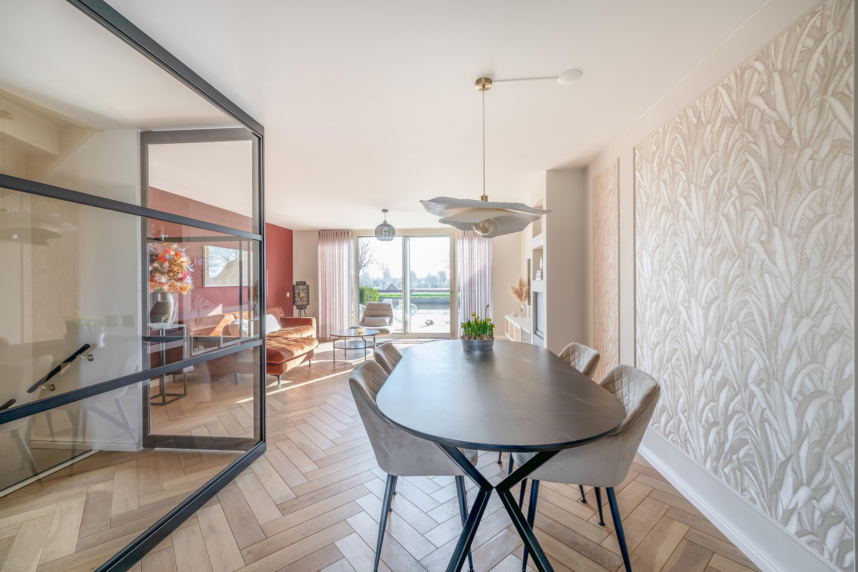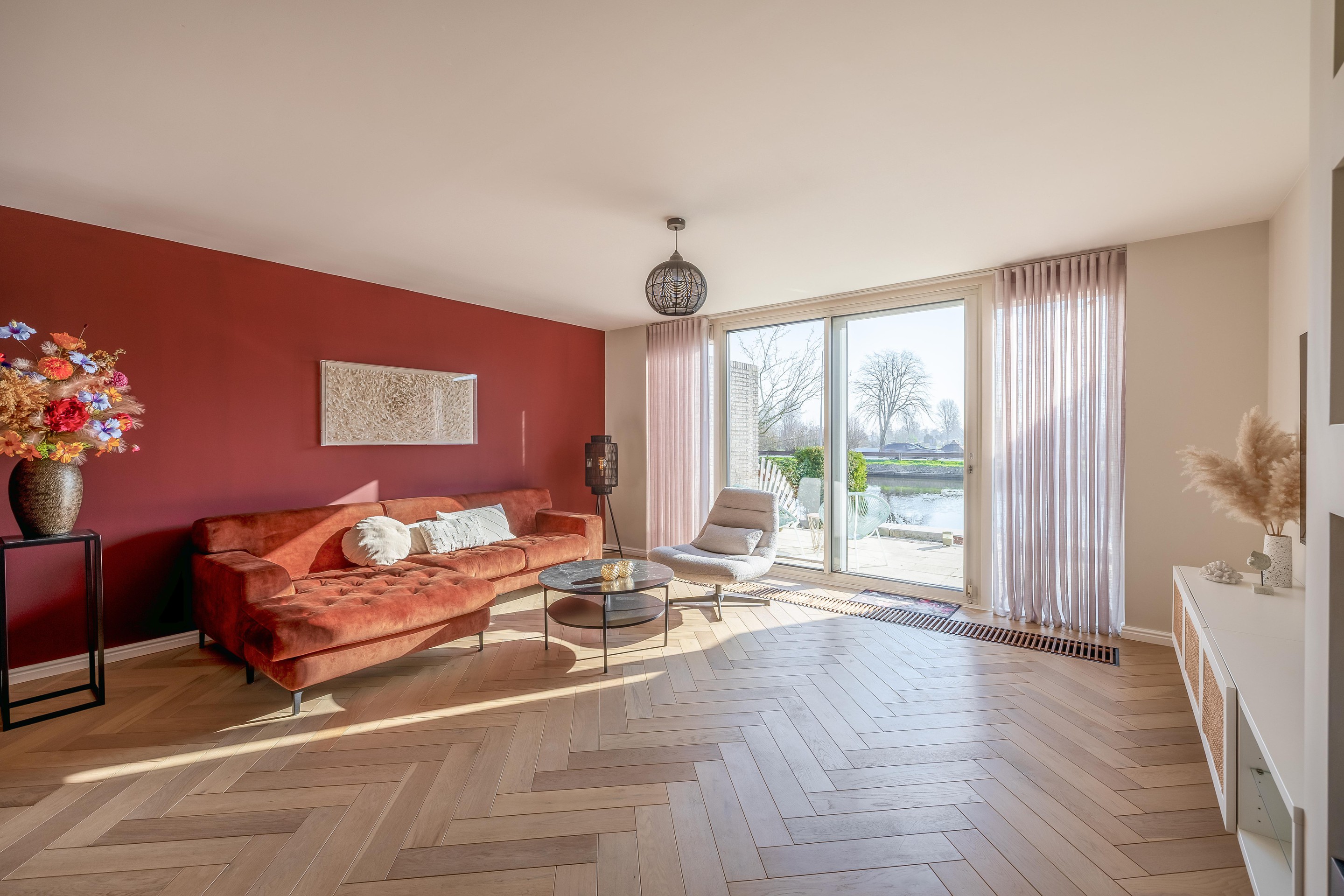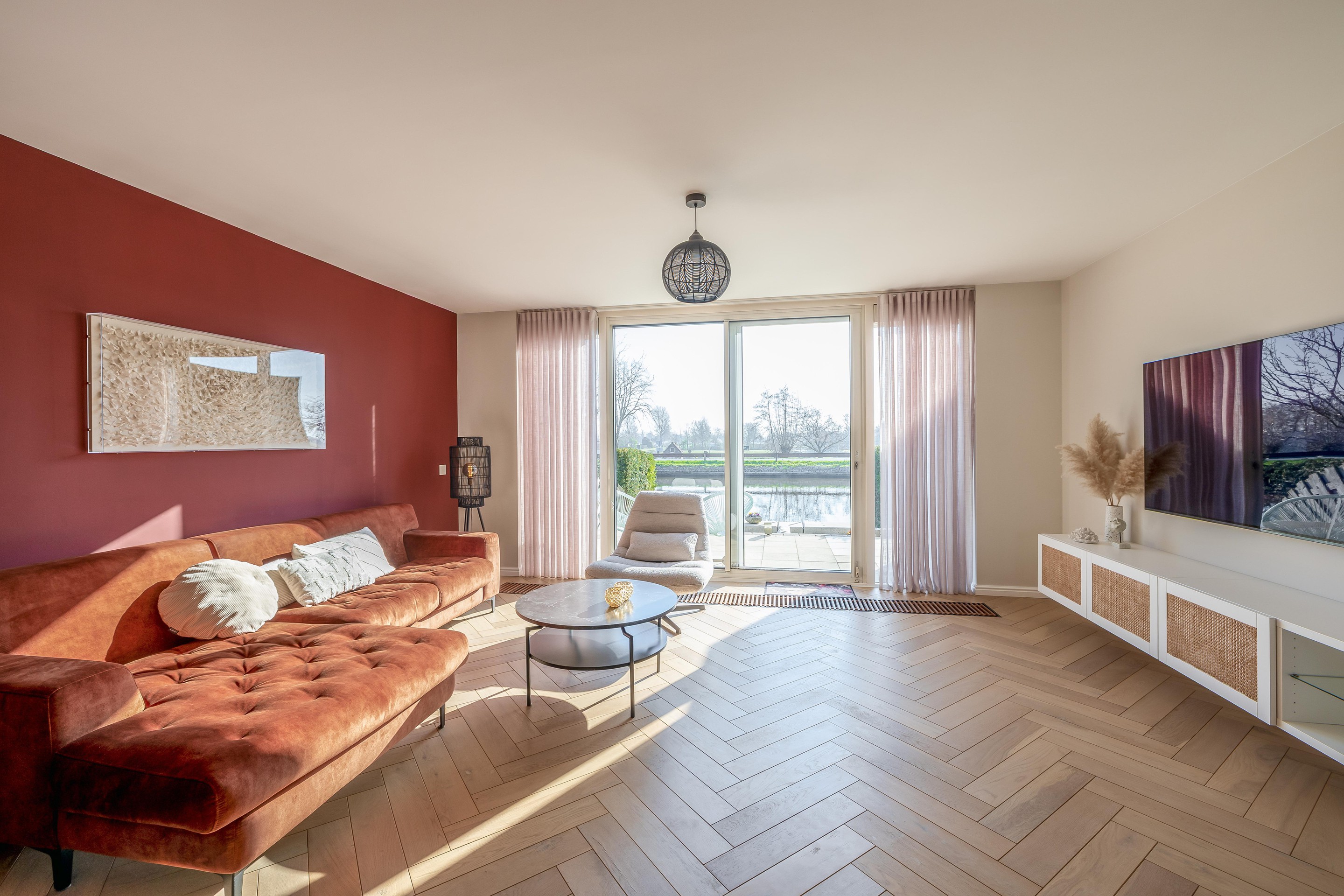 De ruime woonkamer heeft een verhoogde ligging met een prachtig uitzicht op de tuin en het water. Het is een sfeervolle plek met een mooie elektrische haard, subtiel ingebouwd in een vakkenkast die de overgang vormt naar de loungehoek. De wanden zijn afgewerkt met pandpanelen en voorzien van een stijlvol behangdecor.