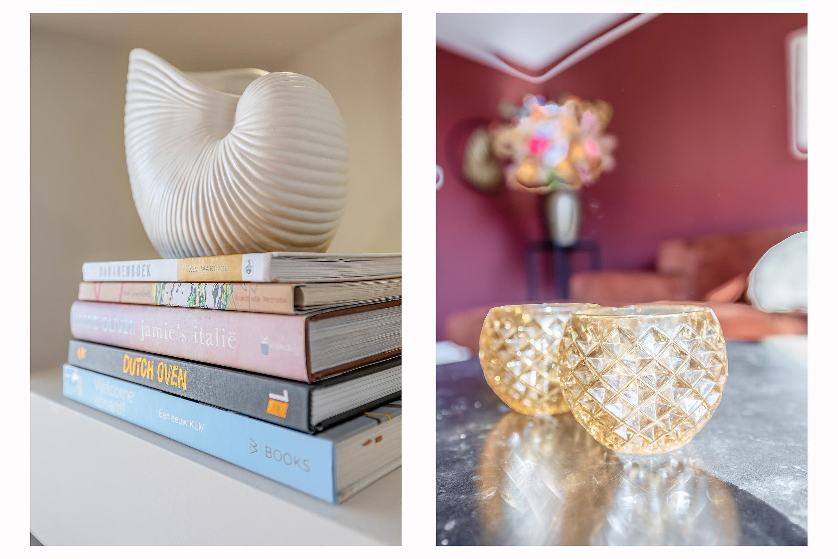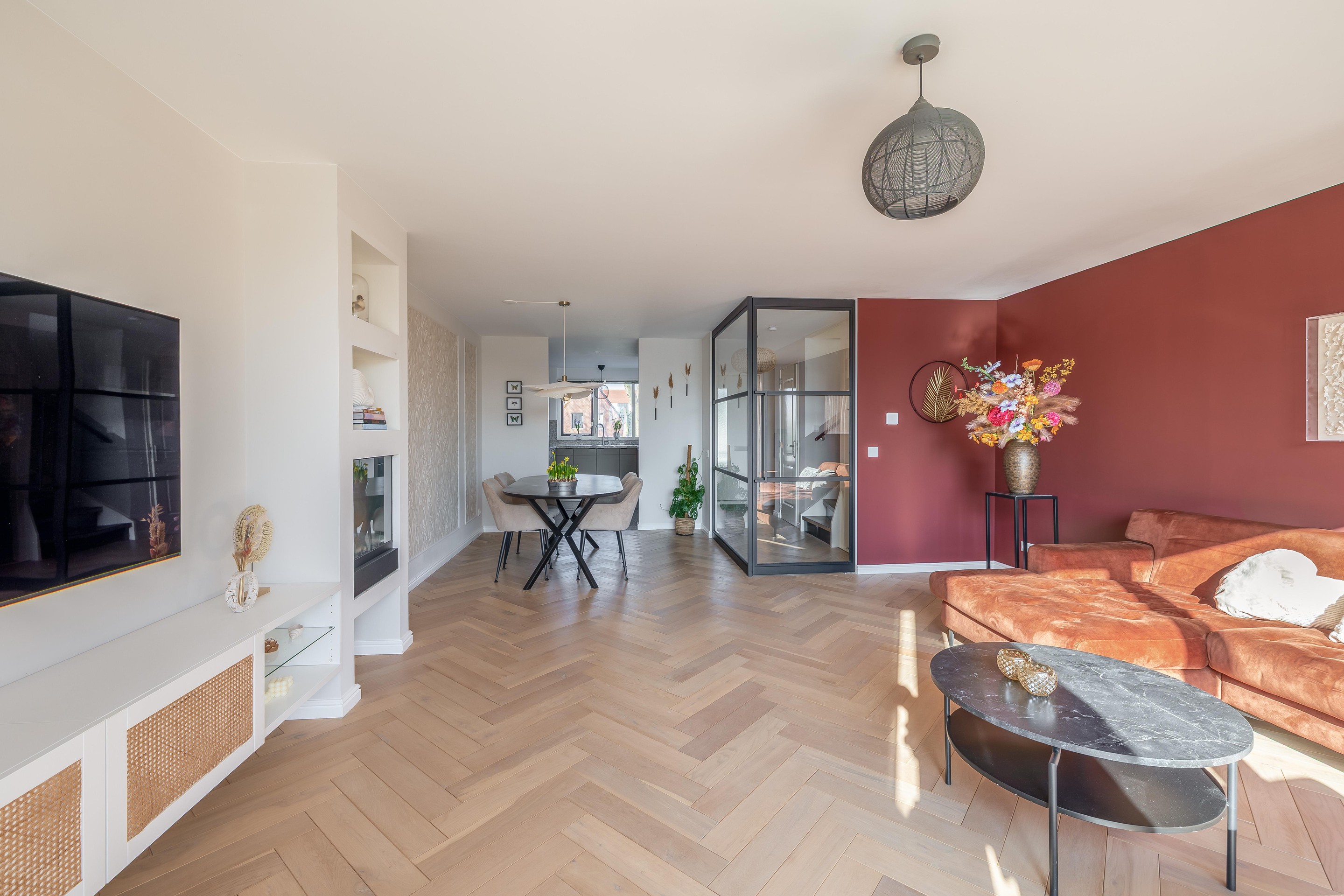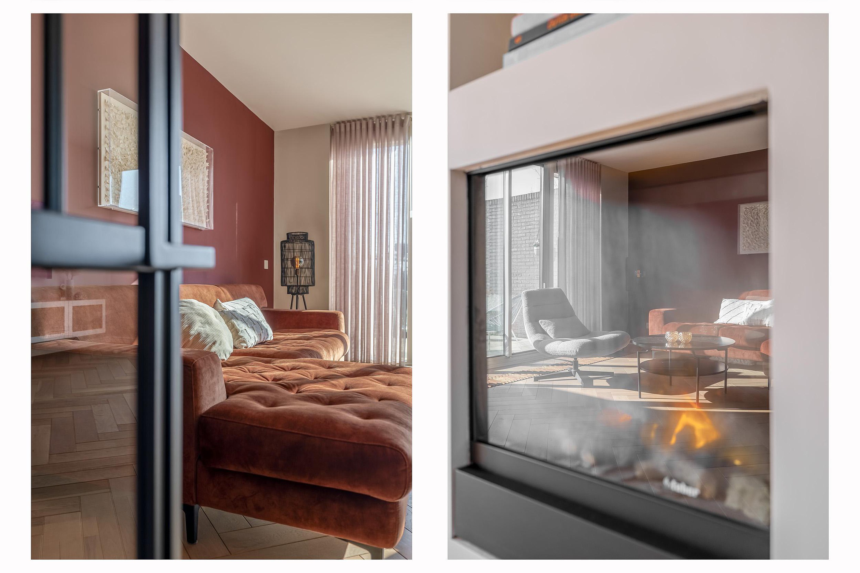 De ruime woonkamer heeft een verhoogde ligging met een prachtig uitzicht op de tuin en het water. Het is een sfeervolle plek met een mooie elektrische haard, subtiel ingebouwd in een vakkenkast die de overgang vormt naar de loungehoek. De wanden zijn afgewerkt met pandpanelen en voorzien van een stijlvol behangdecor.