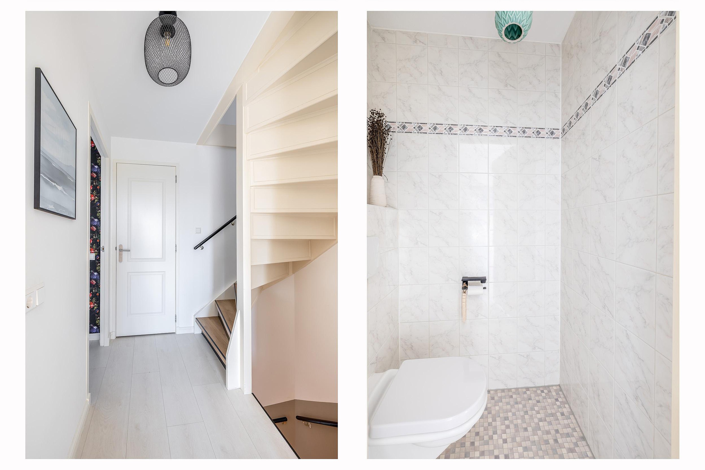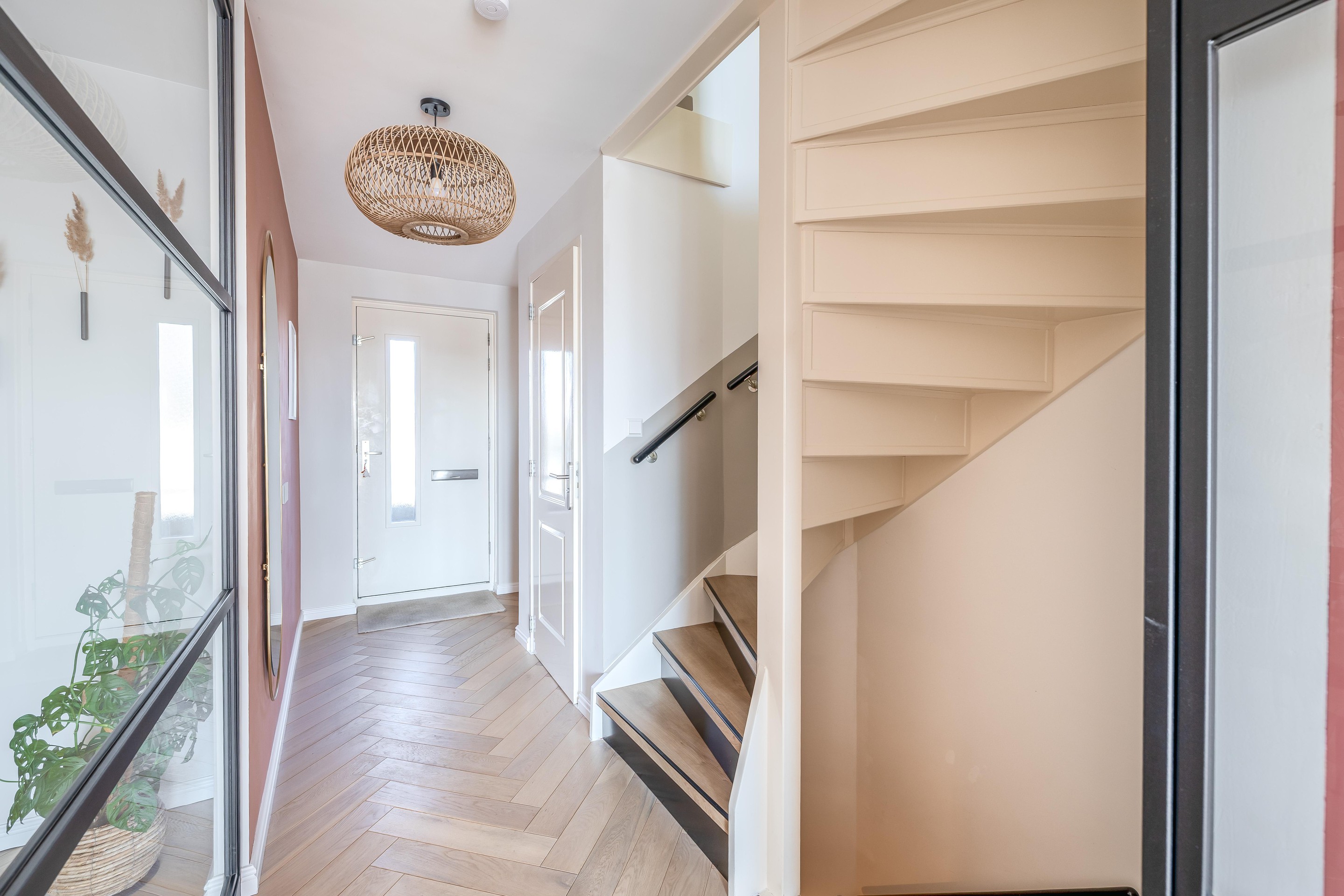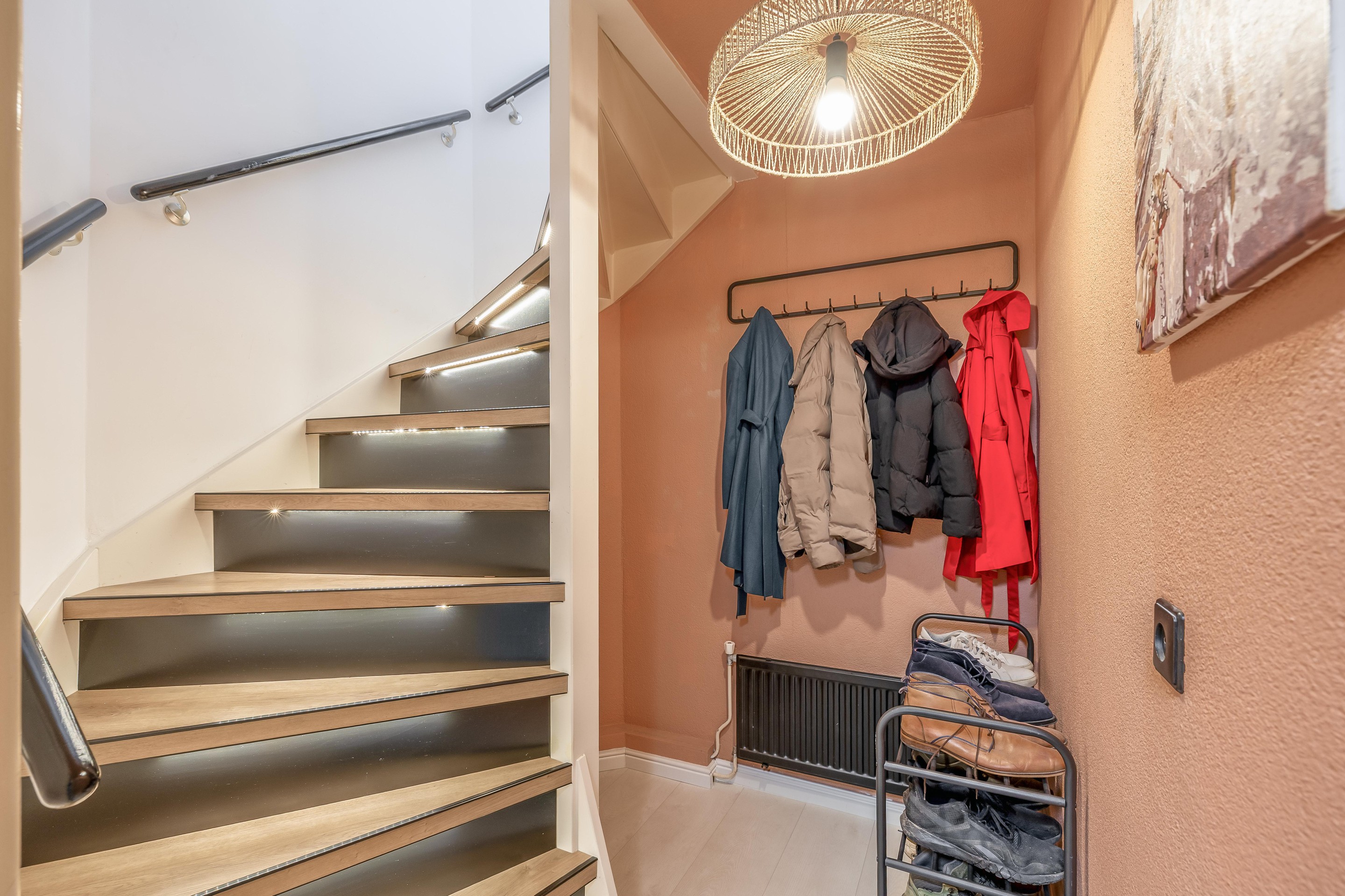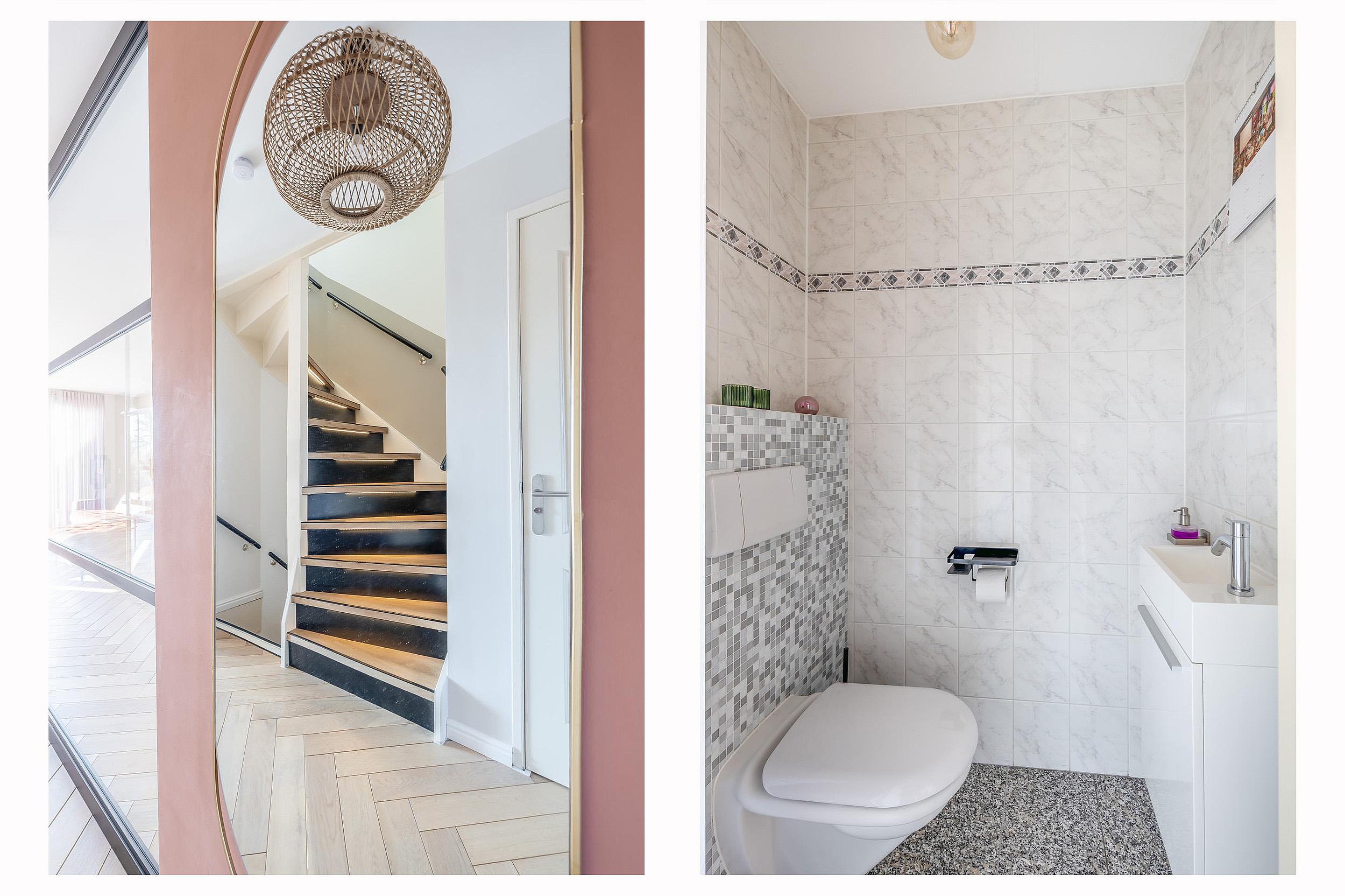 Via een tussenportaal en de open trap bereik je de begane grond. Wat hier direct opvalt is het strak gestuukte trappenhuis en de prachtige traprenovatie met subtiele ingebouwde verlichting. In de hal bevindt zich de meterkast en een luxe, geheel betegelde toiletruimte met fontein. Door de glazen pui tussen de hal en de woonkamer loopt de stijlvolle houten visgraatvloer visueel prachtig door, terwijl de wandkleuren van beide ruimtes perfect op elkaar zijn afgestemd.