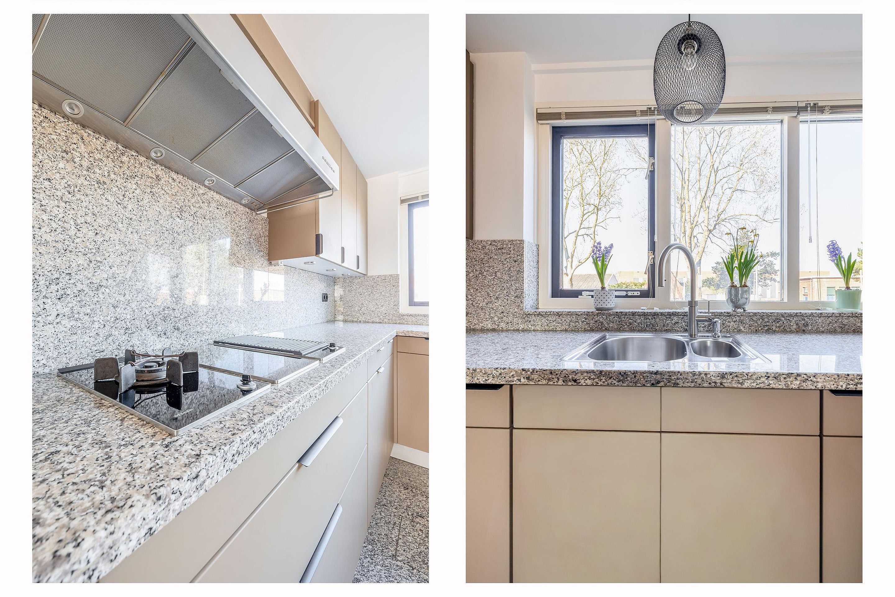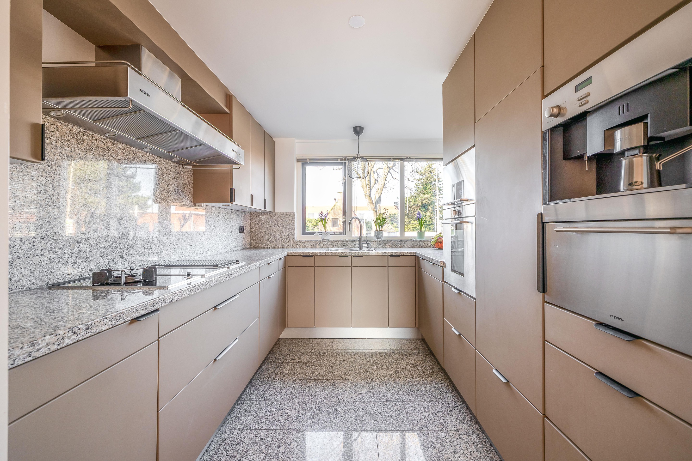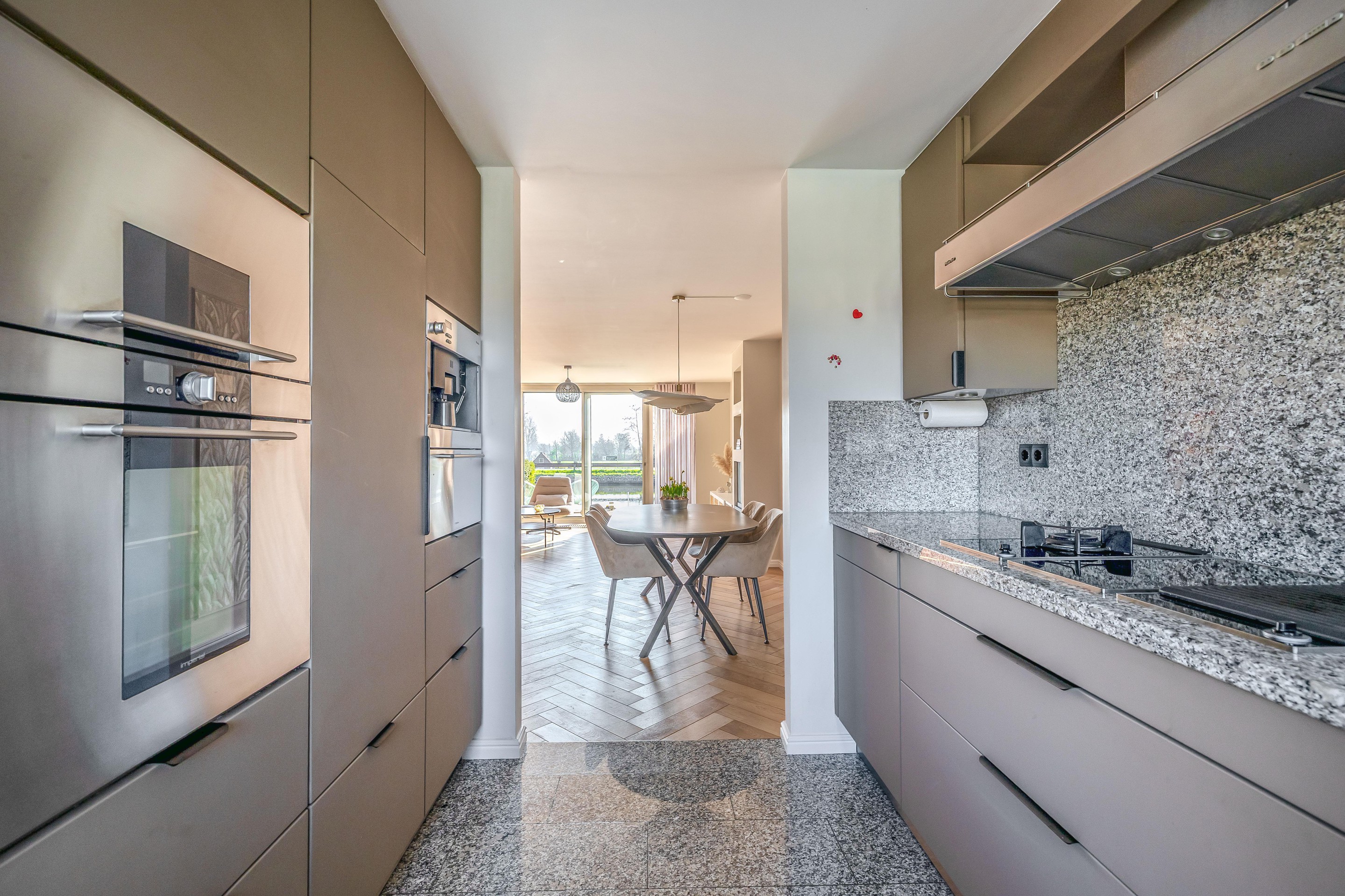 Aan de voorzijde is er alle ruimte voor een riante eettafel, die in verbinding staat met de luxe keuken. De U-opgestelde open keuken is compleet uitgevoerd in moderne beige-bruin tinten en voorzien van diverse inbouwapparatuur, waaronder een vaatwasser, oven, hogedruk stoomoven, warmhoudlade en diverse kookplaten (keramisch, wokbrander en teppanyakiplaat).
