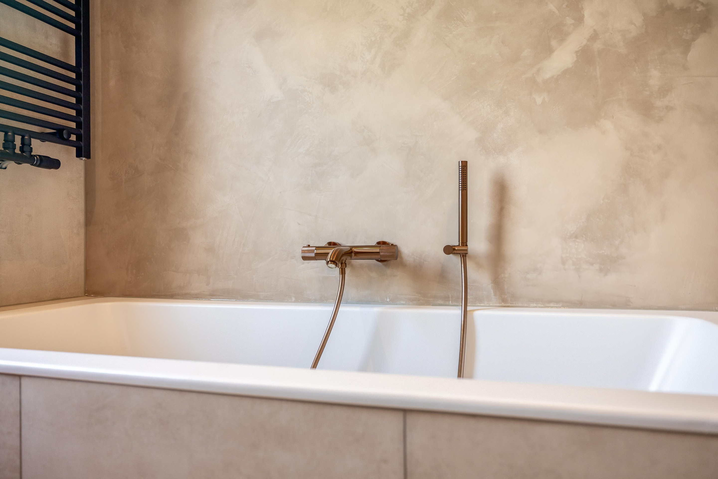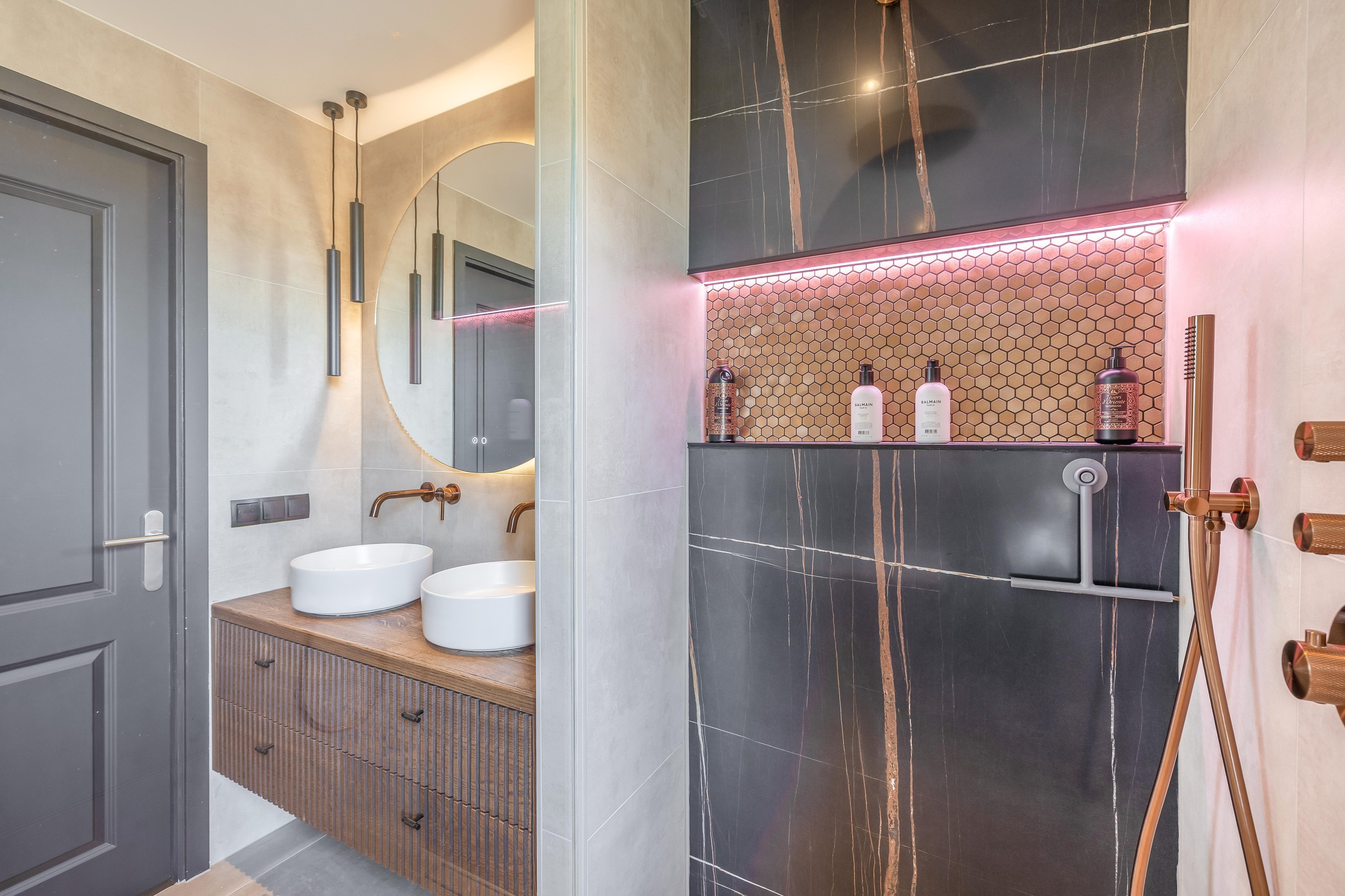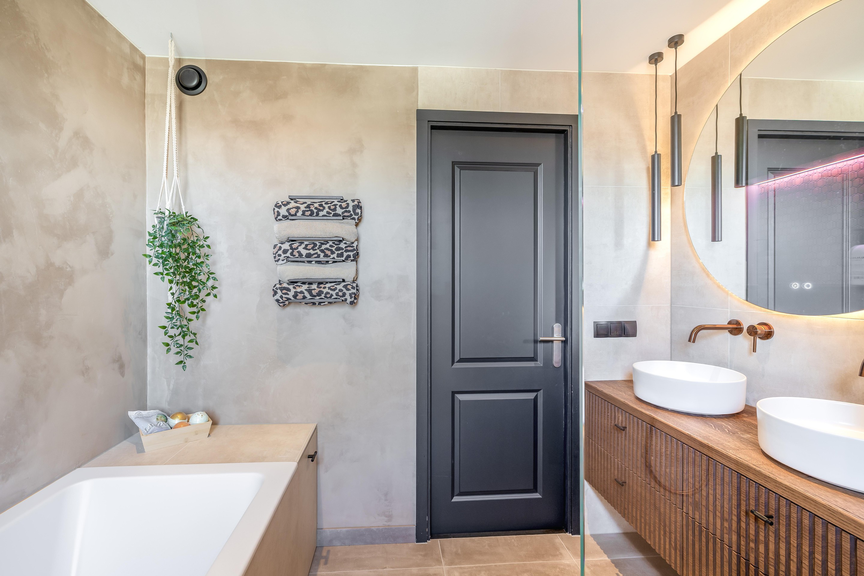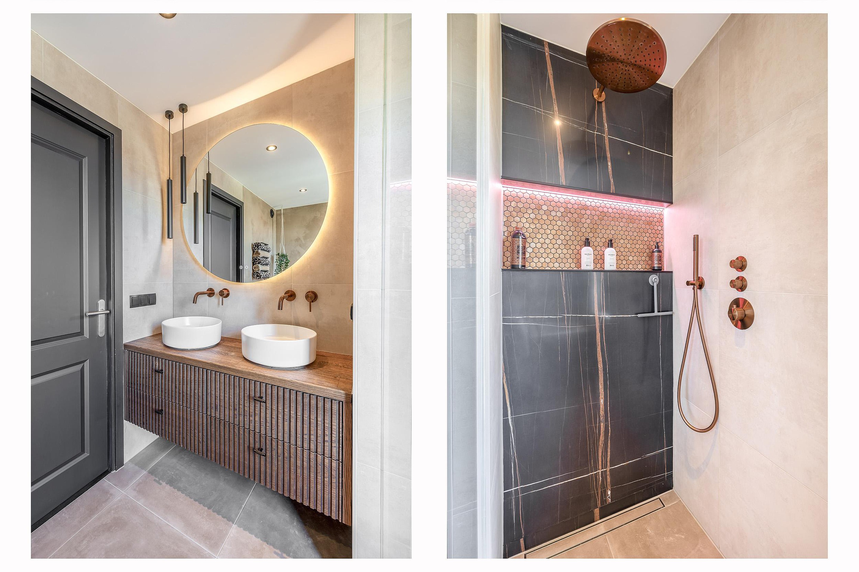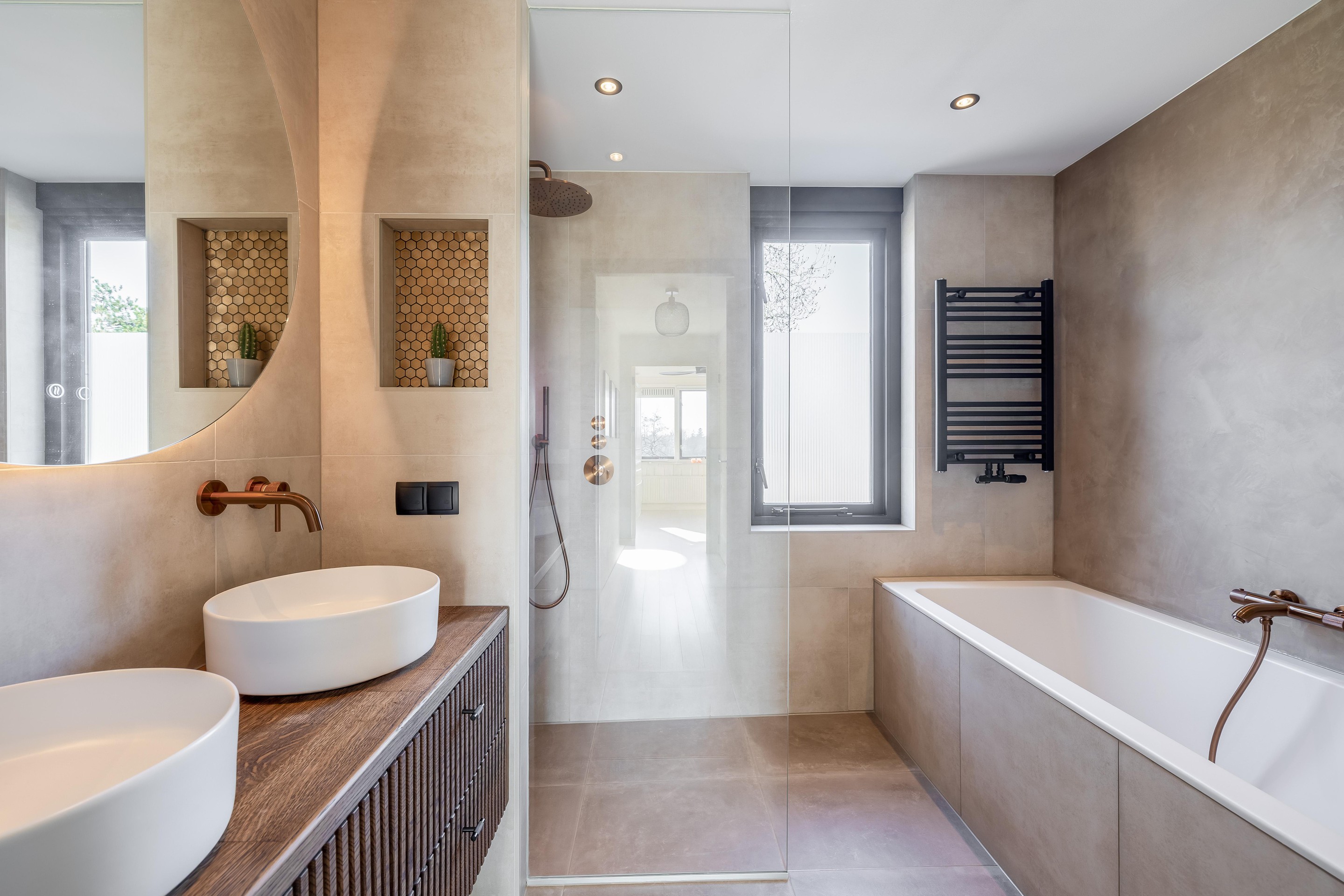 De badkamer straalt pure luxe uit met een groot ligbad, een douchecabine met glazen vakkenwand en een op maat gemaakt meubel met twee waskommen. De kranen uit de muur, de zwarte kozijnen en de handdoekradiator zorgen voor een moderne look, afgemaakt met een gestuukt plafond met inbouwverlichting.