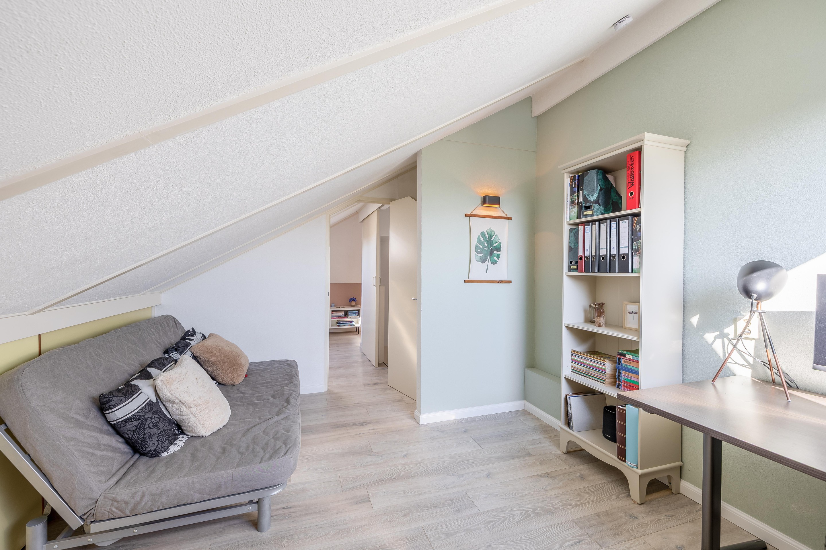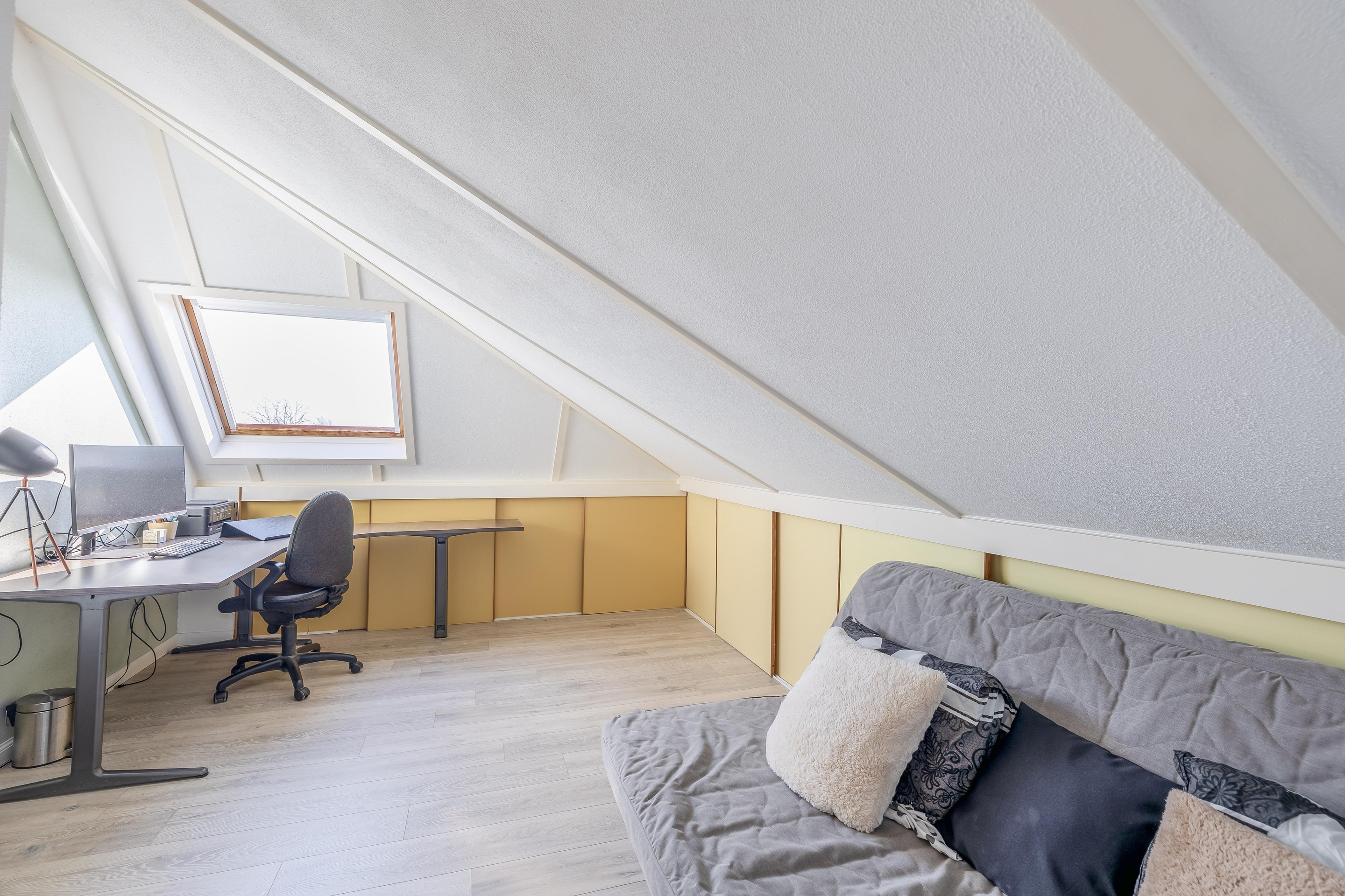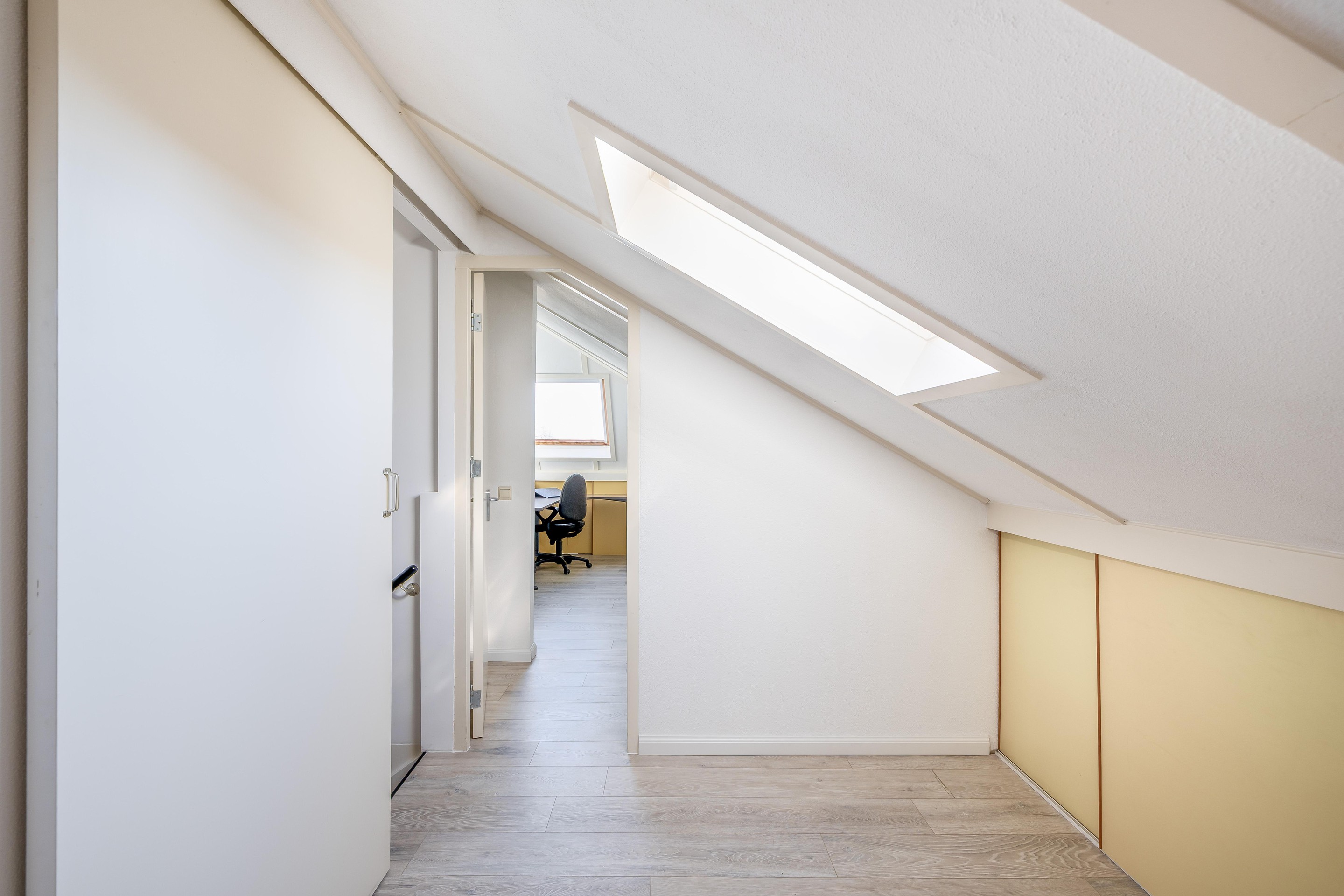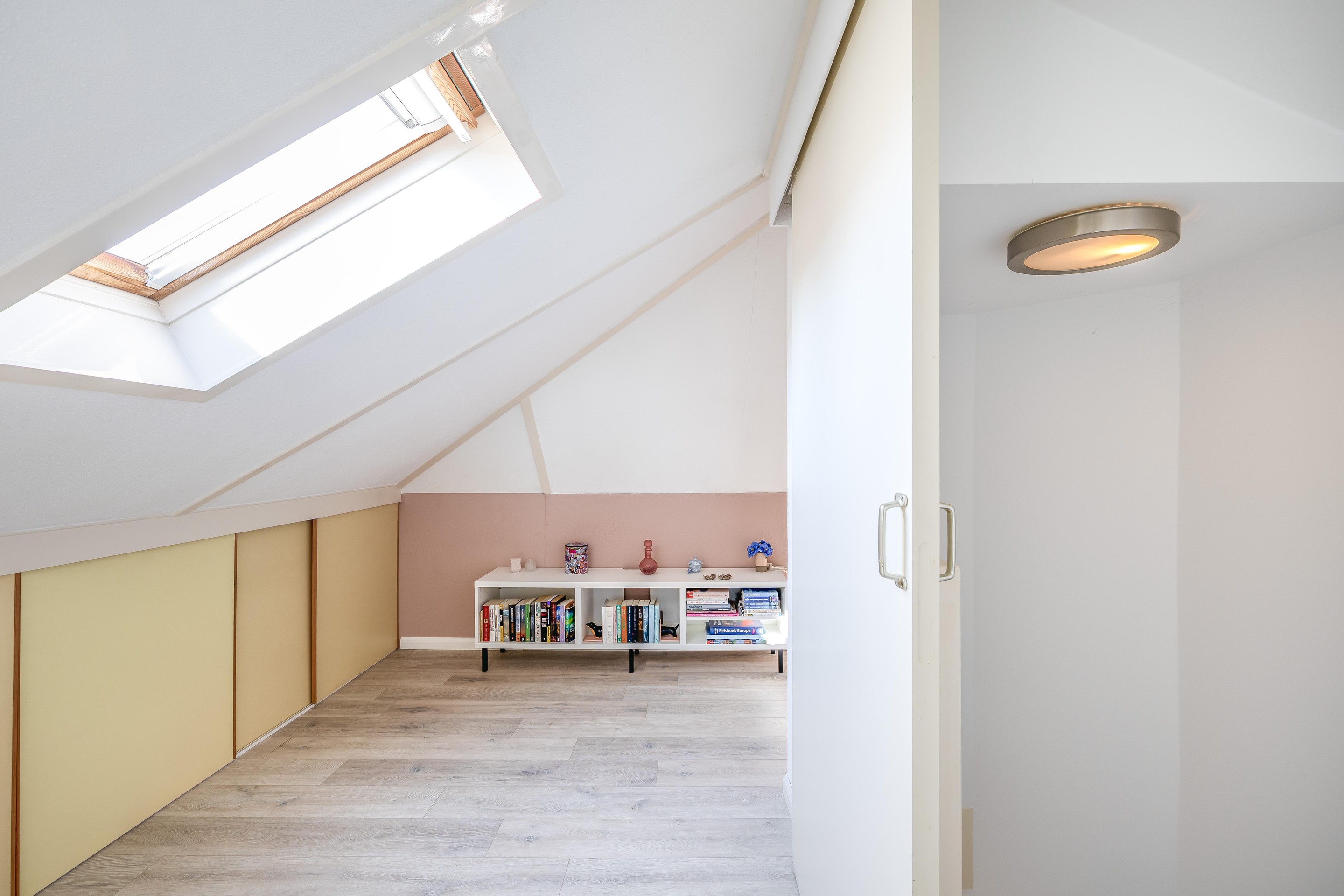 De gemoderniseerde trap leidt naar de zolder. Op de voorzolder vind je de opstelplaats voor de wasmachine, droger en de c.v.-combiketel. Aan de achterzijde bevindt zich de derde slaapkamer van ruim 11 m2, die heerlijk licht is door het Velux dakvenster. Er is veel bergruimte achter de knieschotten en in totaal zorgen twee Velux raamvensters voor een prettige lichtinval over de gehele verdieping.