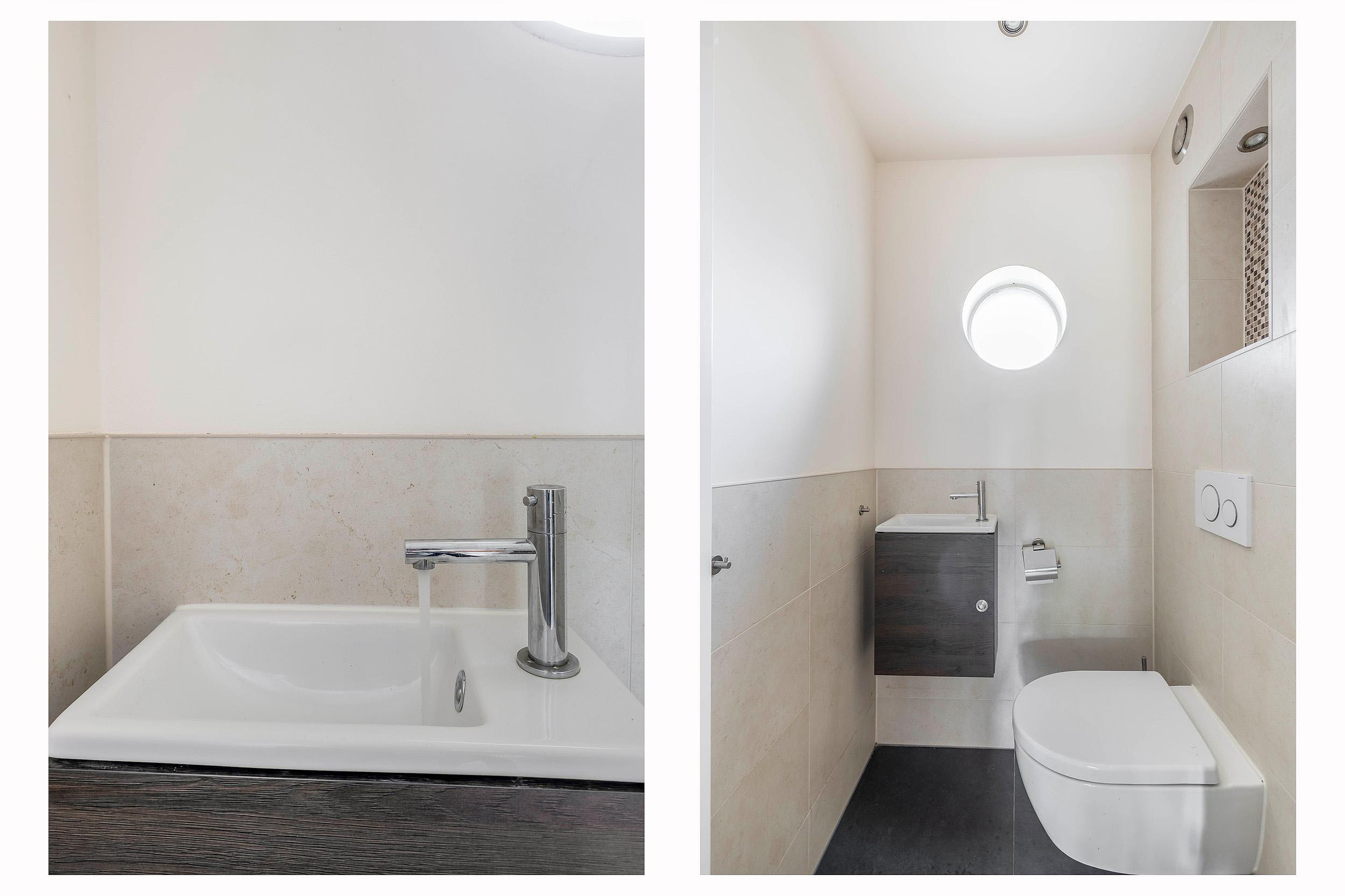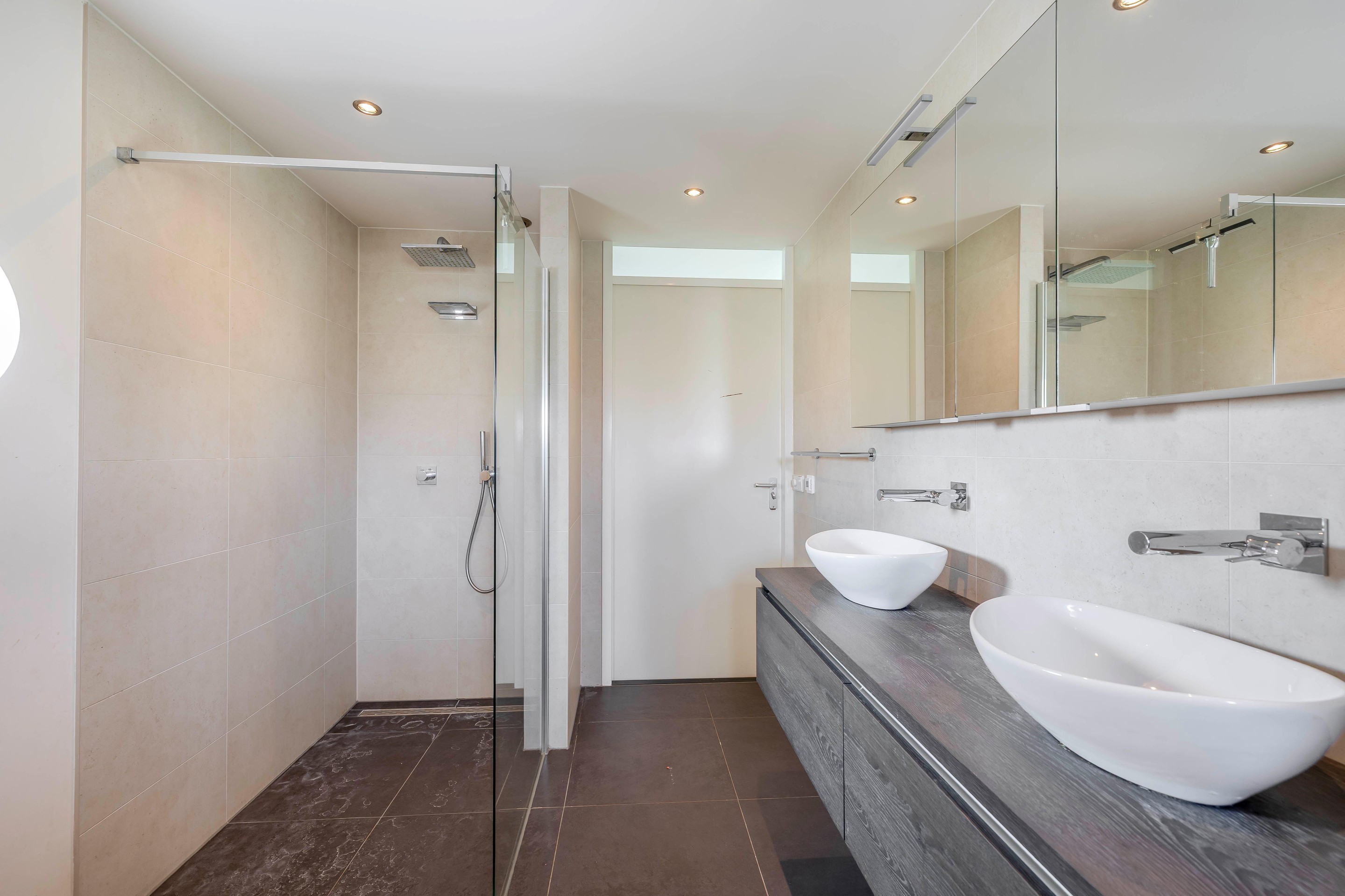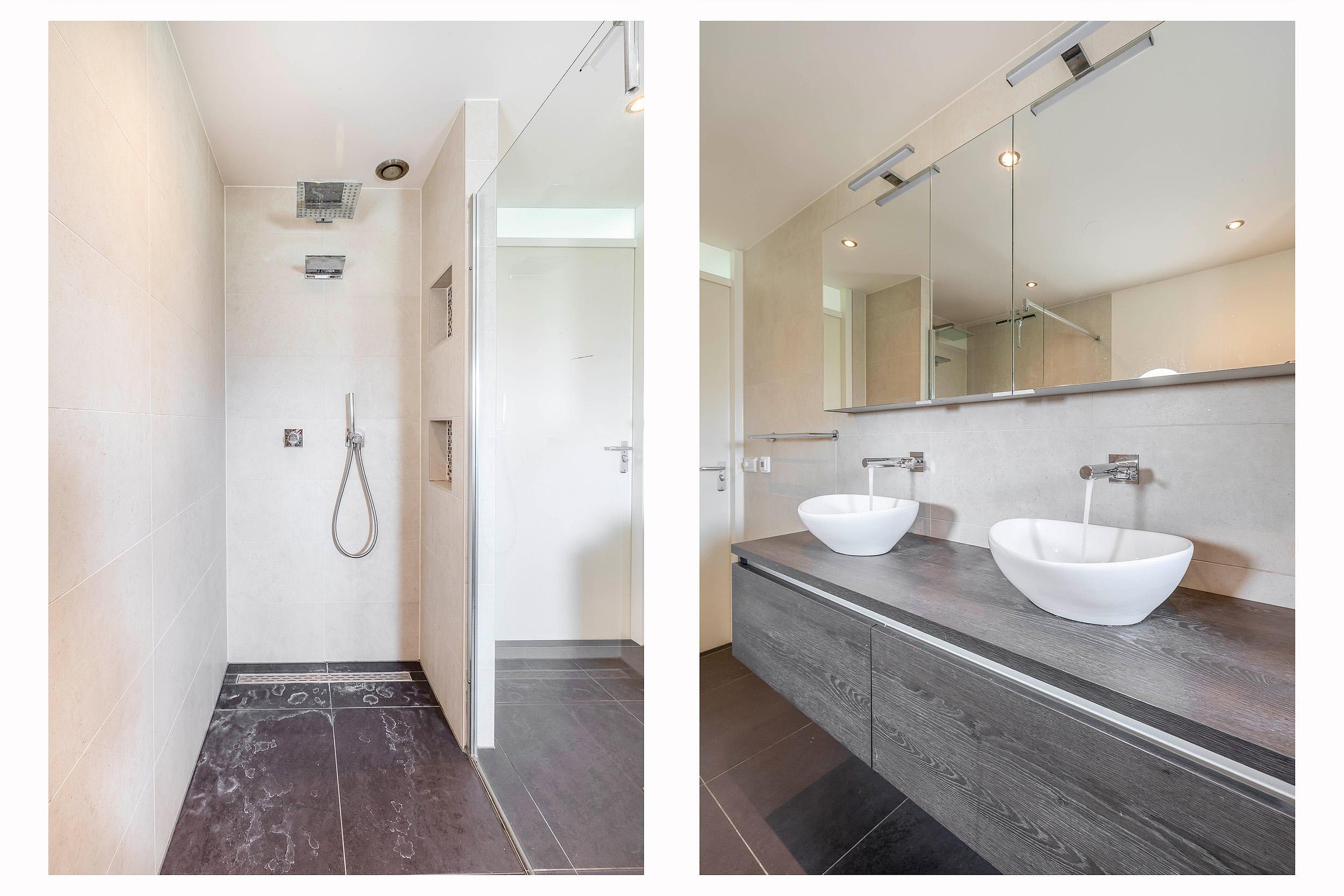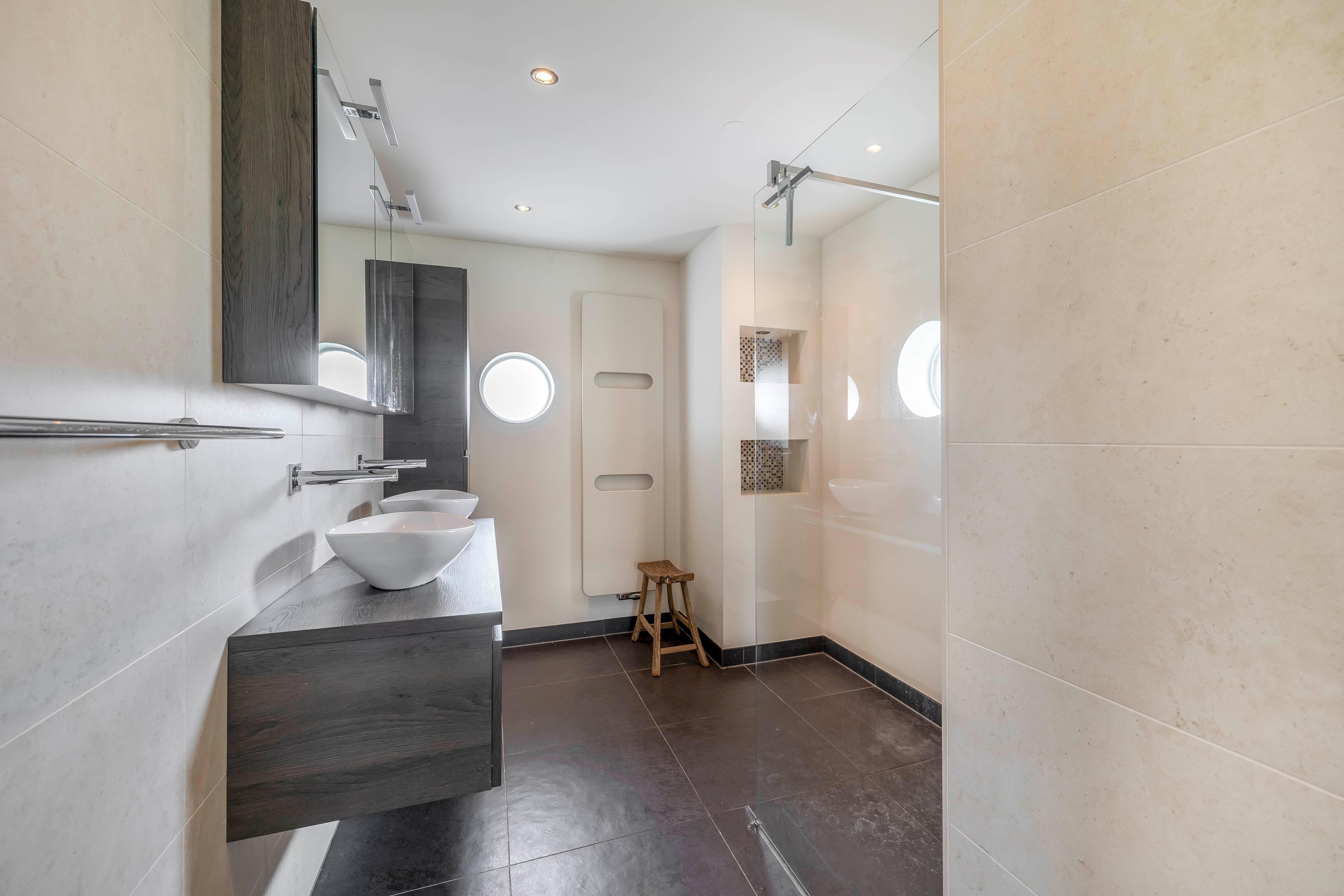 De badkamer is luxe uitgevoerd met degelijke materialen. Er is een ruime inloopdouche met regen- en handdouche, een breed wastafelmeubel met dubbele waskom, vloerverwarming, een spiegelkast met verlichting en een designradiator. Twee ronde ramen zorgen voor een prettige lichtinval.