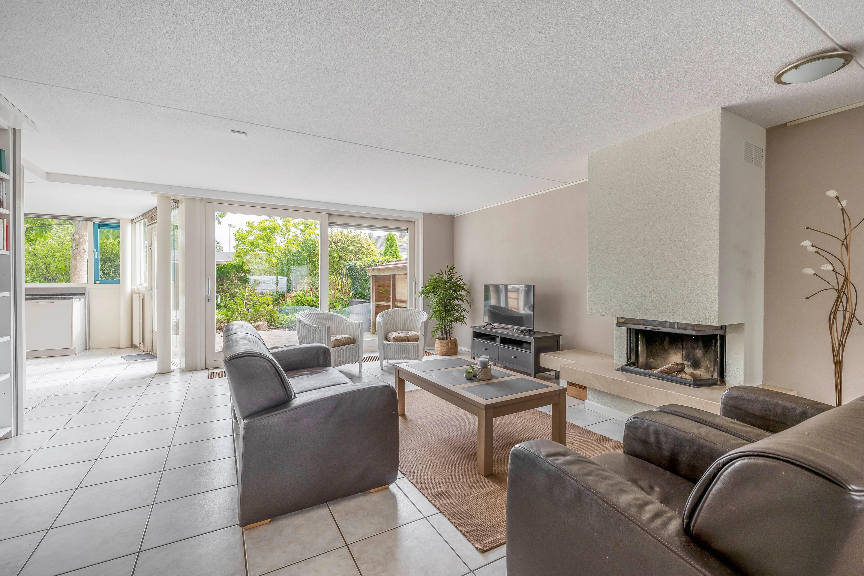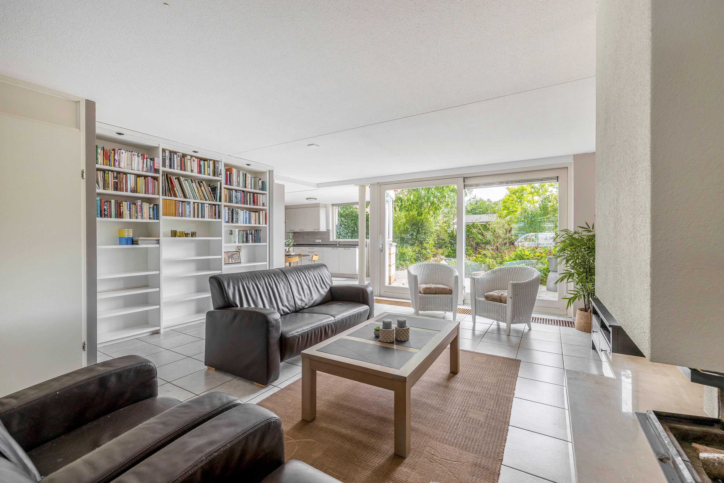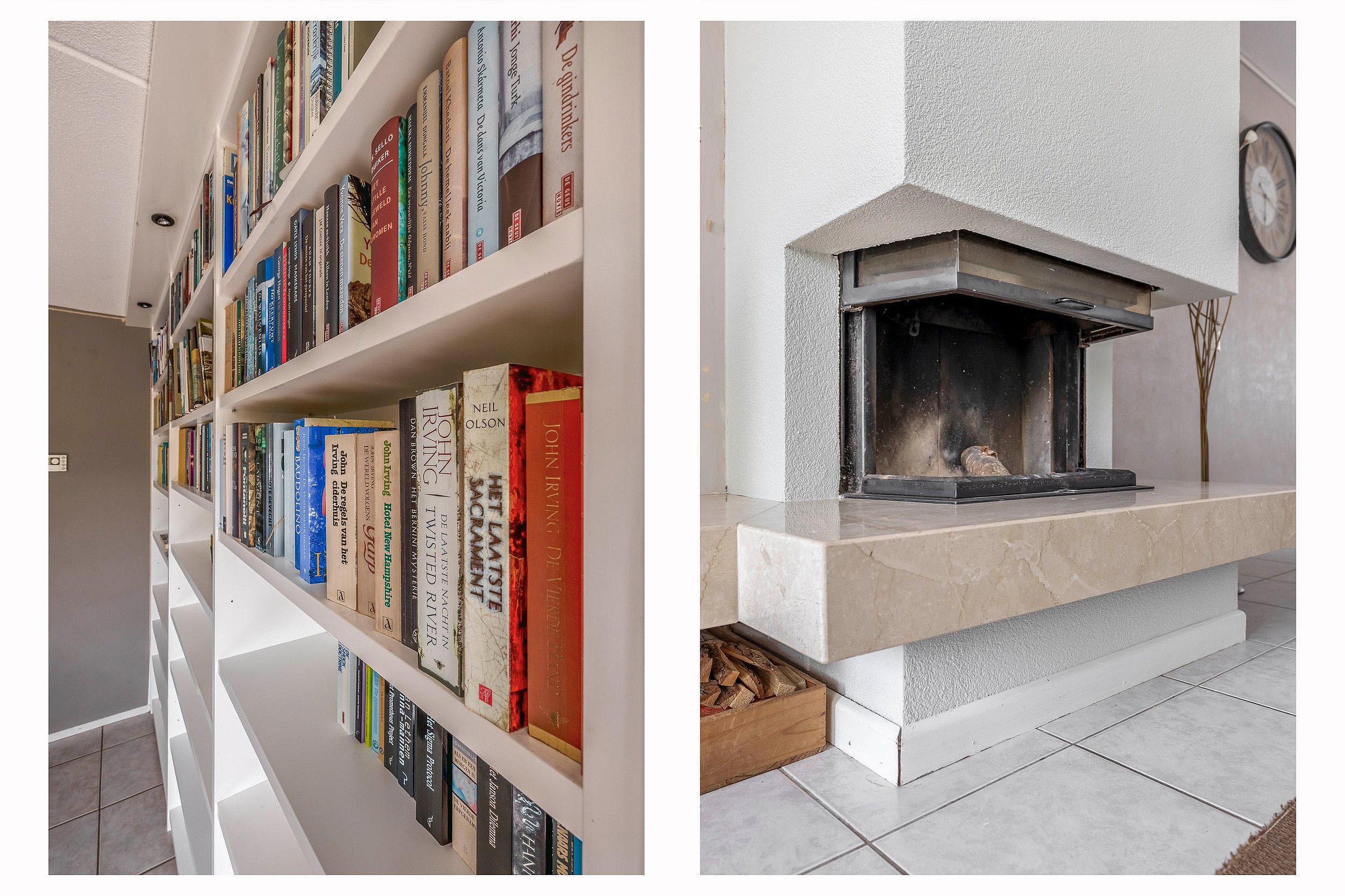 De woonkamer is royaal en biedt plaats aan een grote eethoek en een zitgedeelte. Centraal valt de fraaie schouw met houtgestookte open haard op. Via de schuifpui heb je rechtstreeks toegang tot de tuin. Verder is er een trapkast aanwezig. De vloer is afgewerkt met tegels en voorzien van vloerverwarming.