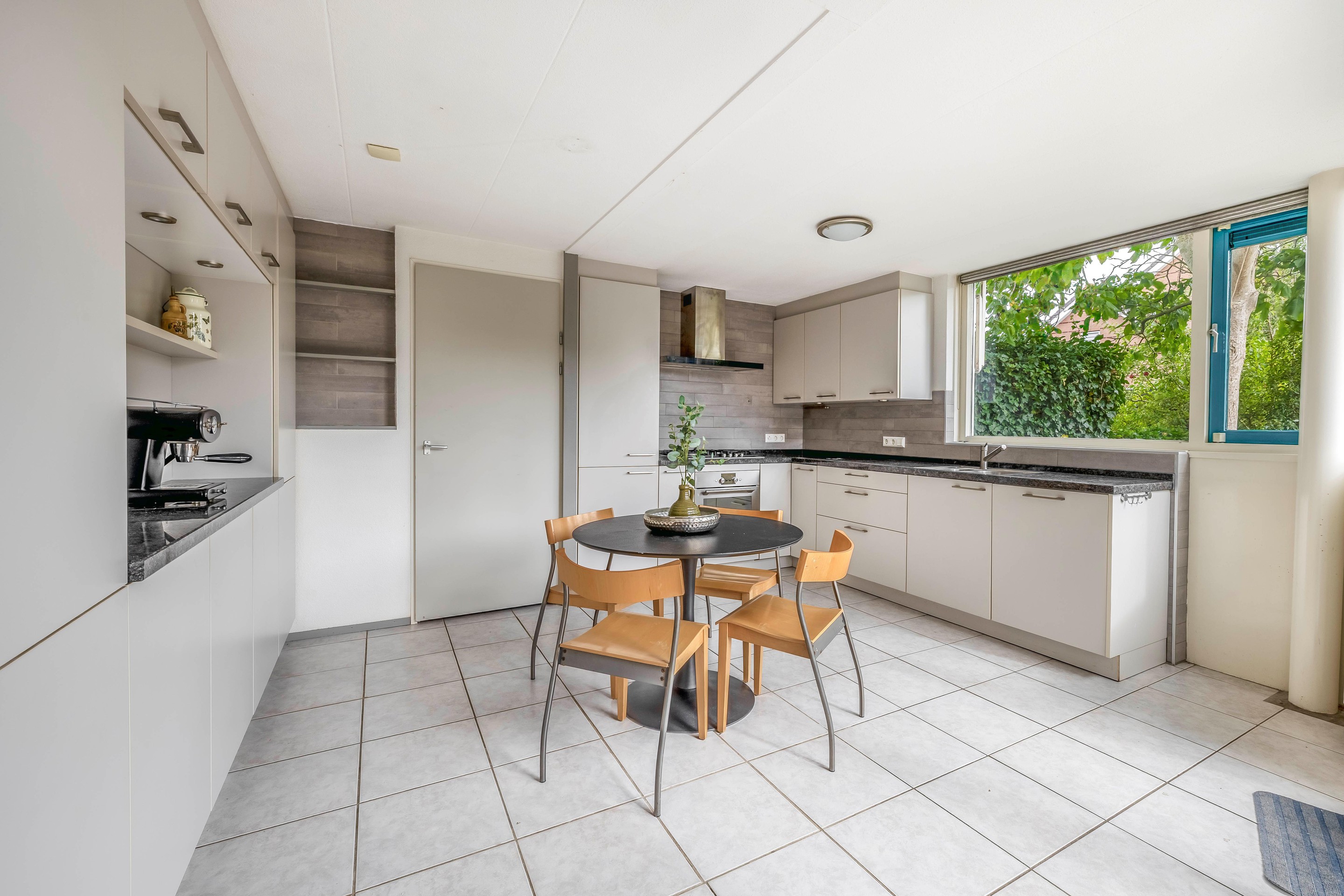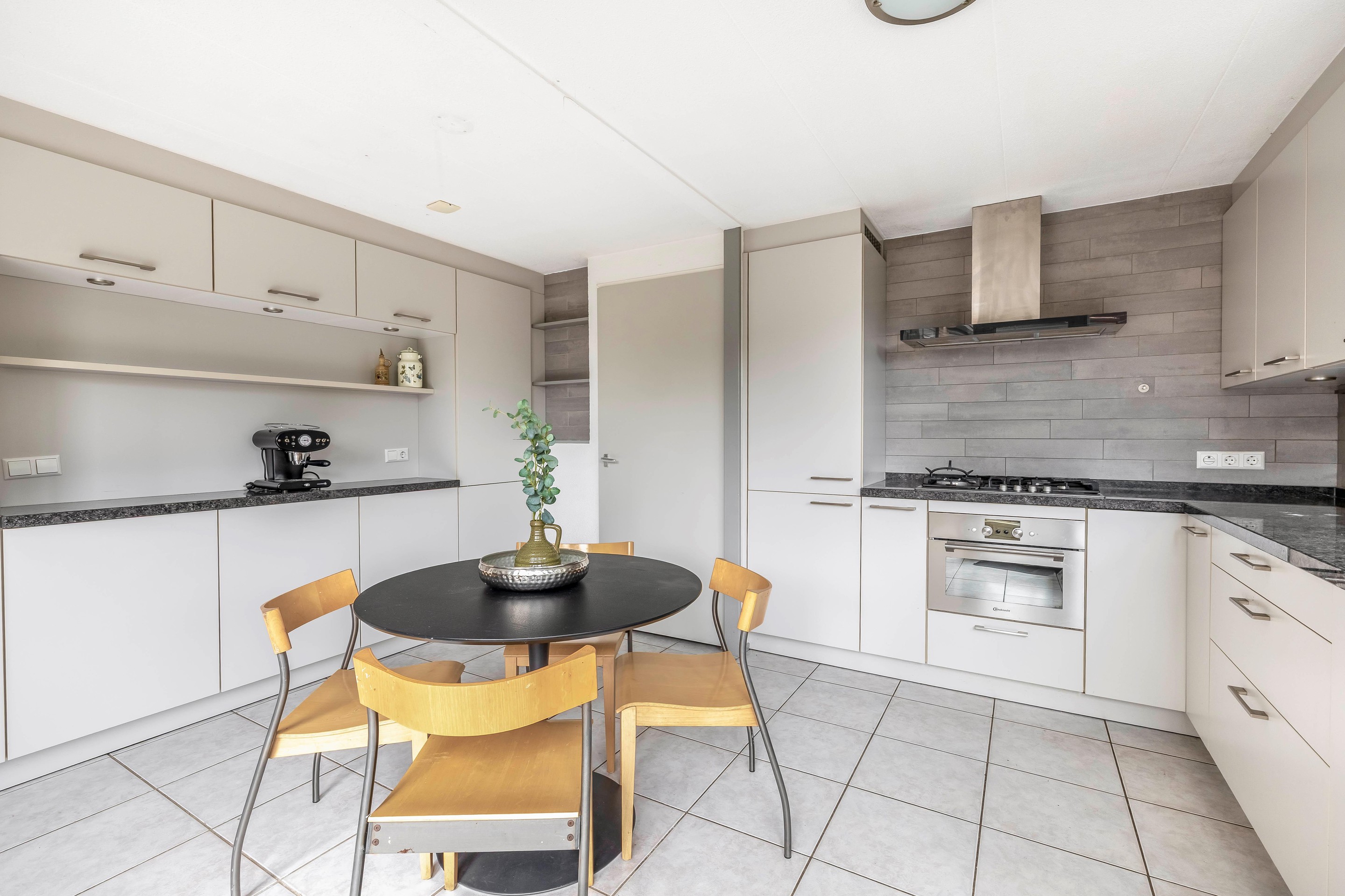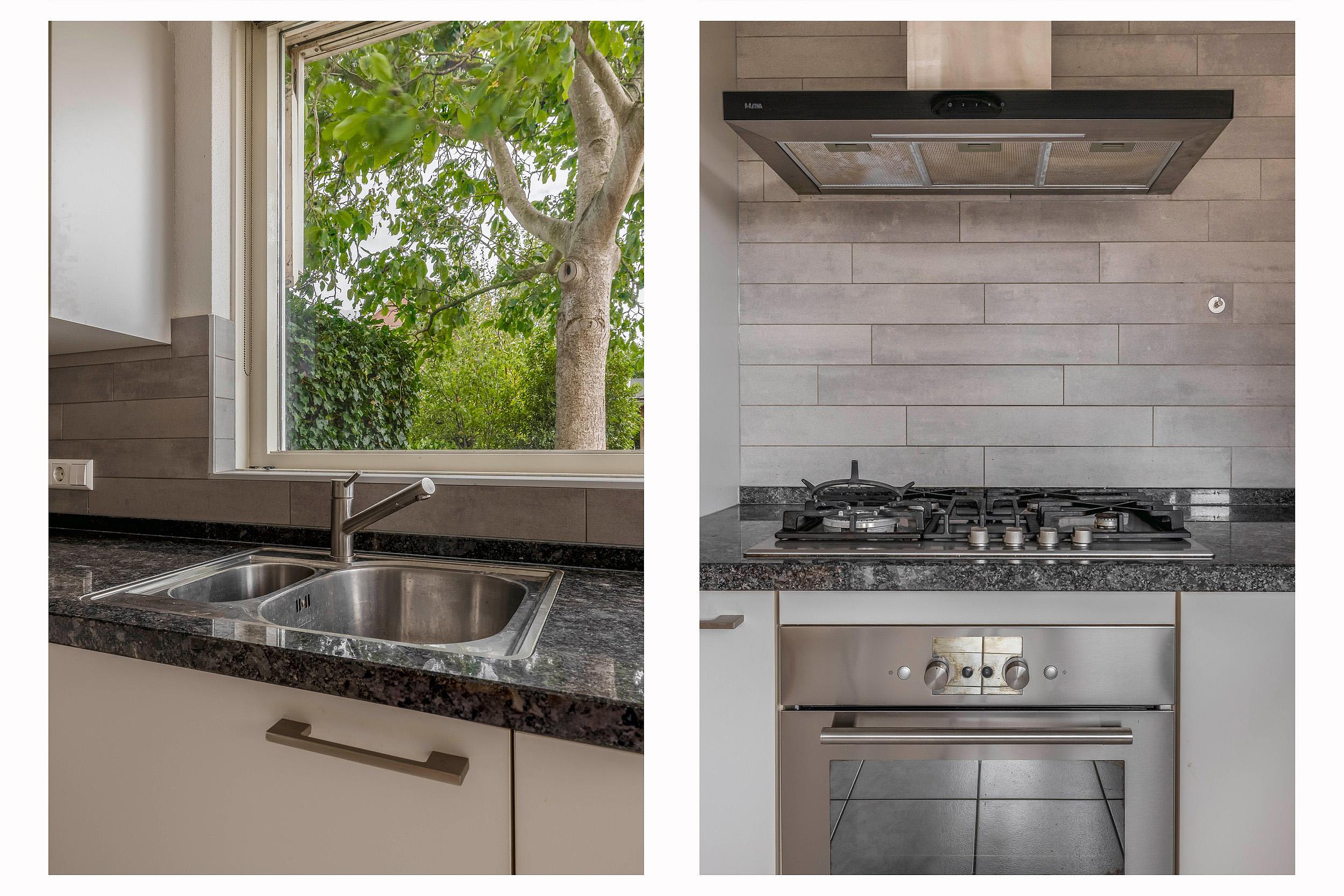 De keuken ligt aan de achterzijde en is praktisch ingericht met diverse kasten en werkruimte. Het natuurstenen werkblad contrasteert mooi met de lichte kastfronten. De inbouwapparatuur bestaat o.a. uit een vaatwasser, gaskookplaat, koelkast met vriezer en afzuigkap. Er is bovendien een kleine bijkeuken gerealiseerd voor wasmachine en droger. Vanuit de keuken heb je gezellig uitzicht op de tuin.