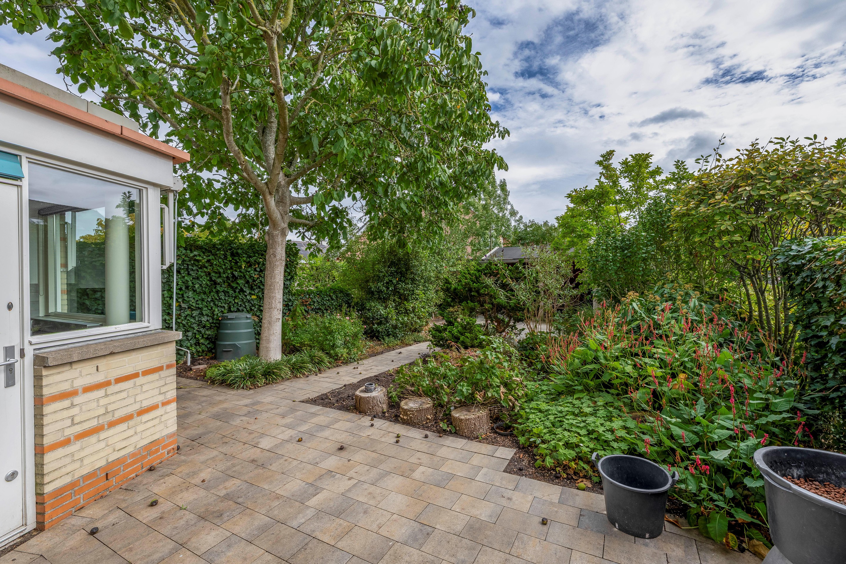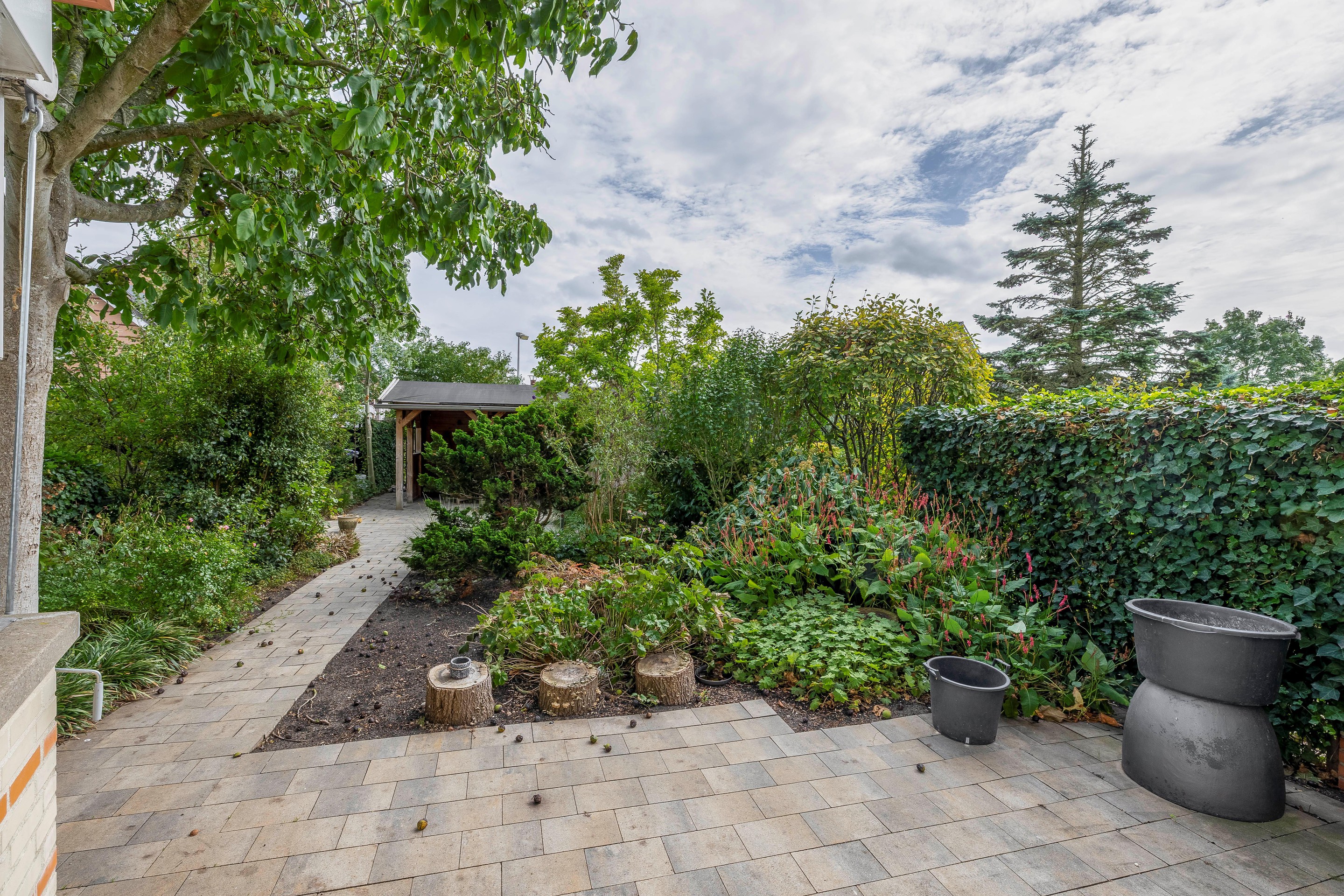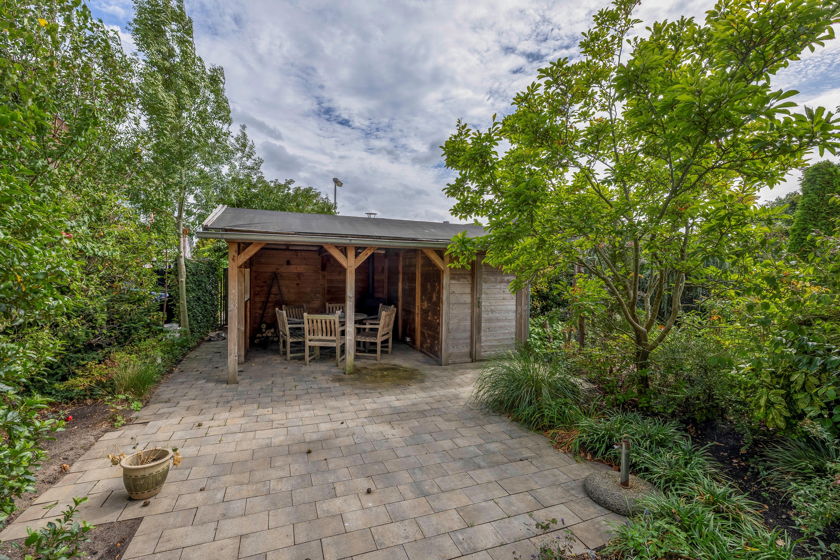 Tuin De achtertuin is (zuid)oost gericht en keurig aangelegd. Er zijn meerdere zitplekken, afgewisseld met groen waardoor de tuin een sfeervol geheel vormt. Aan de achtergevel is een zonnescherm aanwezig en de keukenramen zijn voorzien van screens. Ook is er een buitenkraan. Achter in de tuin staat een ruime houten schuur met veranda en elektra. Achter de schuur is plek voor o.a. afvalcontainers, netjes uit het zicht.
