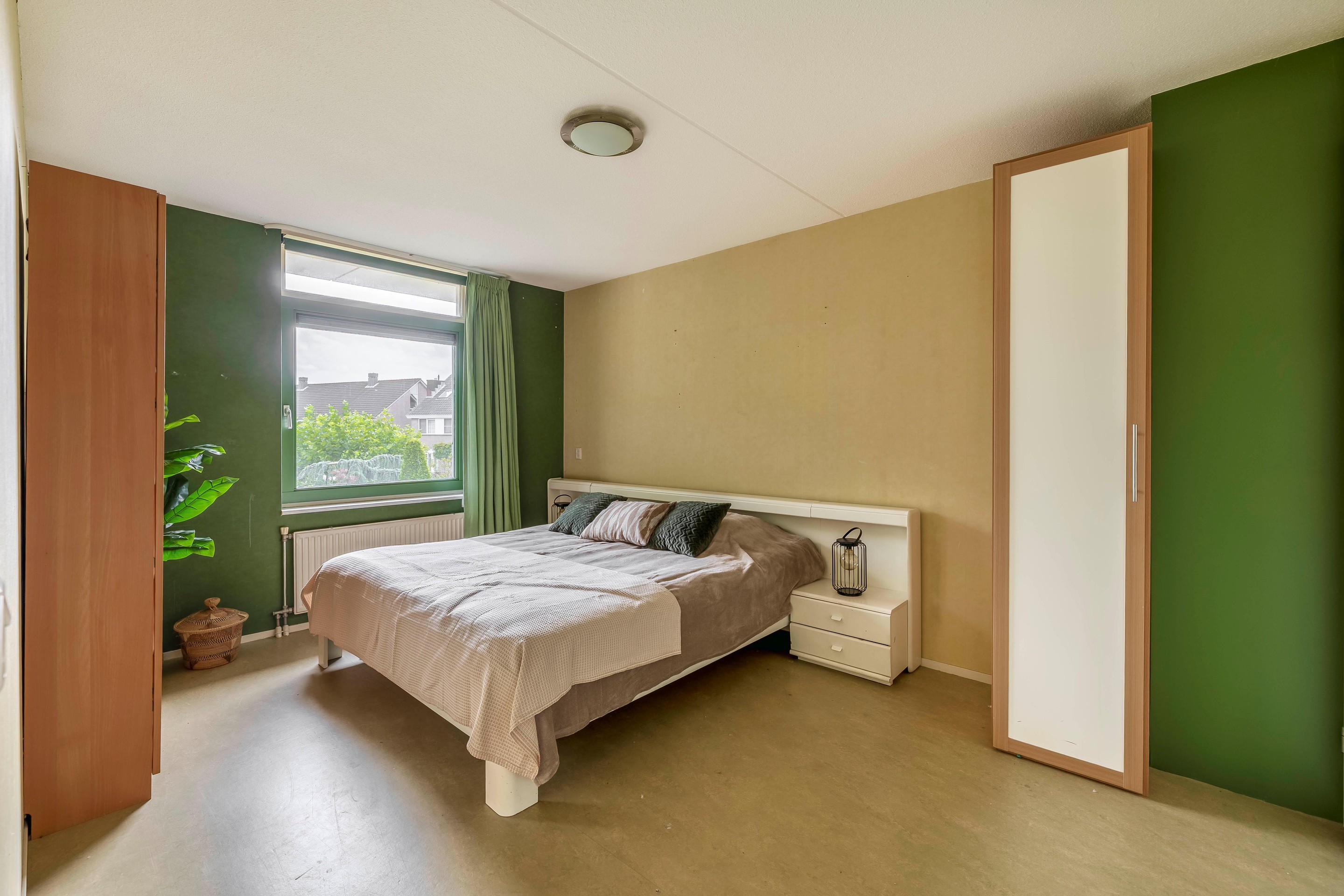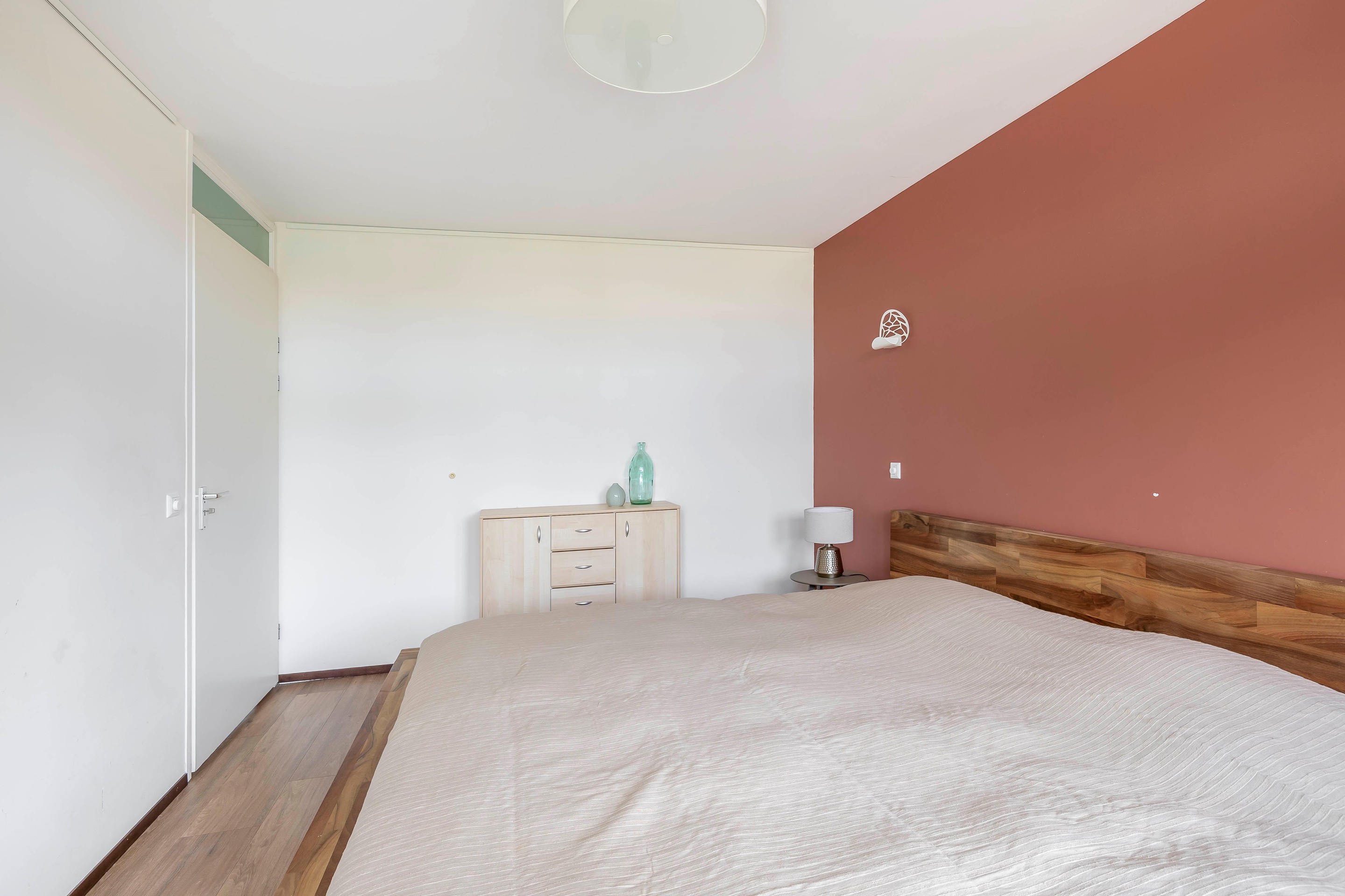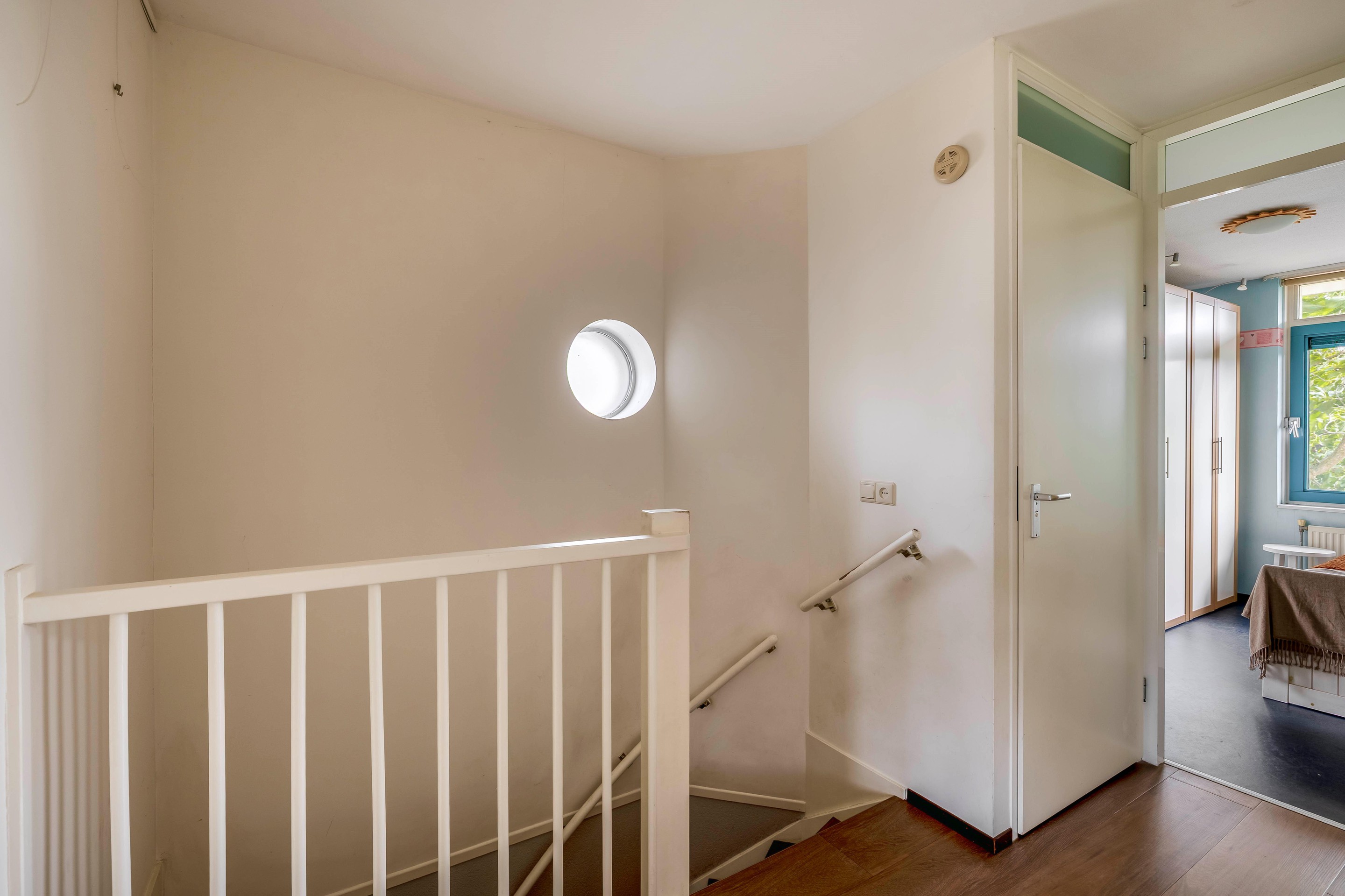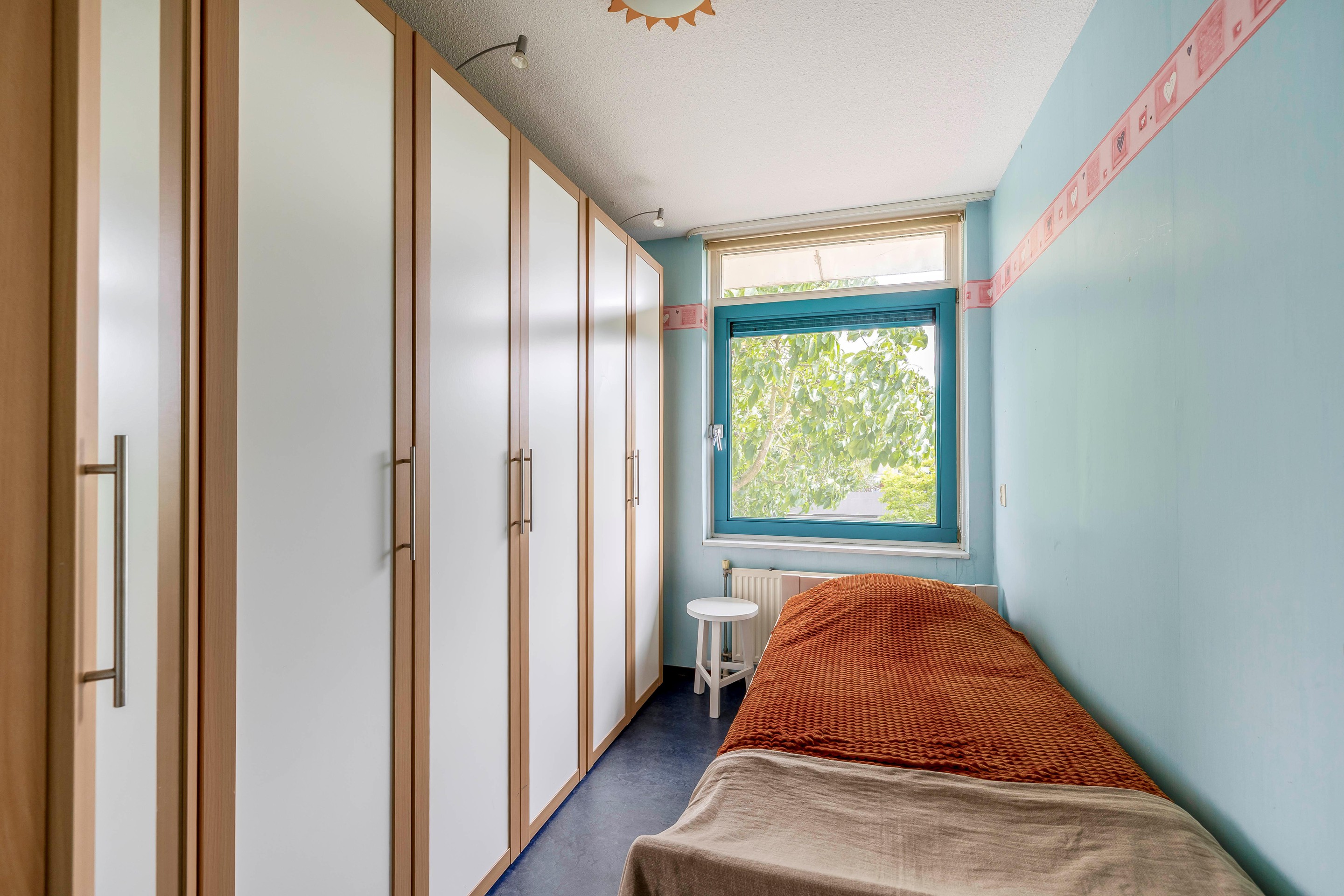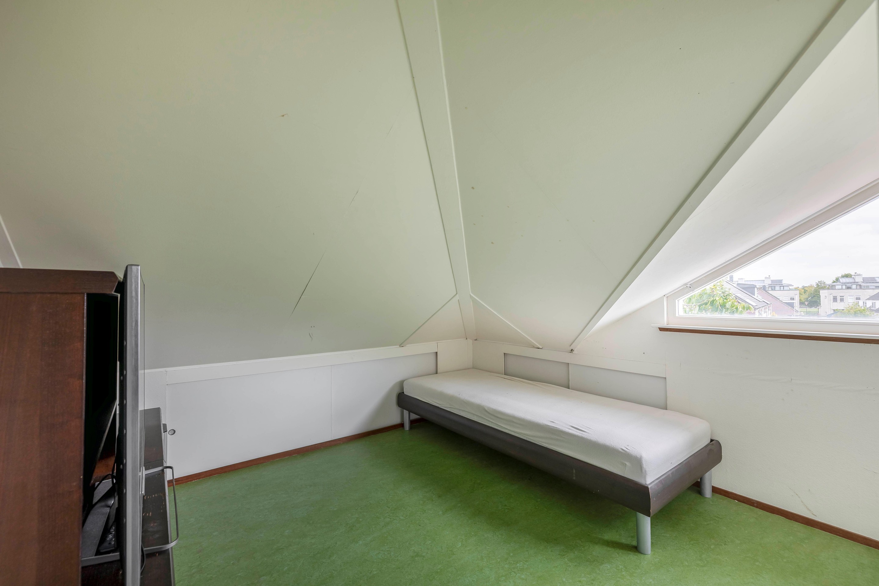Eerste verdieping Op de eerste verdieping zijn drie slaapkamers. De slaapkamer aan de voorzijde is netjes afgewerkt, voorzien van een laminaatvloer en biedt via openslaande deuren toegang tot een klein balkon. De beide slaapkamers aan de achterzijde hebben een vinylvloer en vaste kasten. De grootste beschikt bovendien over een extra kast onder de trap naar de tweede verdieping. Op de overloop bevindt zich een apart toilet.