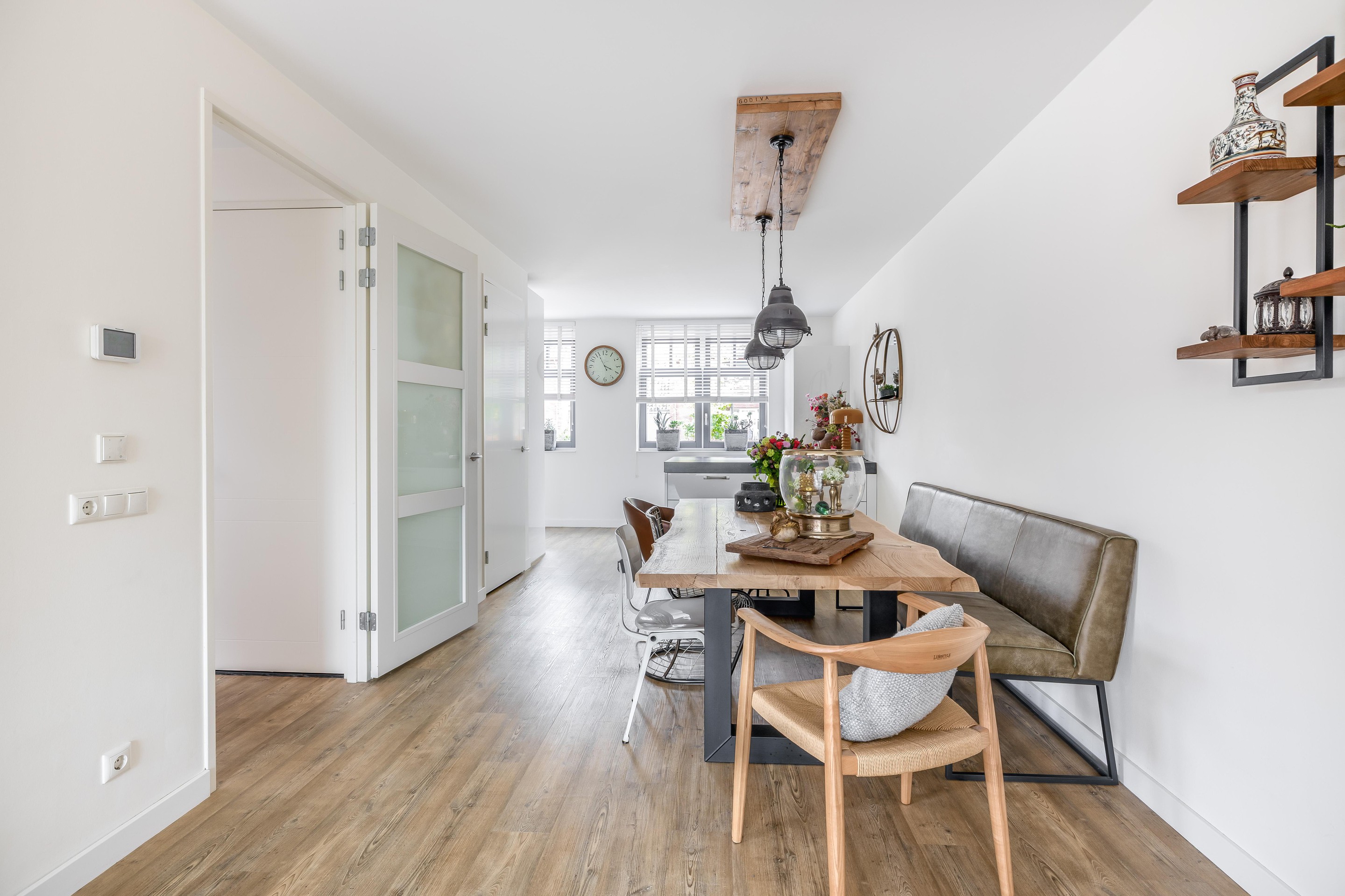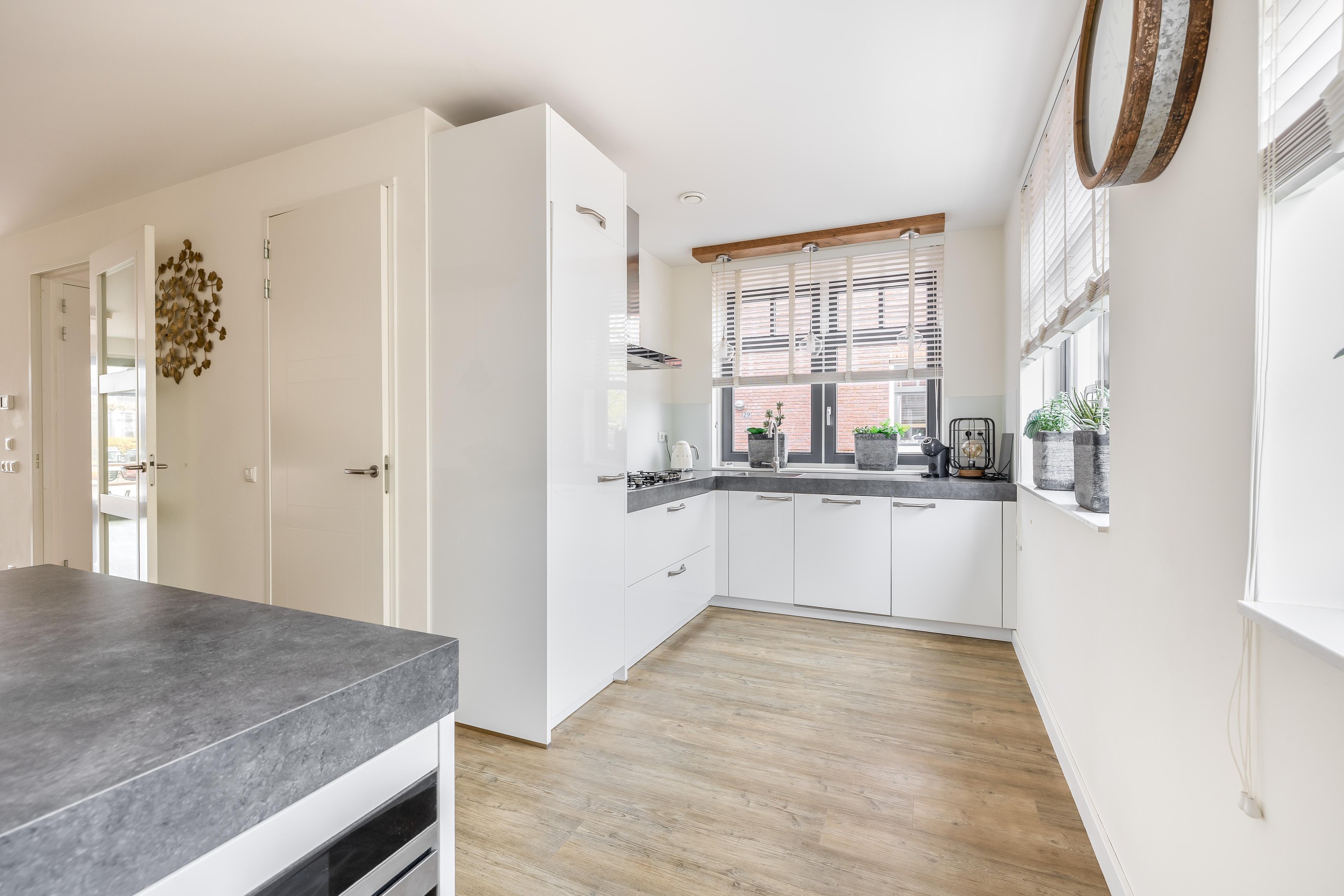 De woning ademt een fijne en rustige sfeer uit. Dit wordt versterkt door de consistente afwerking: De wanden zijn voorzien van strak renovlies behang en op elke verdieping ligt een stijlvolle, onderhoudsvriendelijke PVC-vloer. In de luxe woonkeuken aan de voorzijde komt de kwaliteit pas echt tot uiting. Deze is compleet uitgevoerd met een royaal schiereiland, hoogwaardige inbouwapparatuur en een overvloed aan kast- en werkruimte voor de kookliefhebber. Ook de badkamer en de toiletten zijn keurig afgewerkt.