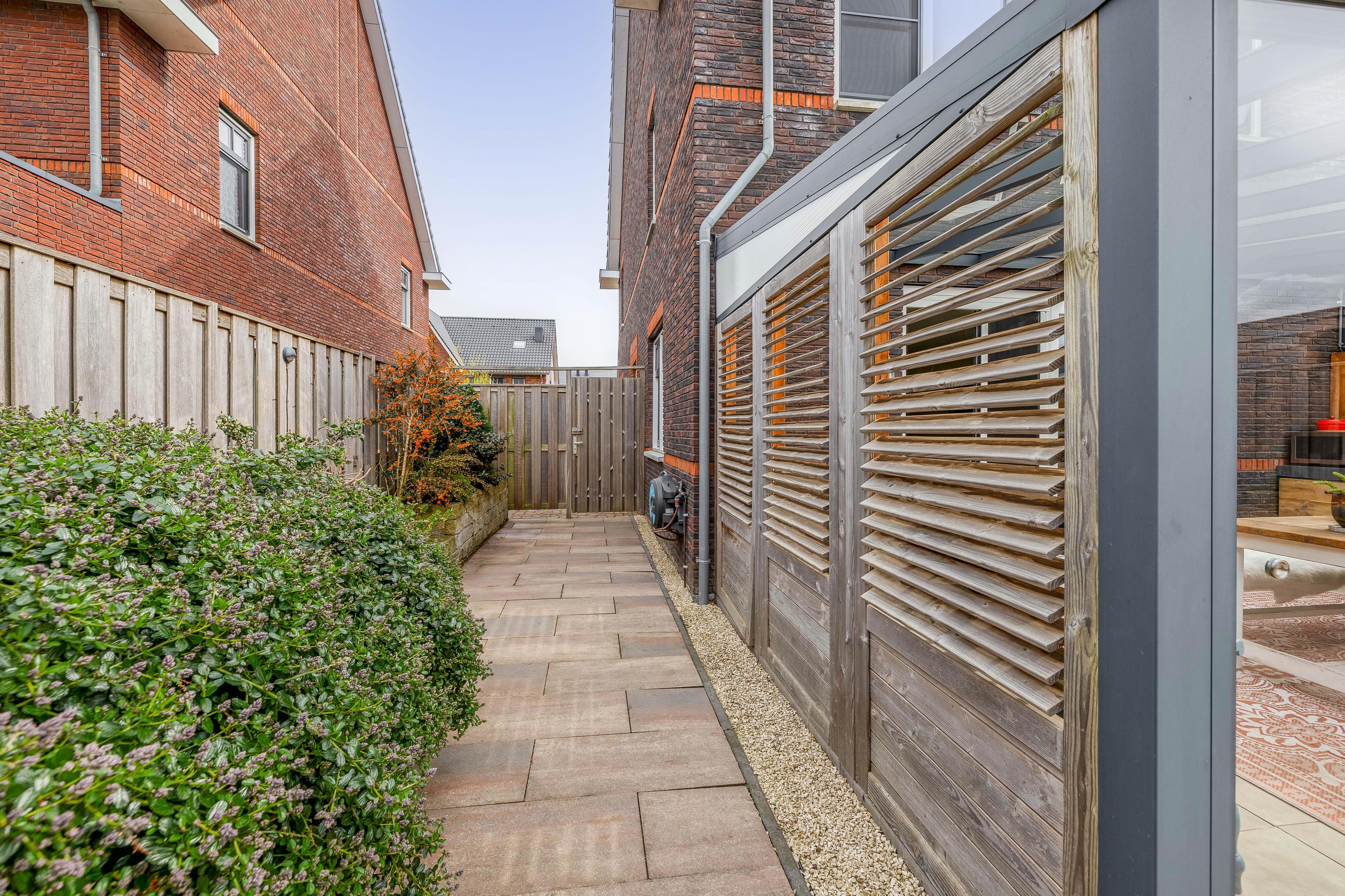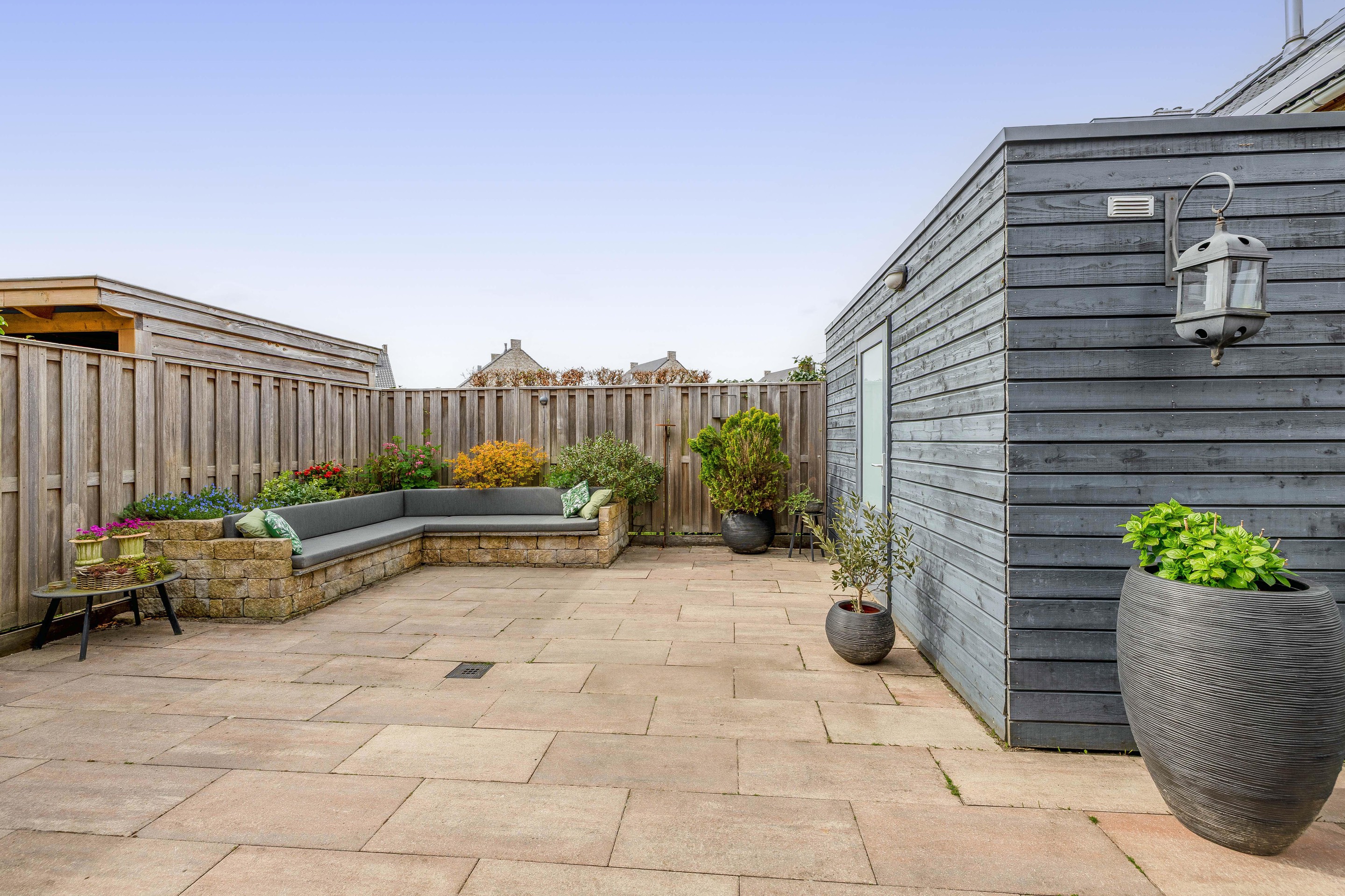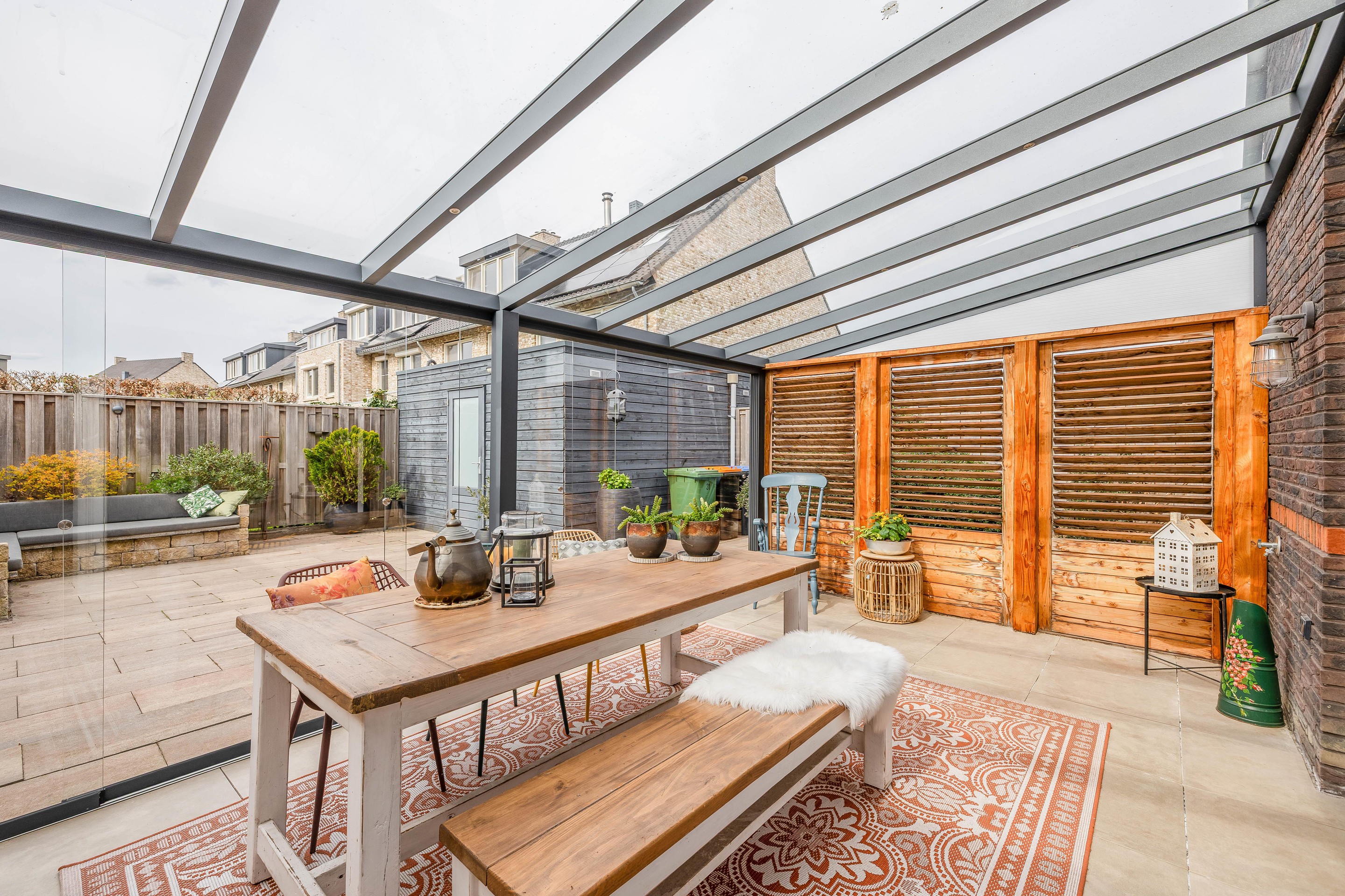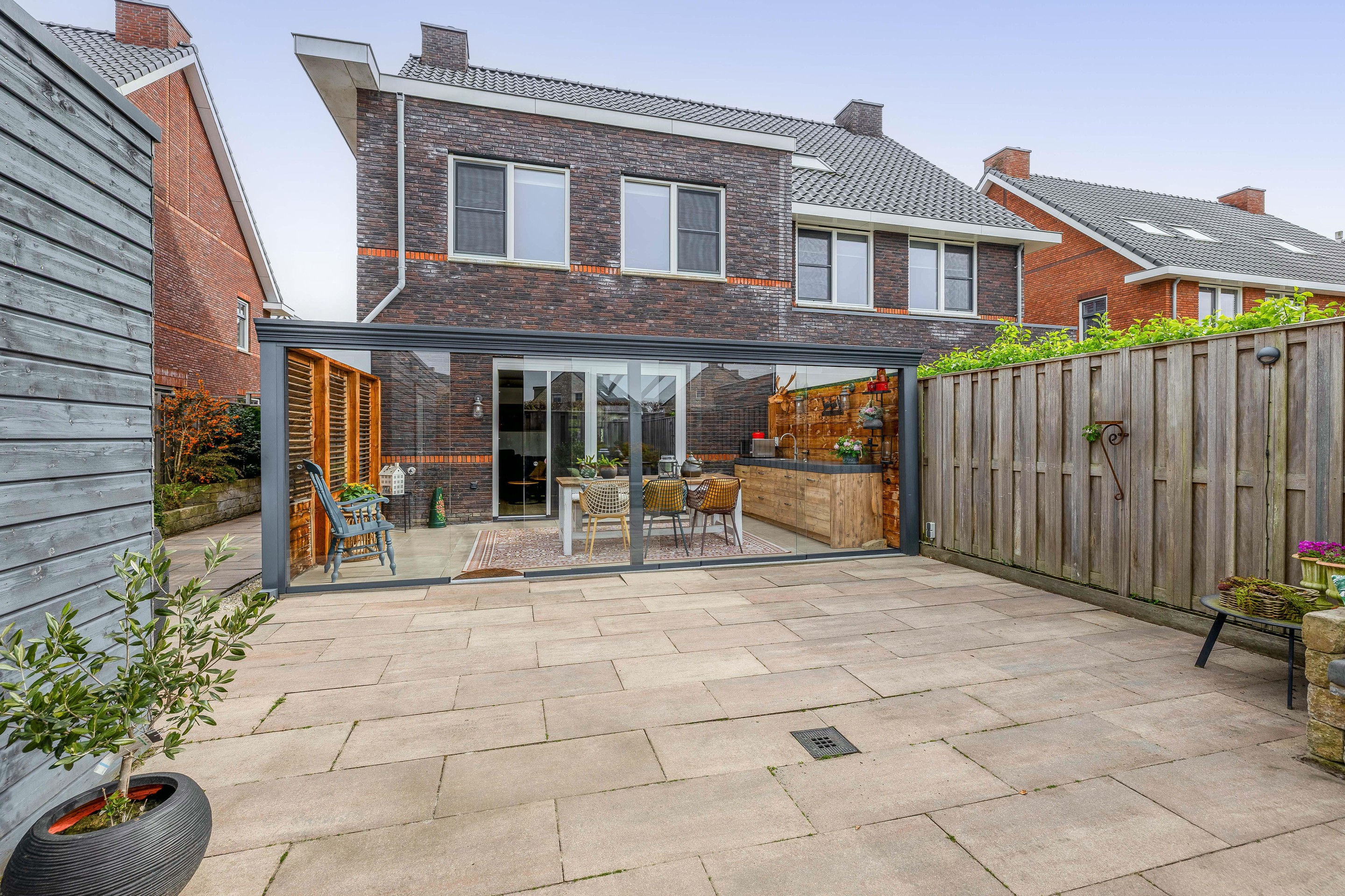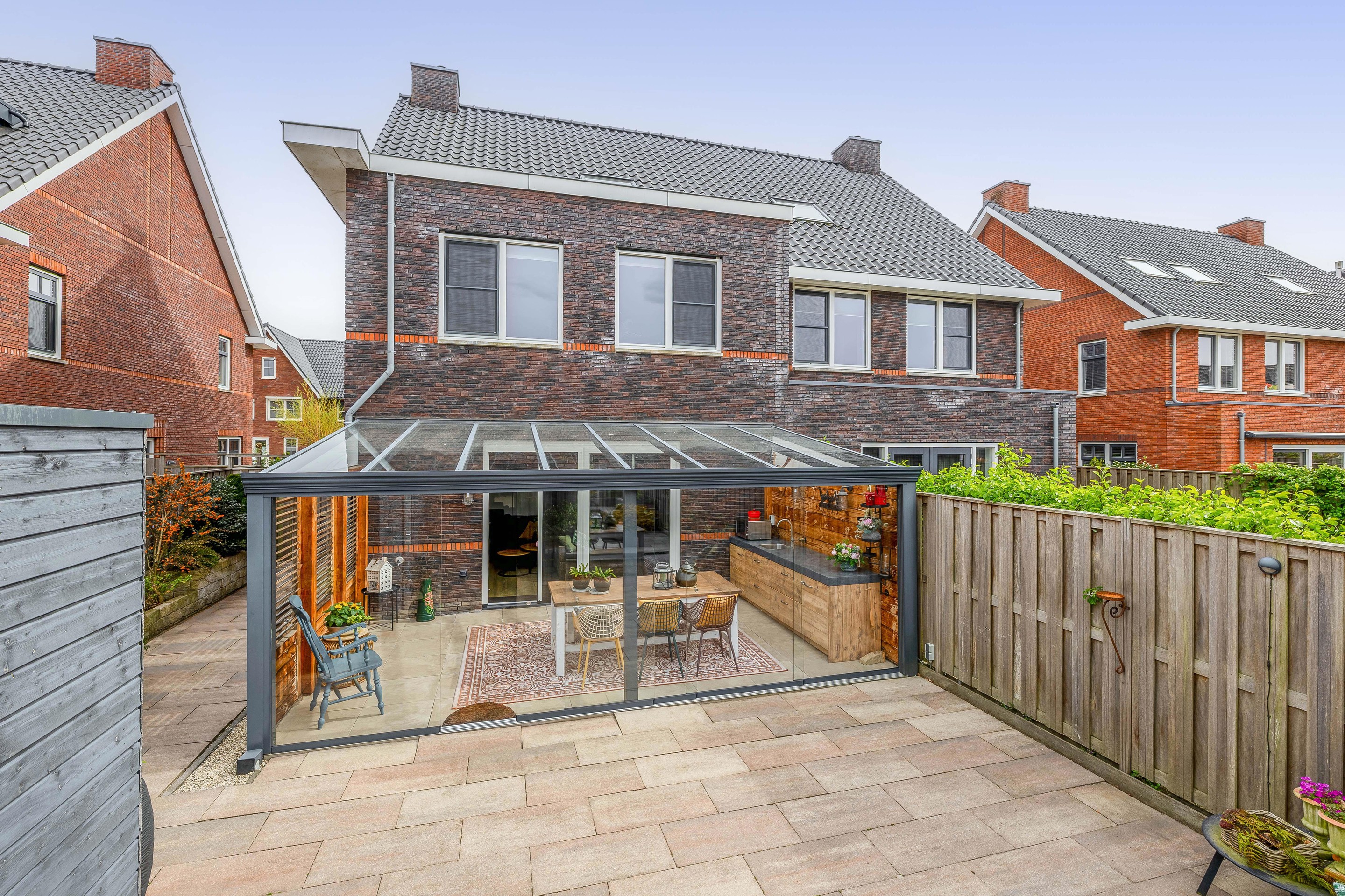 Details Tuin en parkeren: Het perceel van 265 m2 biedt een voortuin met parkeergelegenheid voor meerdere auto’s. De achtertuin is een heerlijke plek met veel privacy, een houten berging en de luxe van de glazen serre.