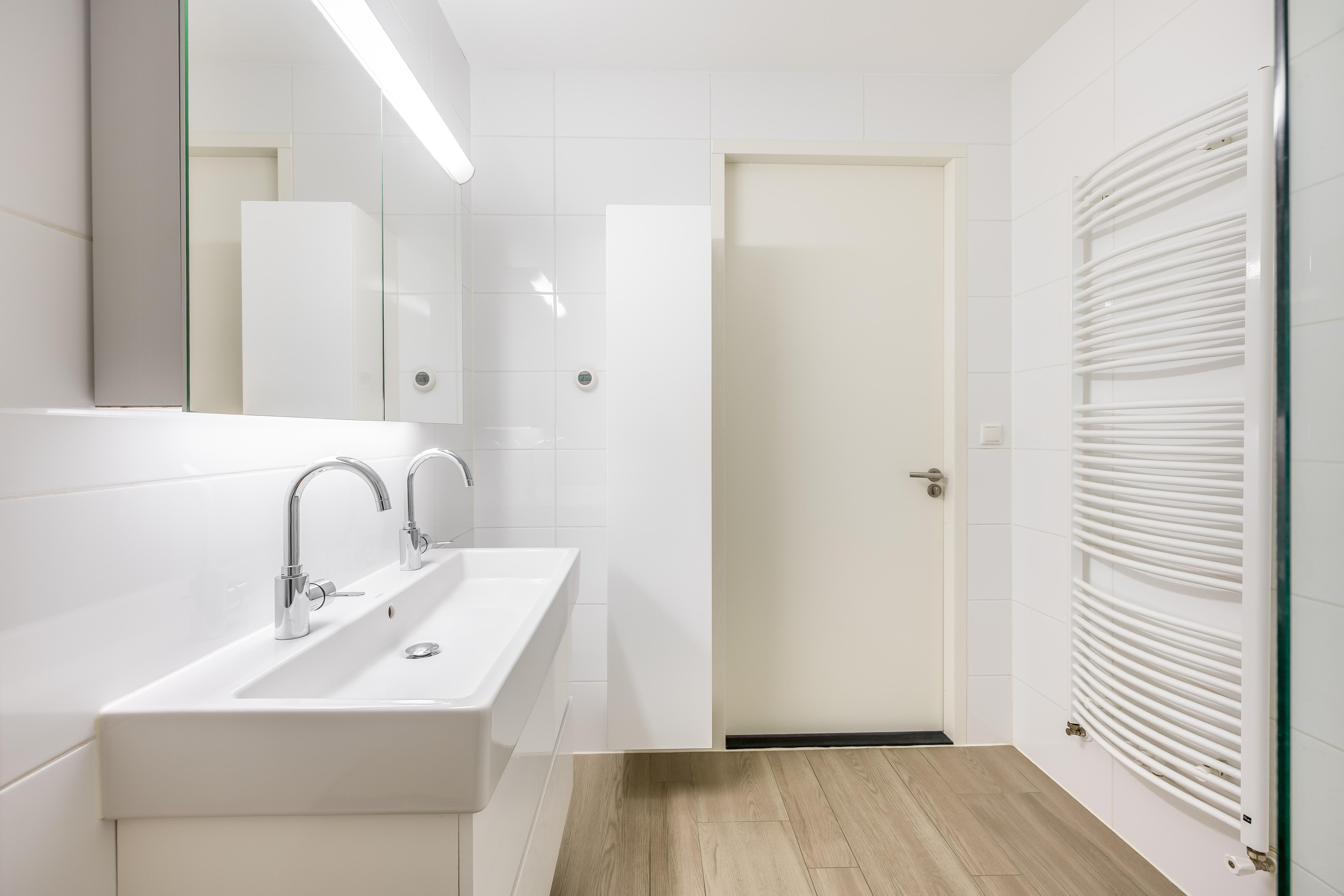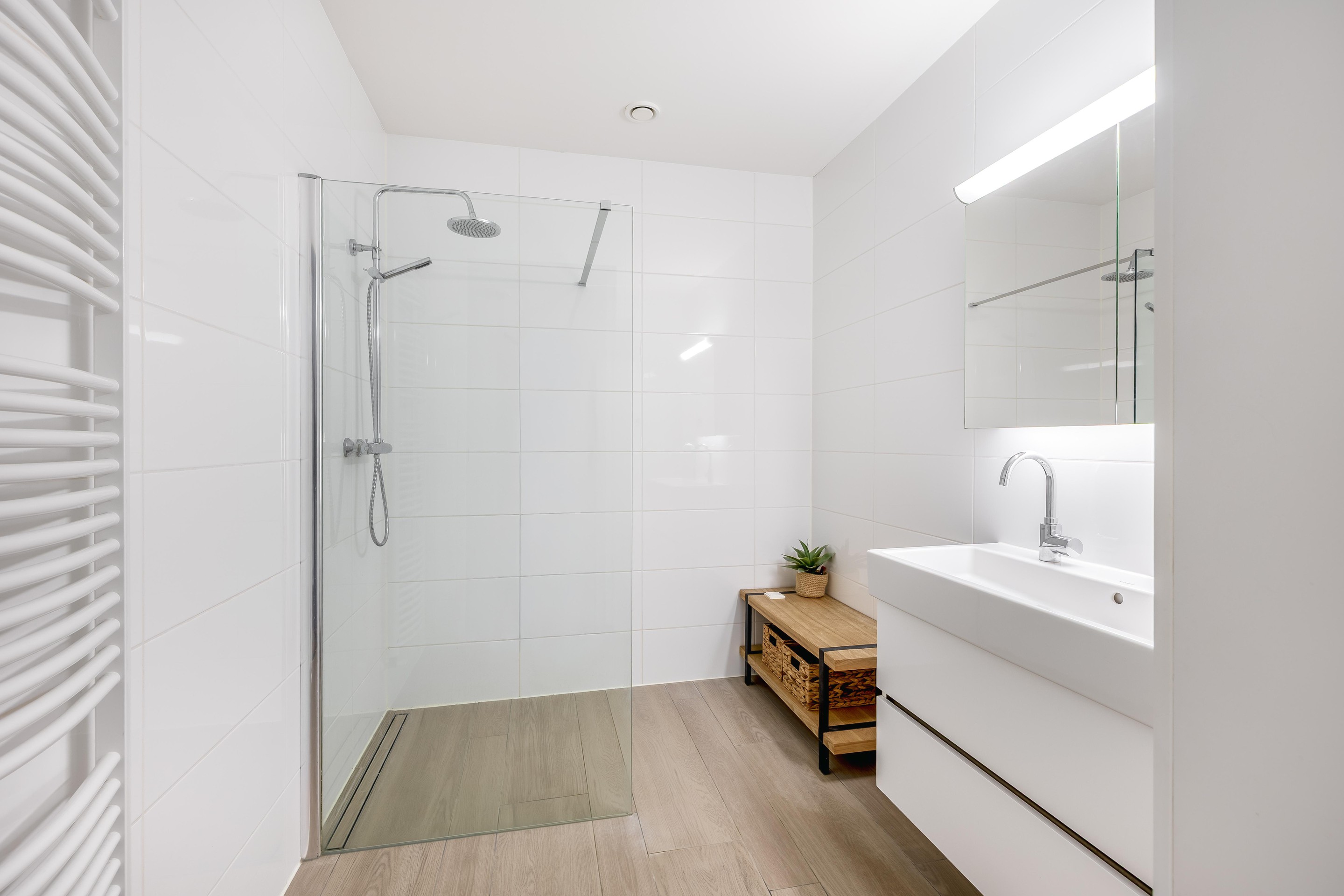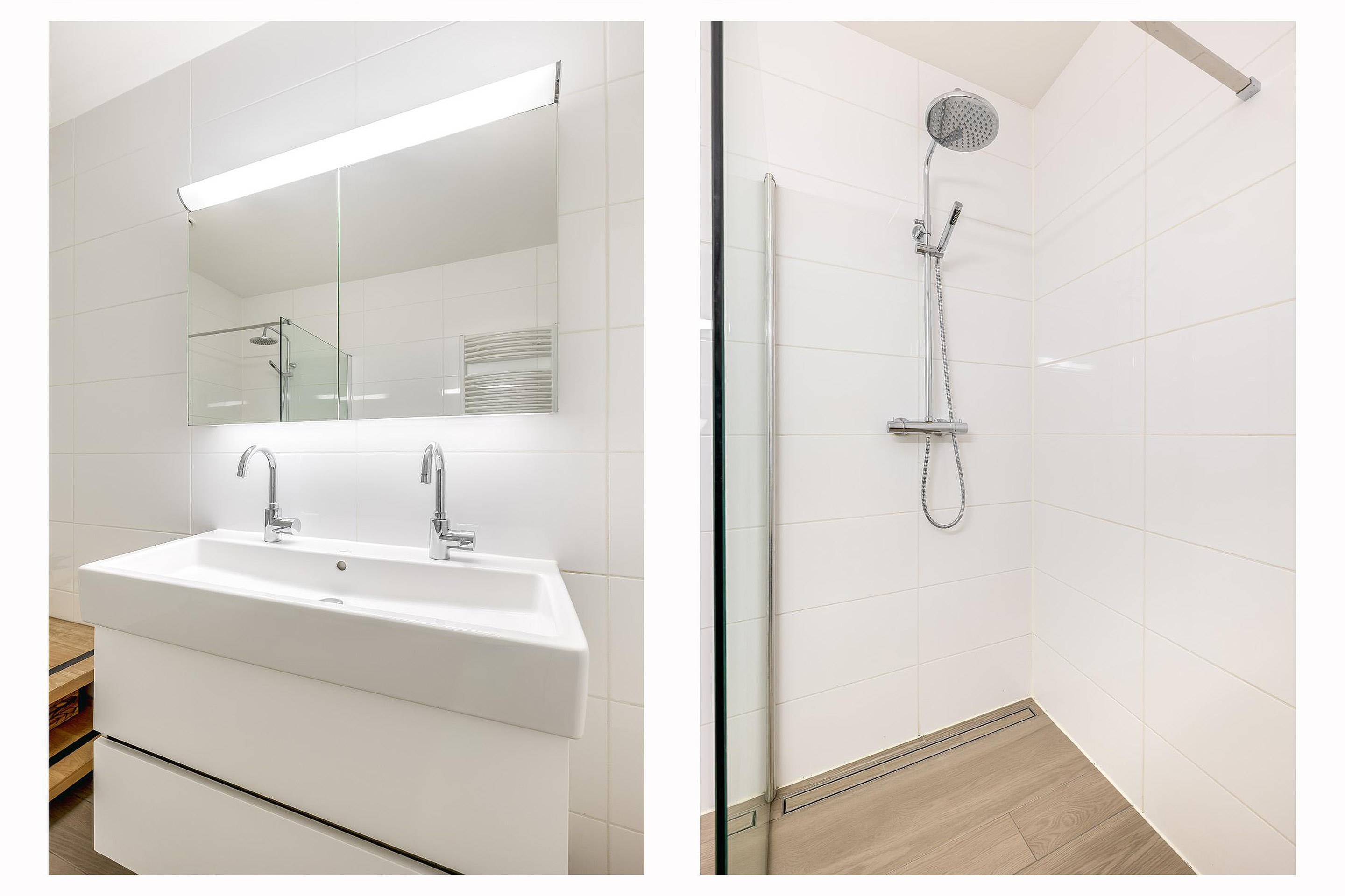 De luxe badkamer ligt centraal en is voorzien van een inloopdouche met glaswand en regendouche, evenals een breed wastafelmeubel met twee kranen.