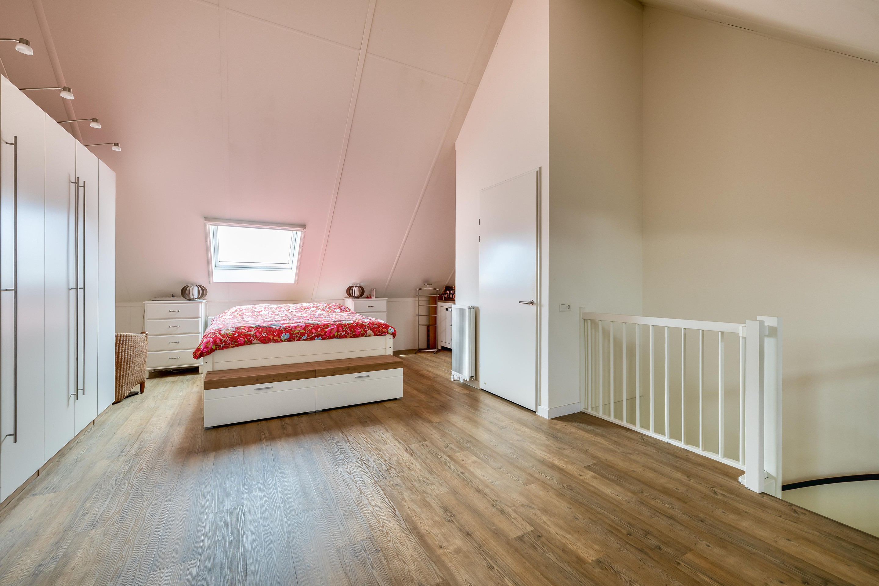Tweede verdieping Deze verdieping is verrassend groot en licht door de karakteristieke tuitgevel. De ruimte is momenteel vrij indeelbaar, maar biedt met gemak ruimte voor twee extra slaapkamers of een riante werkplek. Tevens vindt u hier de praktische wasruimte en extra opbergruimte achter de knieschotten.