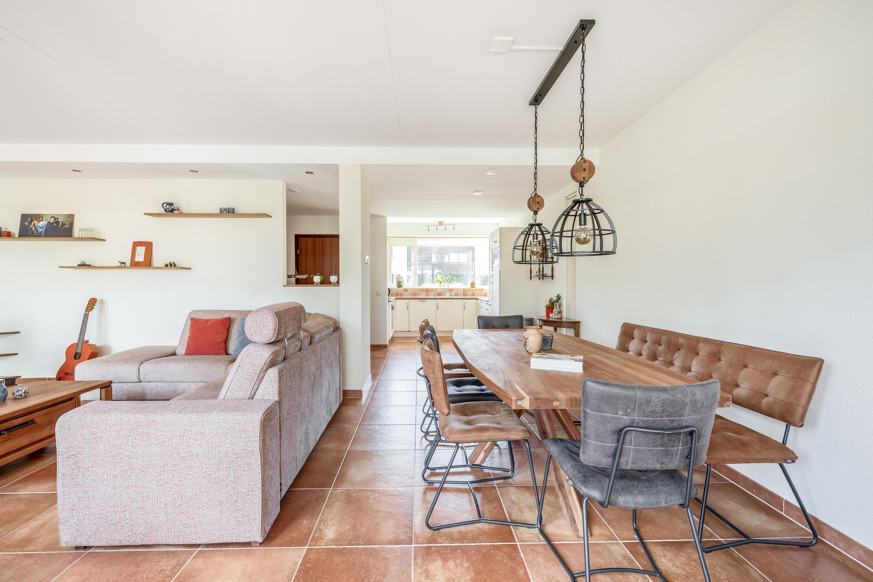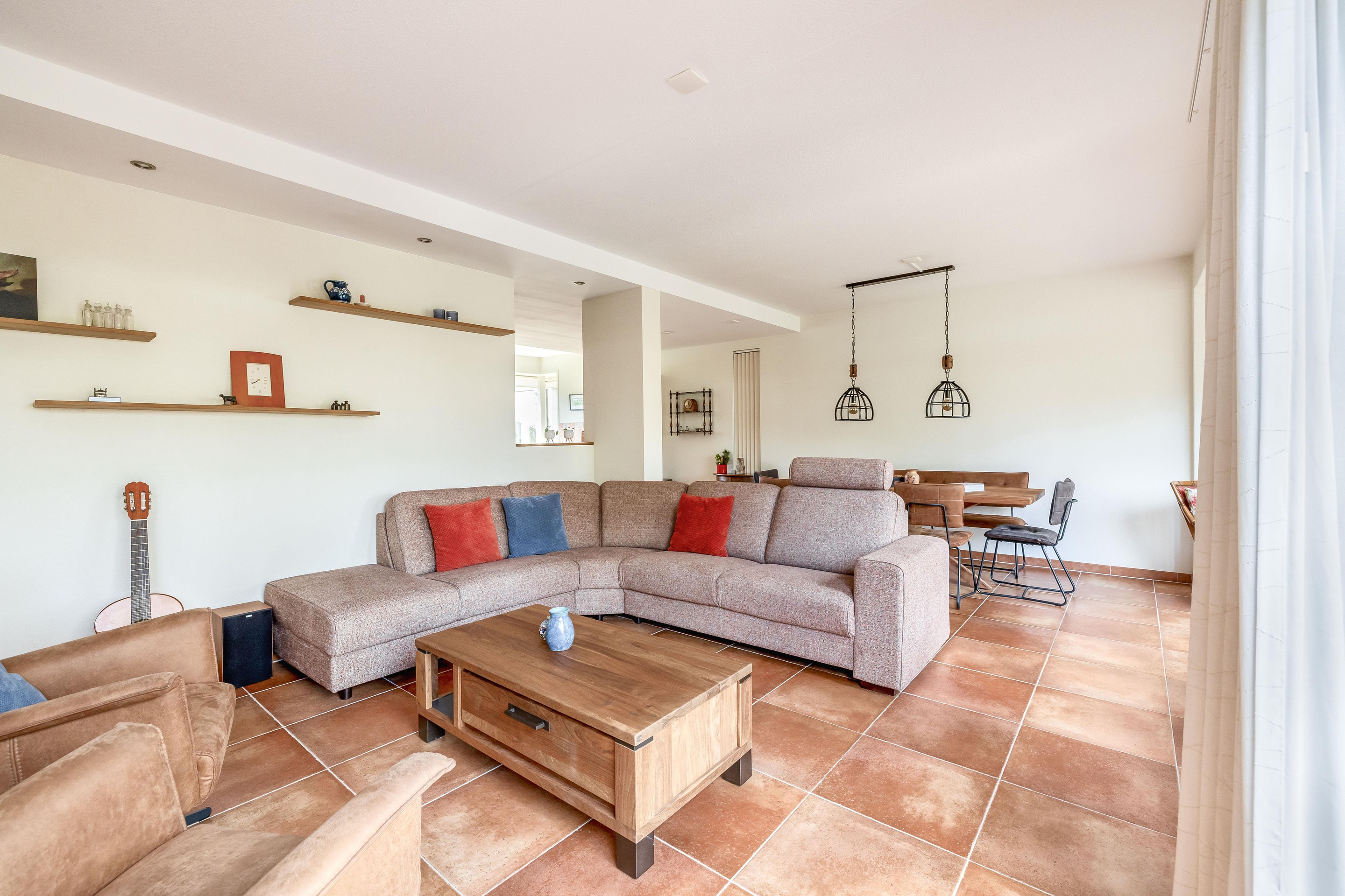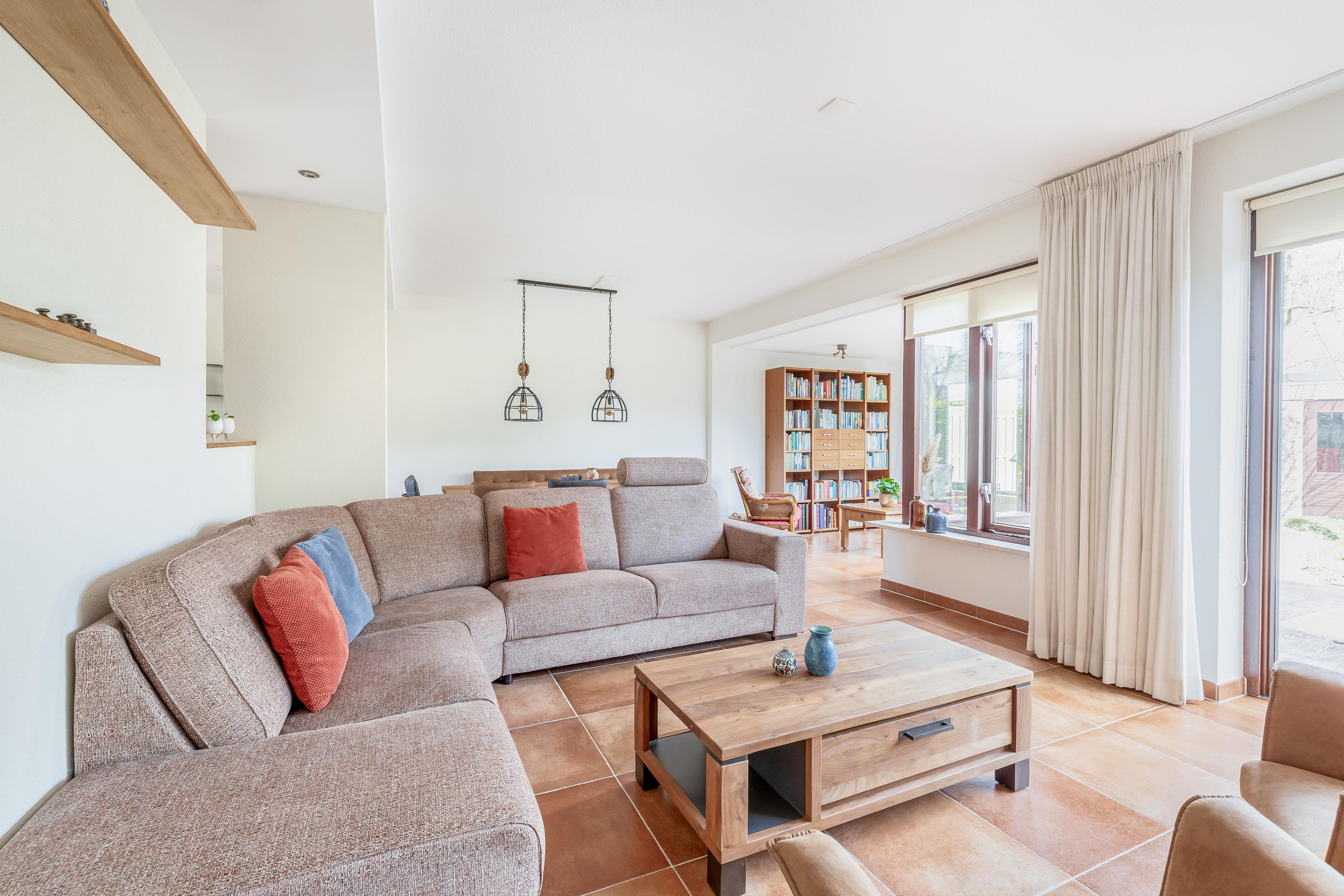 De woonkamer biedt royaal plaats aan een grote zithoek en flink formaat eettafel. Ideaal voor een groter gezin of bij ontvangst van gasten. Er is veel lichtinval in de woning, doordat er veel ramen aanwezig zijn. Er is toegang tot de tuin via een schuifpui of door een deur in de aanbouw.