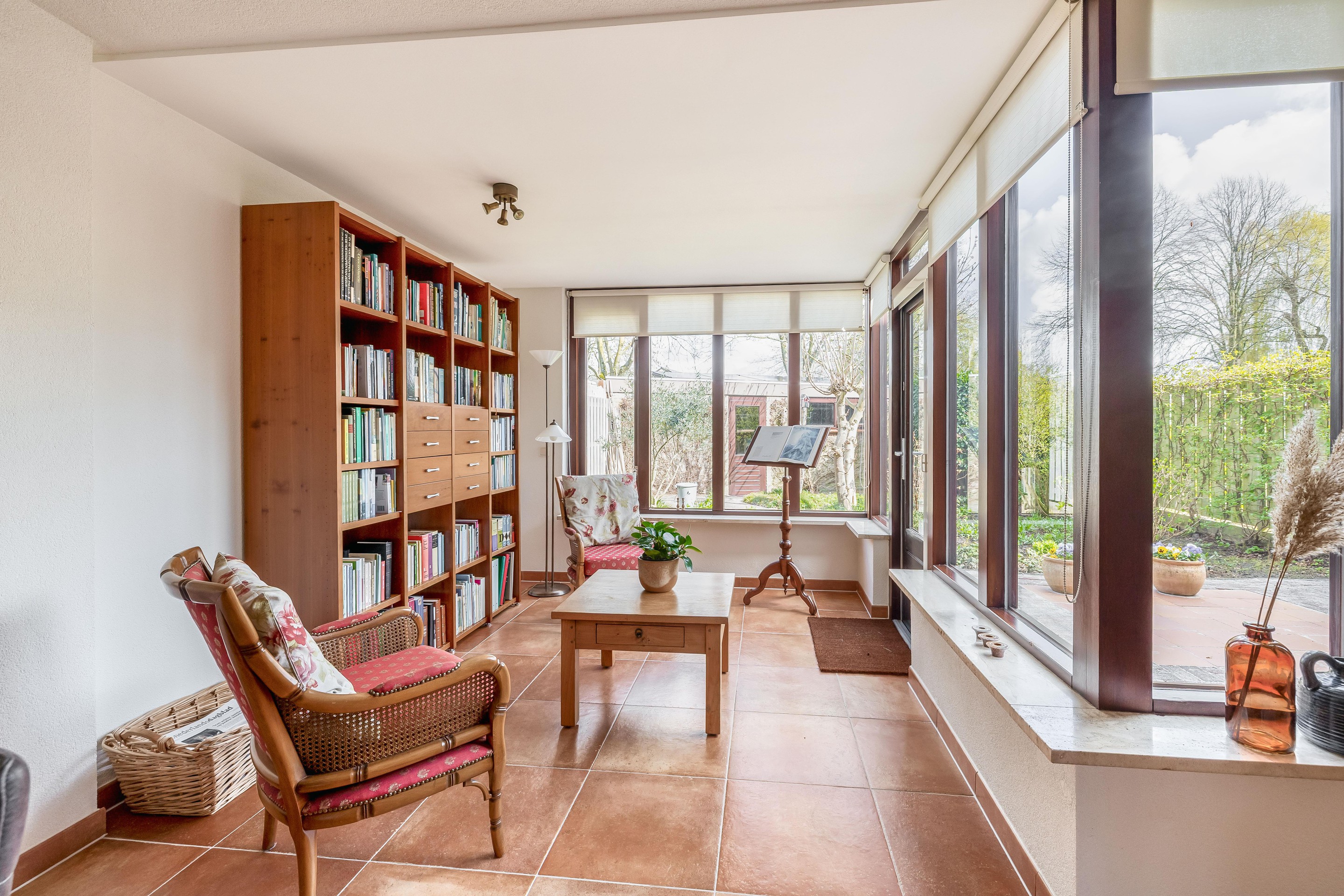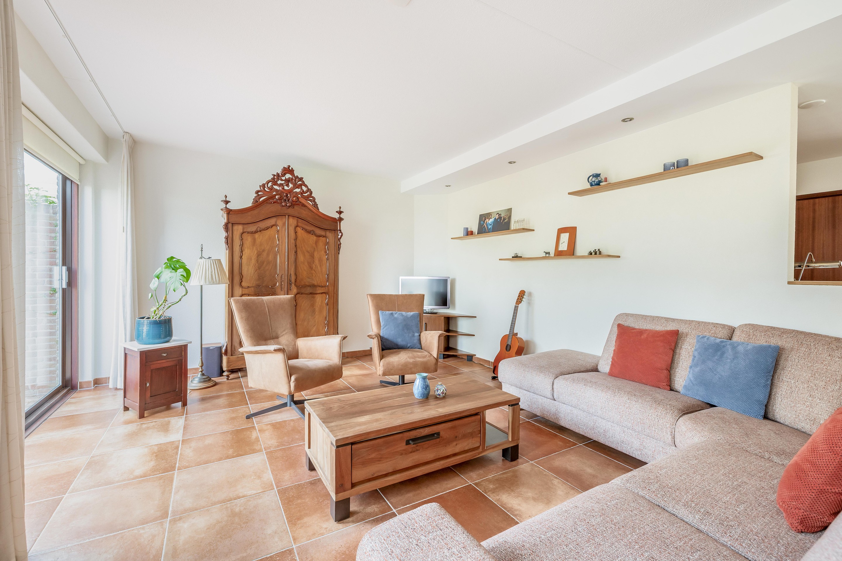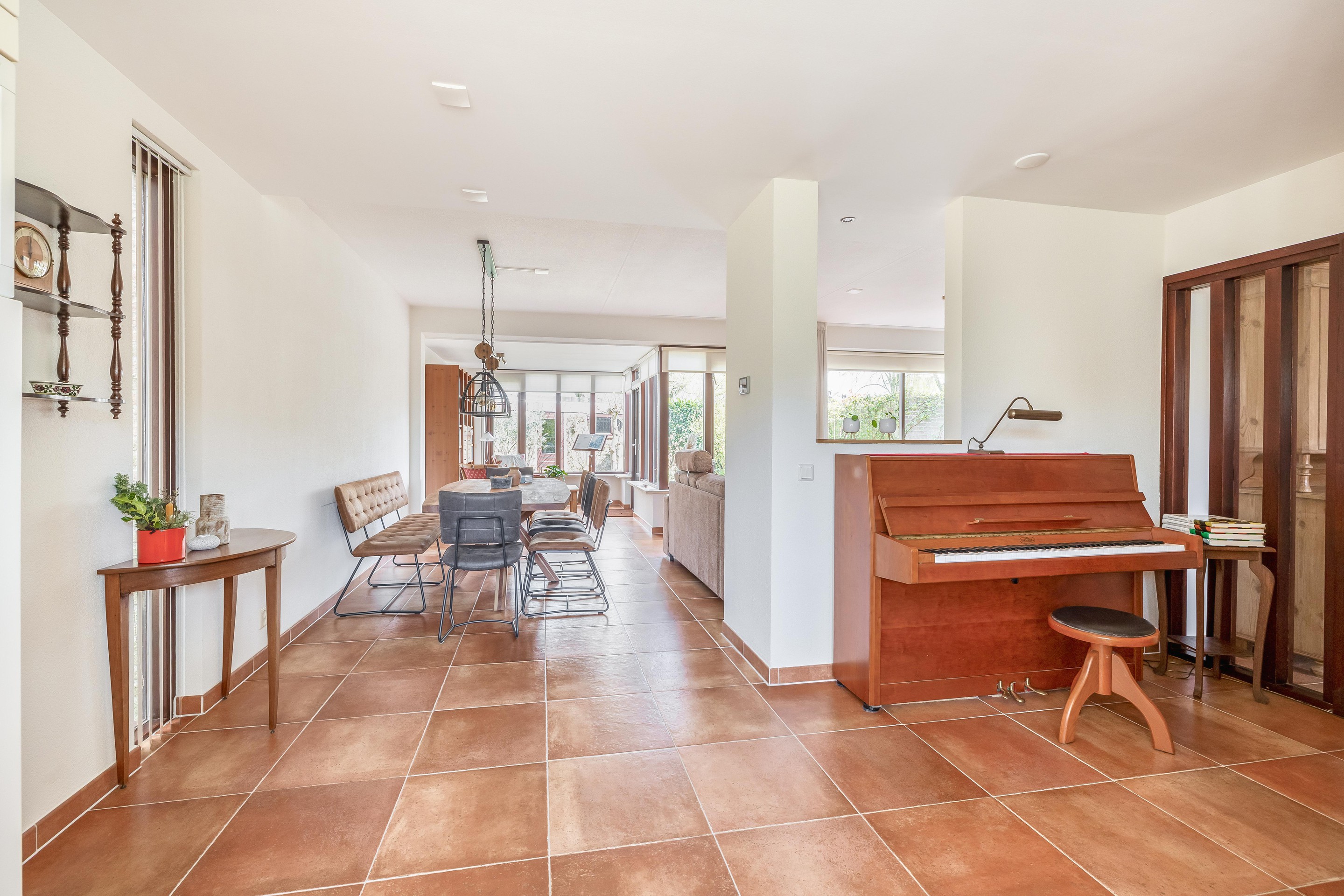 De woonkamer biedt royaal plaats aan een grote zithoek en flink formaat eettafel. Ideaal voor een groter gezin of bij ontvangst van gasten. Er is veel lichtinval in de woning, doordat er veel ramen aanwezig zijn. Er is toegang tot de tuin via een schuifpui of door een deur in de aanbouw.