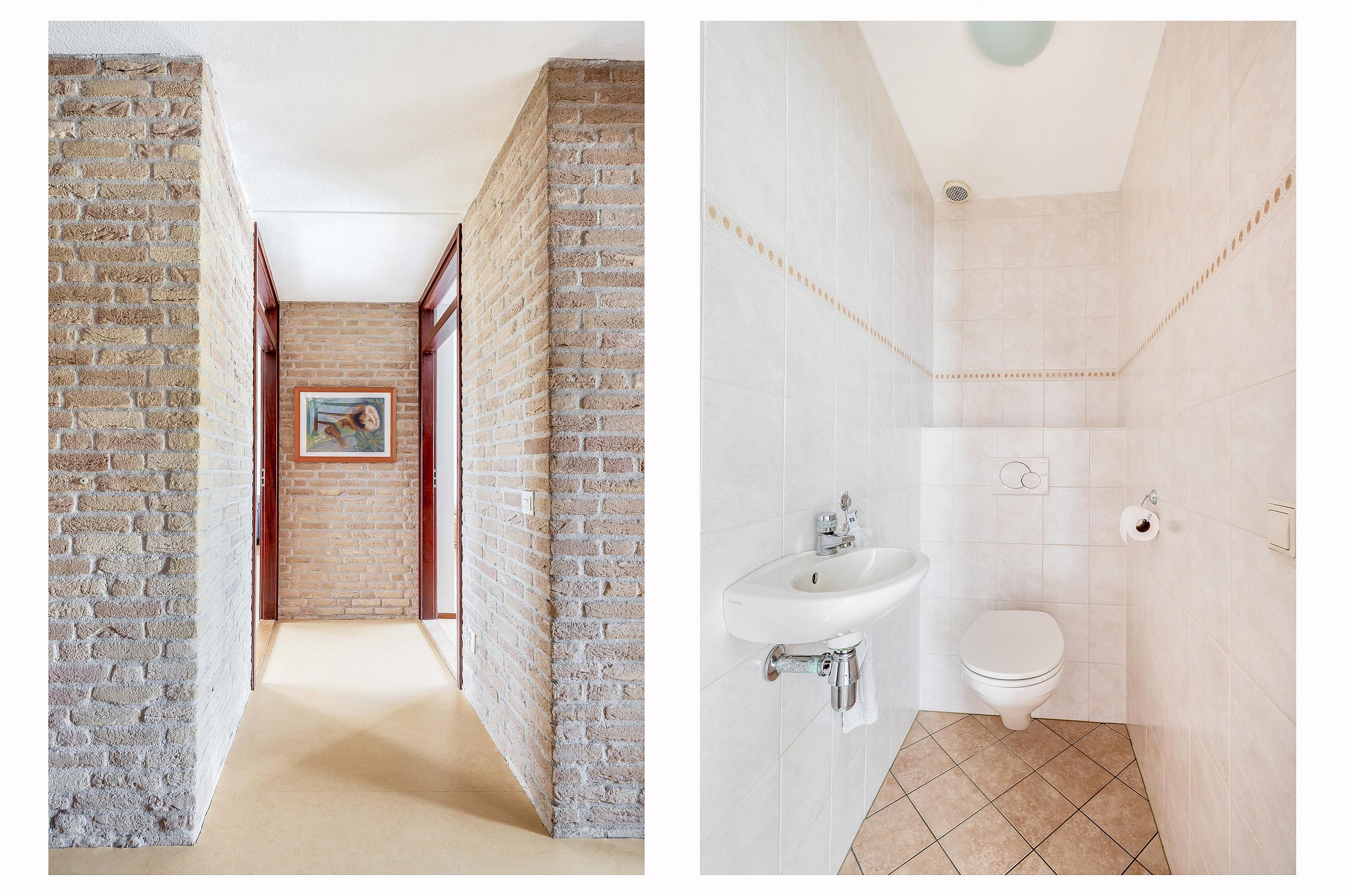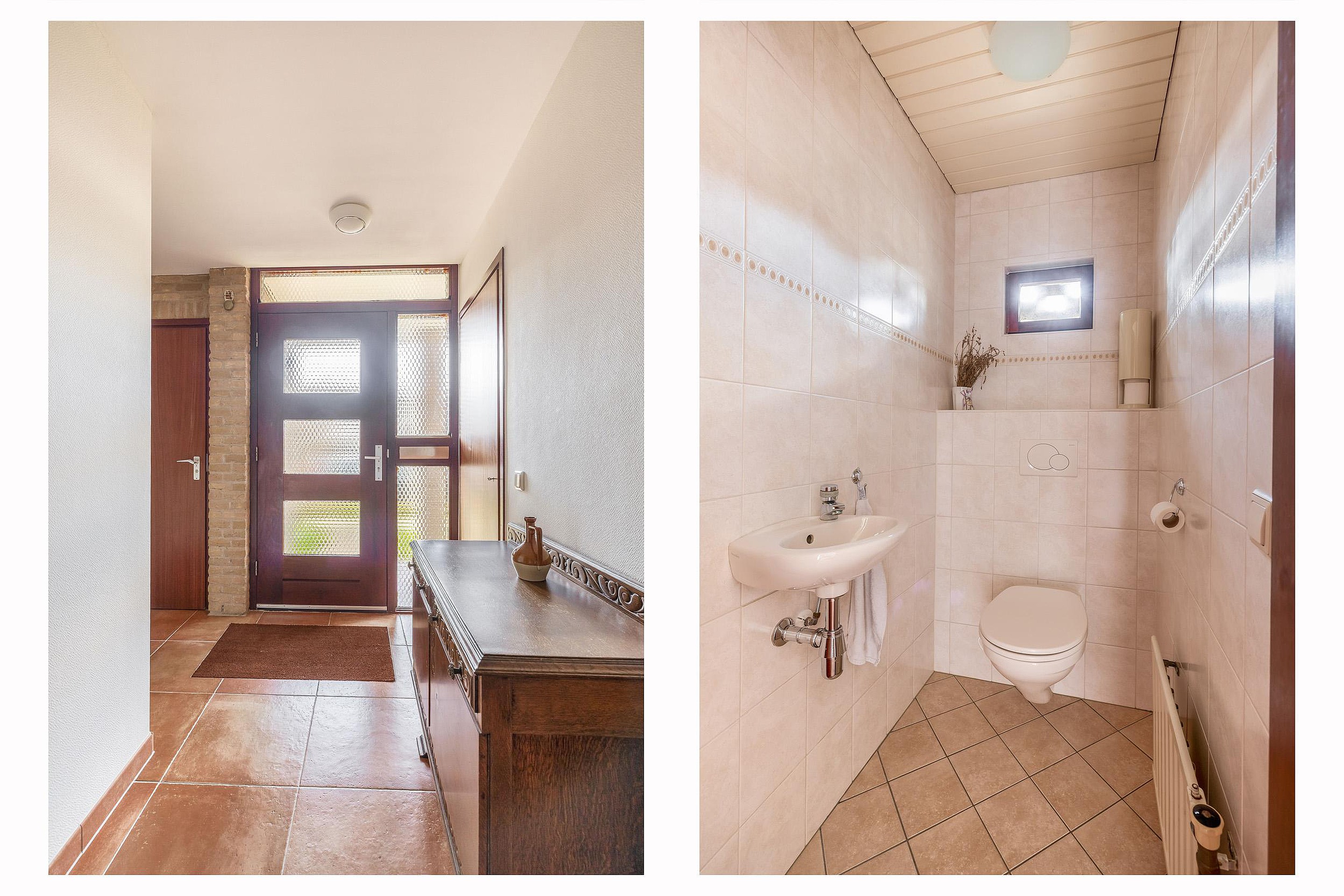 Begane grond Je komt deze woning binnen in een royale hal. Er is een aparte nis om jassen uit het zicht een plek te geven. De aanwezige meterkast is voorzien van een moderne, zeer uitgebreide groepenkast. Het toilet bevindt zich direct naast de voordeur en is geheel betegeld, voorzien van vrij hangend closet en een fontein.