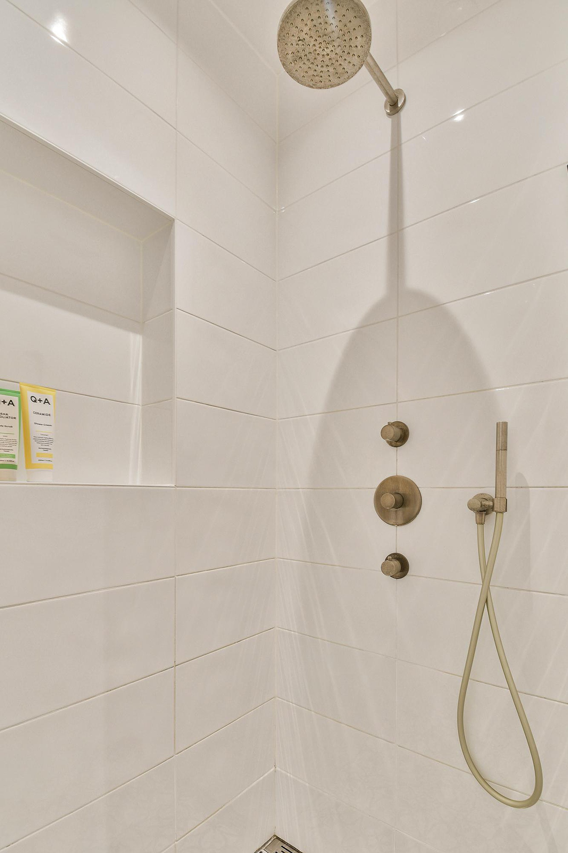Badkamer, met dubbele wastafel en badkamermeubel, zwevend toilet en ruime inloop regendouche.