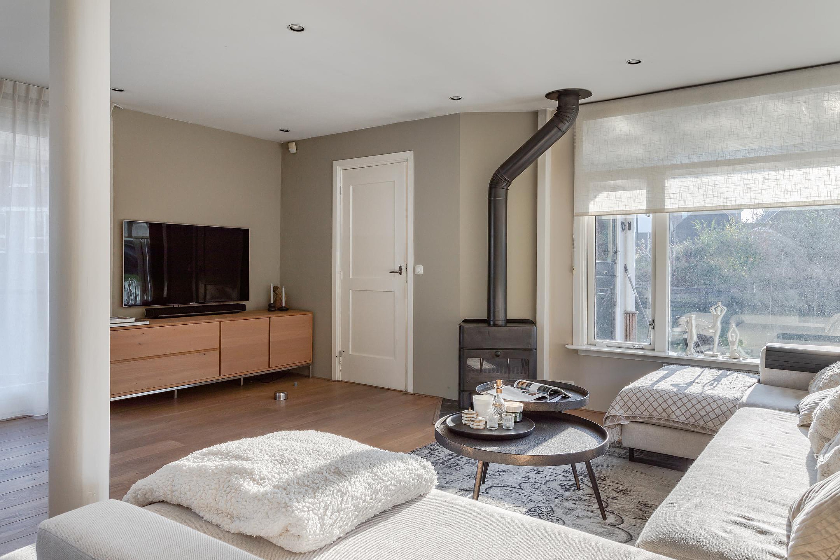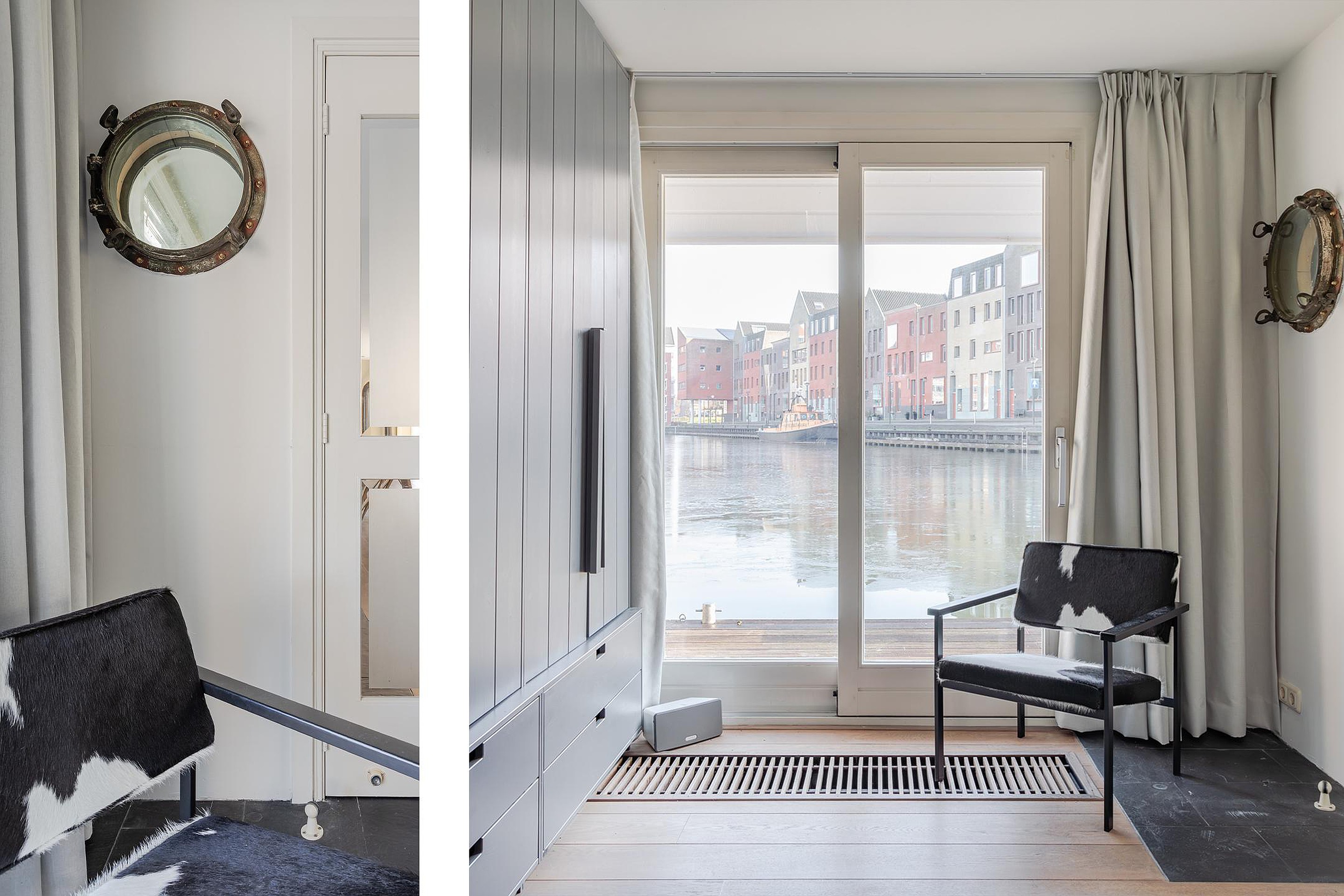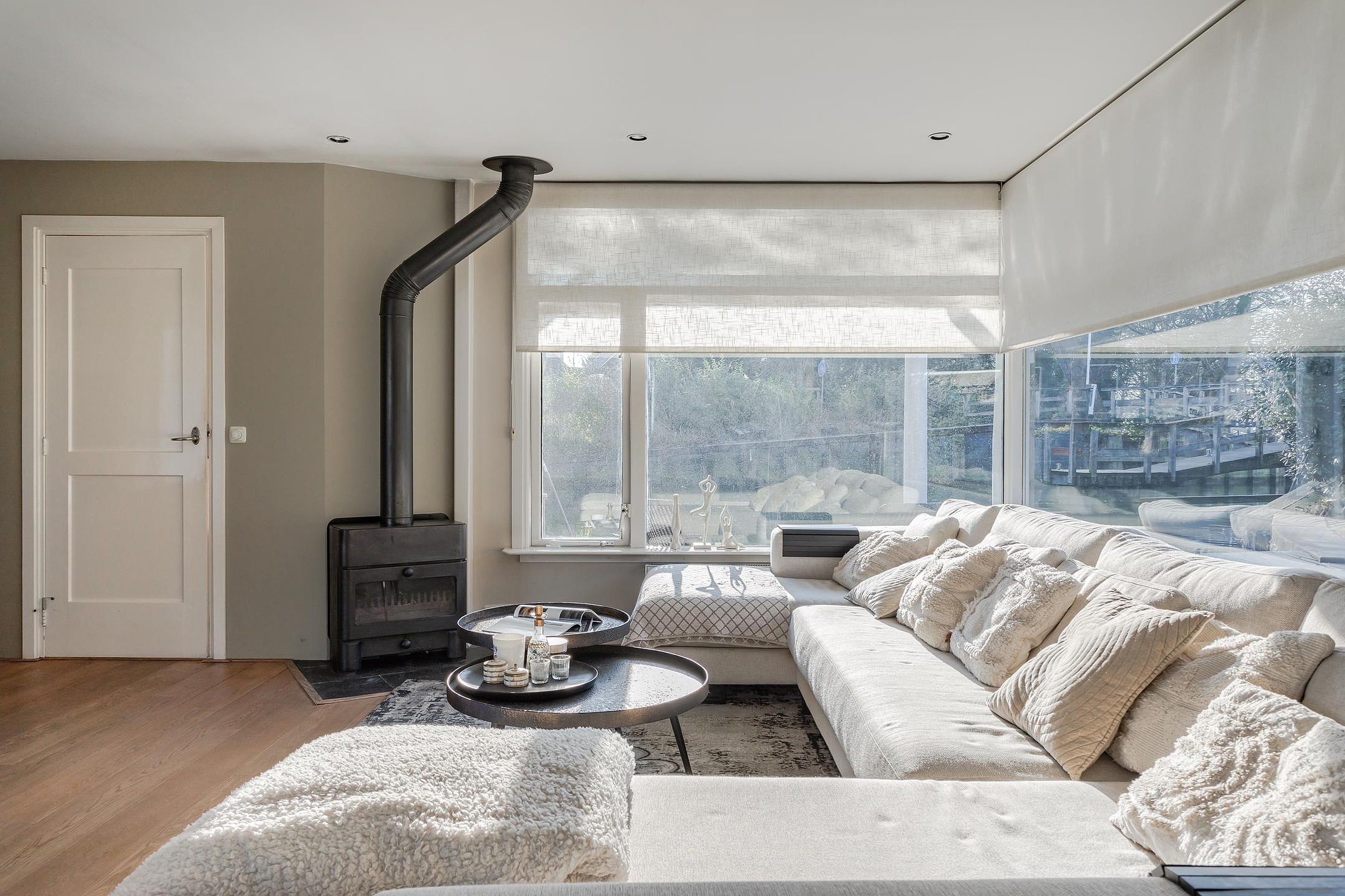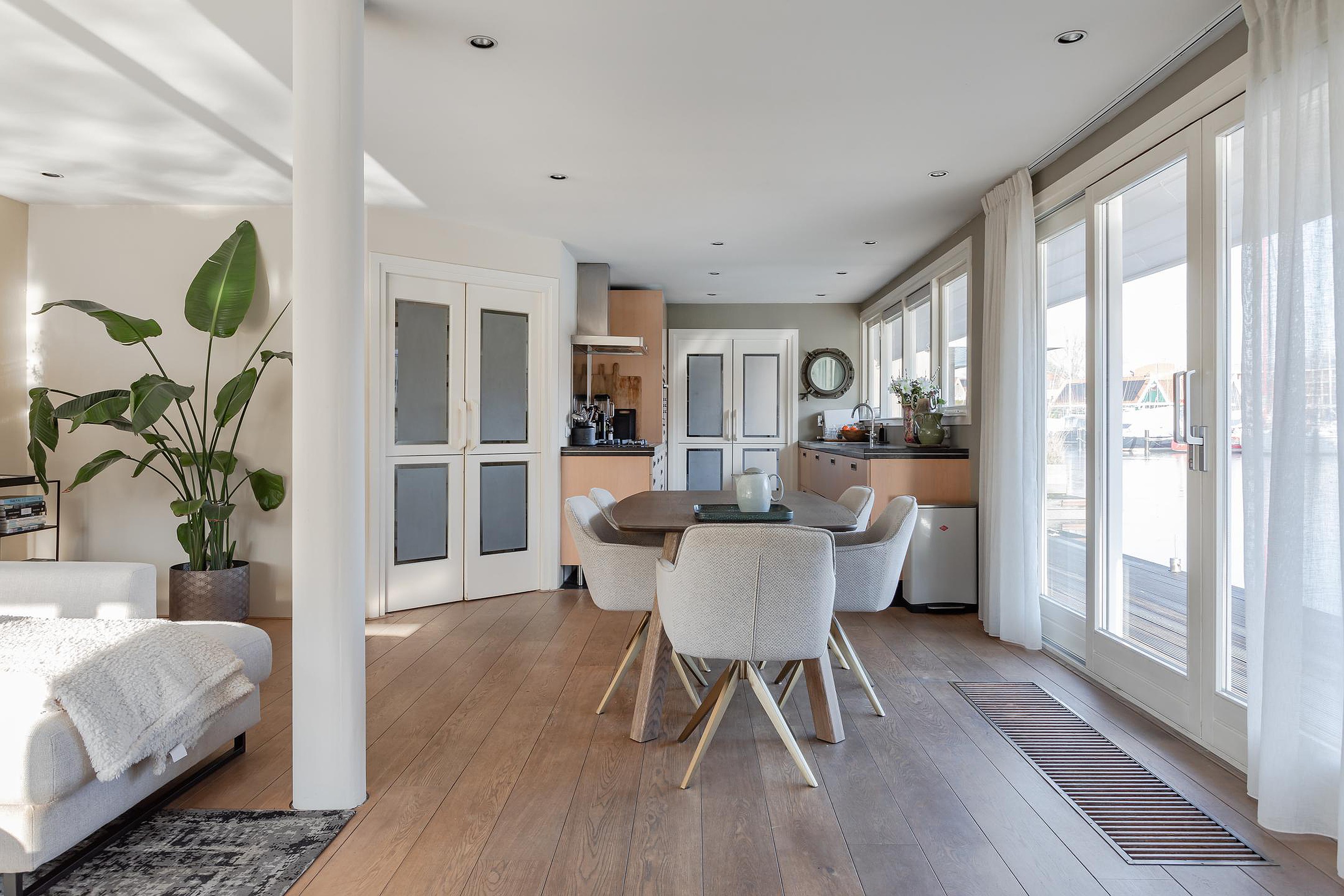 Royale living met veel lichtinval en vanuit alle ramen zicht op de gezellige binnenhaven aan de Karperkuil. Op de vloer ligt een eikenhouten vloer op een betonnen verdiepingsvloer, alle wanden en het plafond zijn gestuukt en inbouwspots verlichten de sfeervolle ruimte. De living wordt verwarmd door radiatoren, een convectorput bij de schuifpui en een houtkachel voor de koude winters. De schuifpui met zijramen tot aan de vloer geven toegang tot de omloop aan de waterzijde en vanaf uw bankstel heeft u het hele jaar zicht op de wisselende jaargetijden en op het water is altijd wat te zien.
