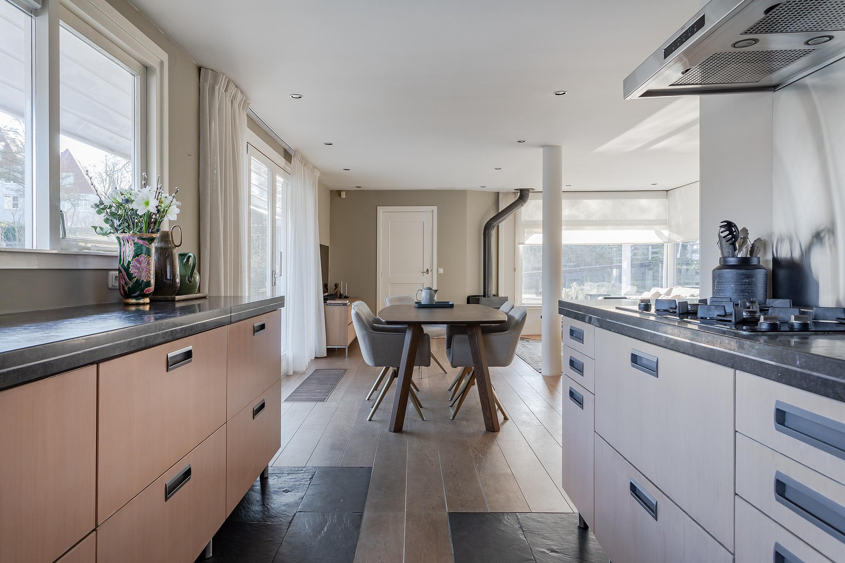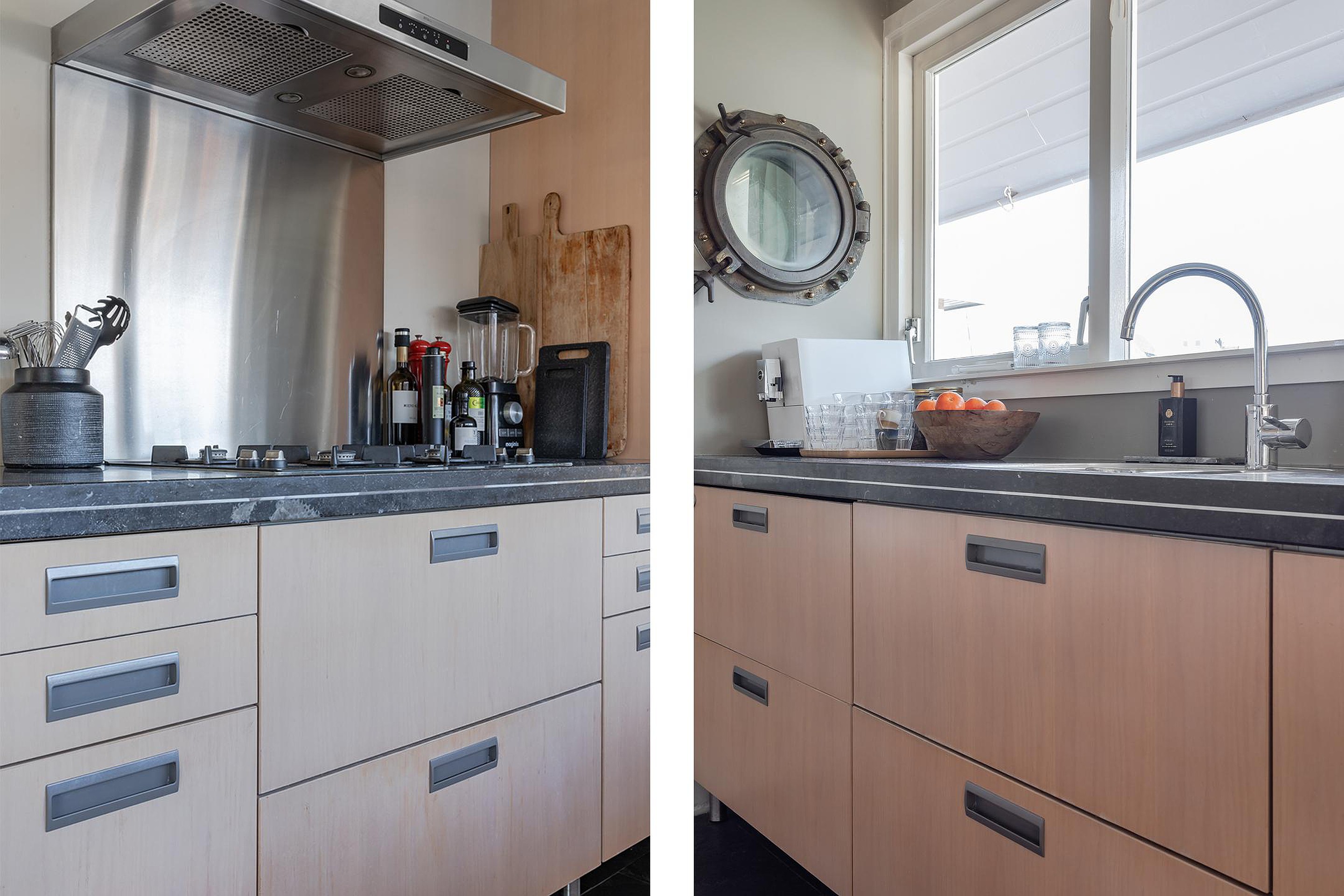 In de open keuken met 2 rechte opstellingen is de eikenhouten vloer afgewisseld met leistenen vloertegels. Vanaf het aanrecht met Belgisch hardstenen werkblad en 1½ spoelbak heeft u direct contact met uw huisgenoten in de living én zicht op de binnenhaven. Bij mooi weer kunnen daar 2 ramen open waarvan het hang- en sluitwerk recent is vervangen. Naast de nodige kastruimte en veel laden is er diverse inbouwapparatuur geplaatst, zoals: een breed 4 pits gaskomfoor, rvs-afzuigkap met de afvoer naar buiten, een hoog geplaatste vaatwasser, combimagnetron en de koel/vriescombinatie.