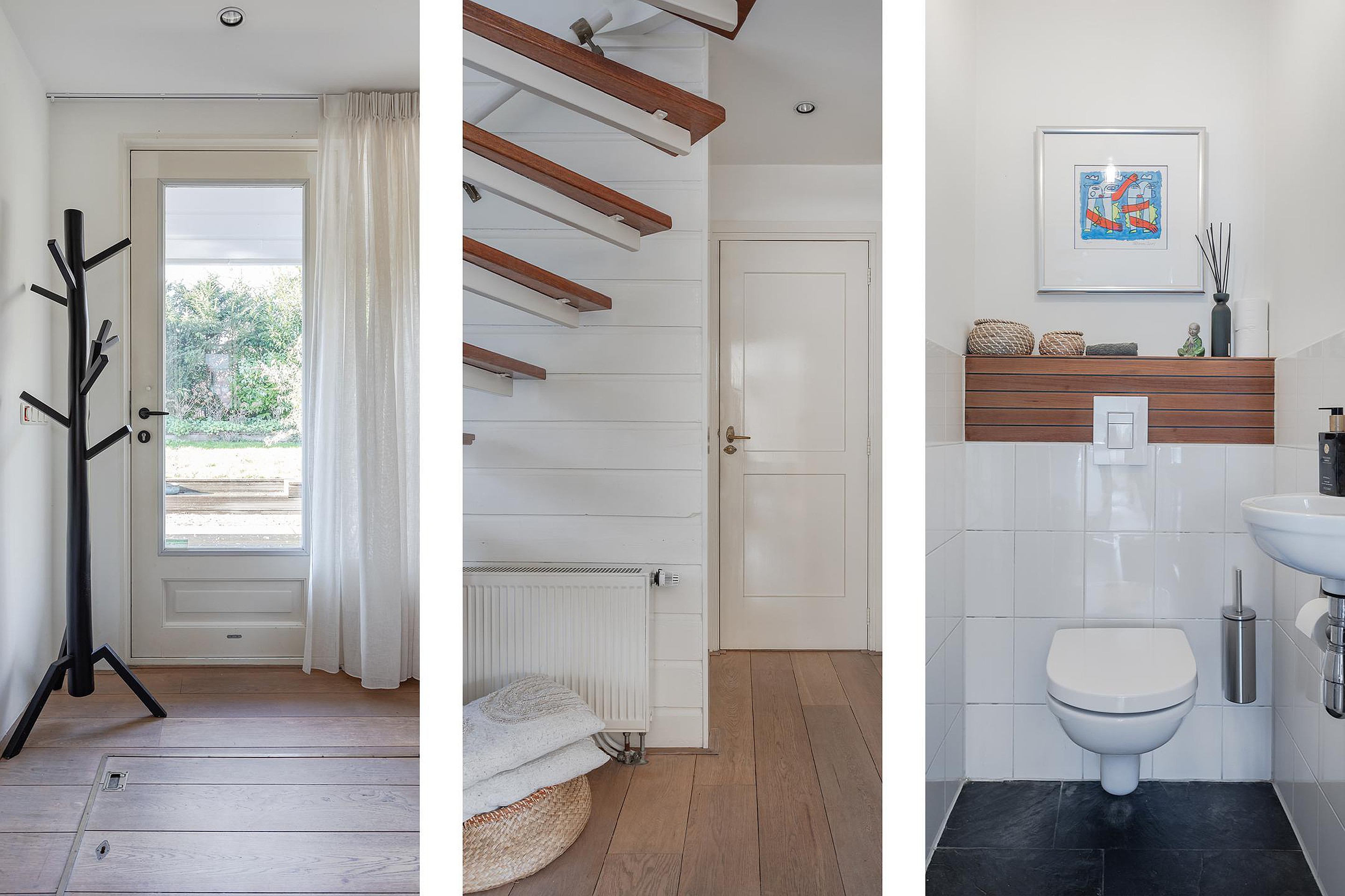 Vanuit de living geven openslaande deuren toegang tot een ruime hal waar de oorspronkelijke voordeur met een zijraam zit en een wenteltrap naar de slaapverdieping. Ook in deze ruimte is de eikenhouten vloer doorgelegd en zijn de wanden en plafond gestuukt.