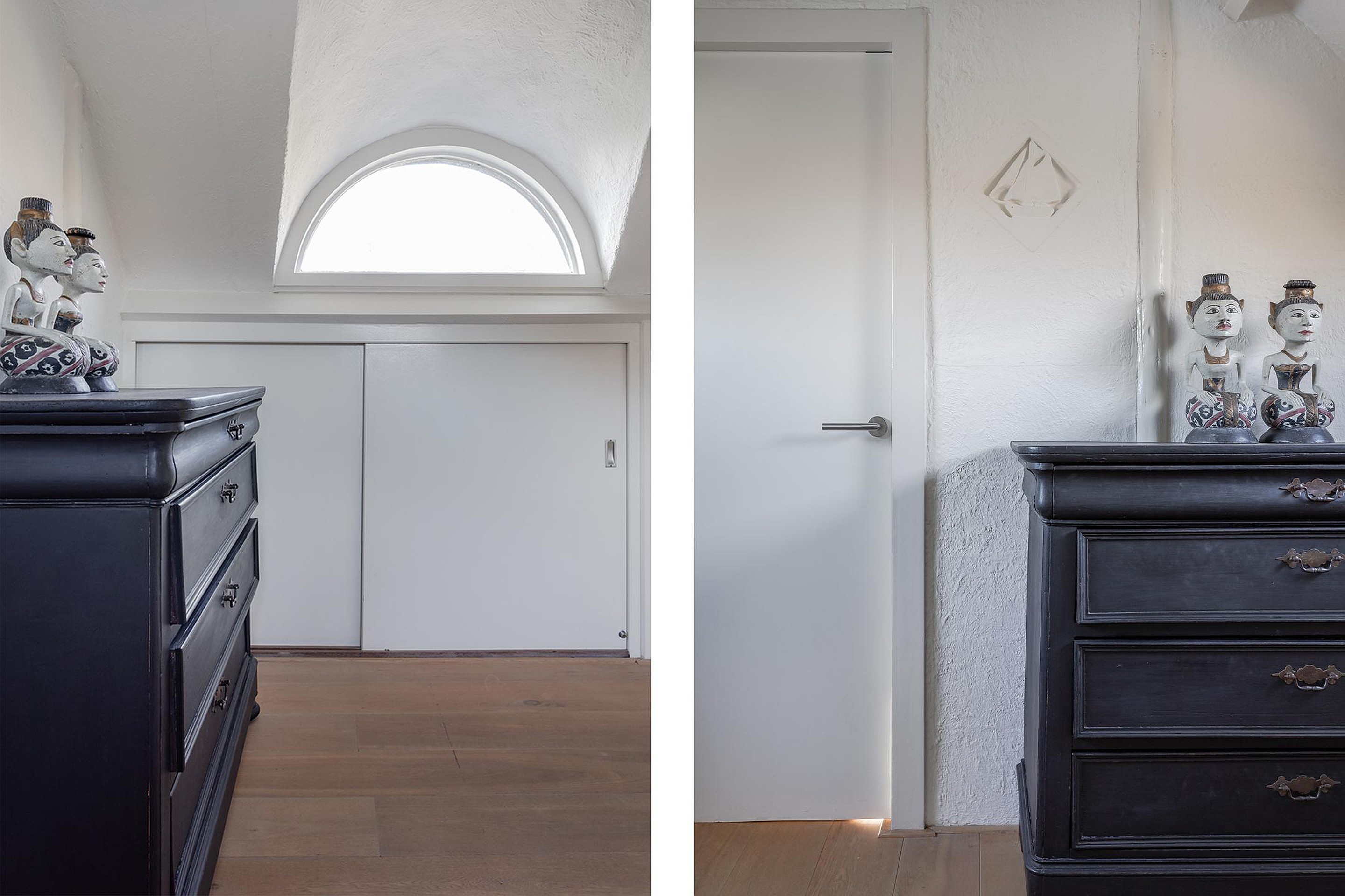 Achter de paneeldeuren bevinden zich de wasmachine- en drogeropstelling en een garderobekast.