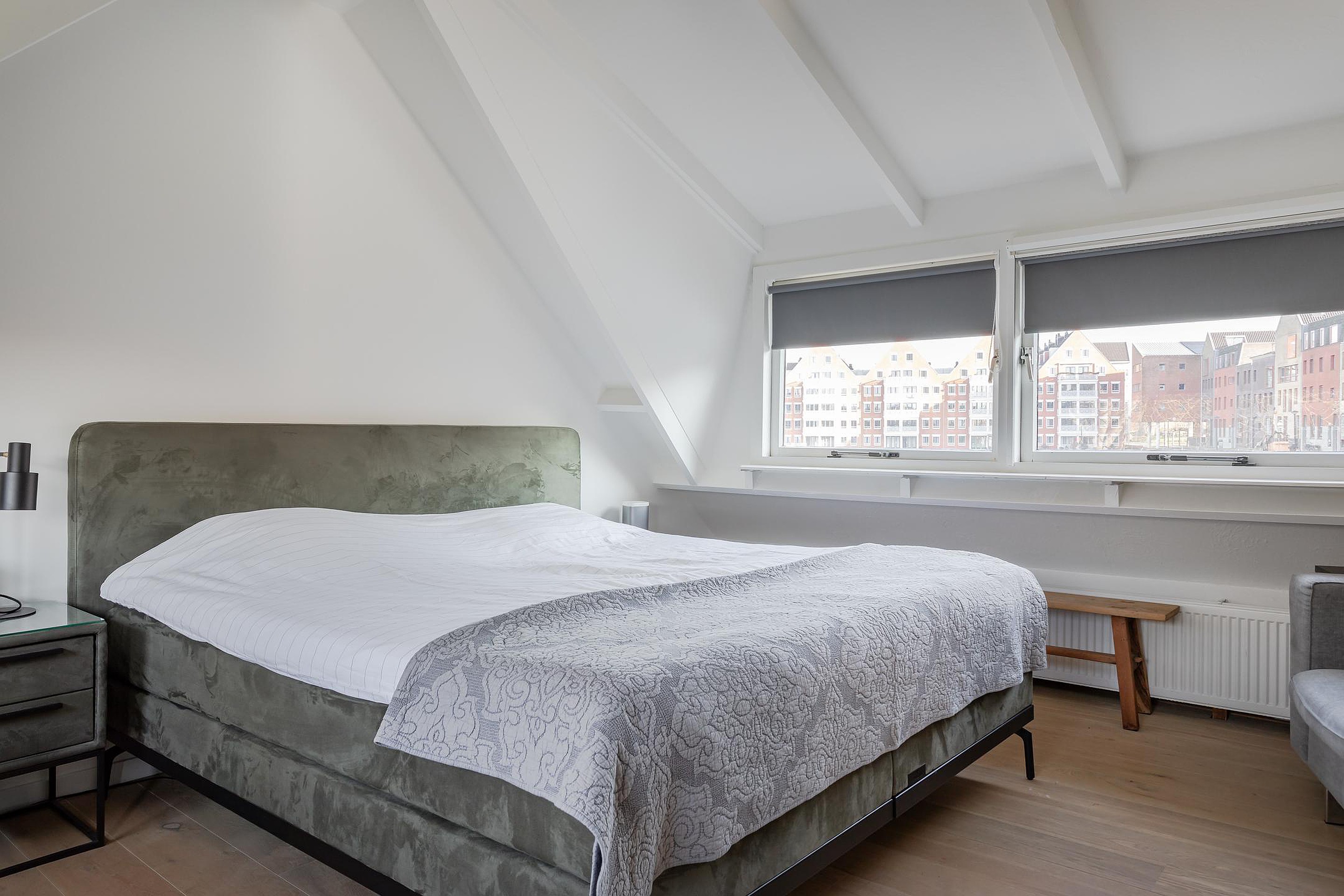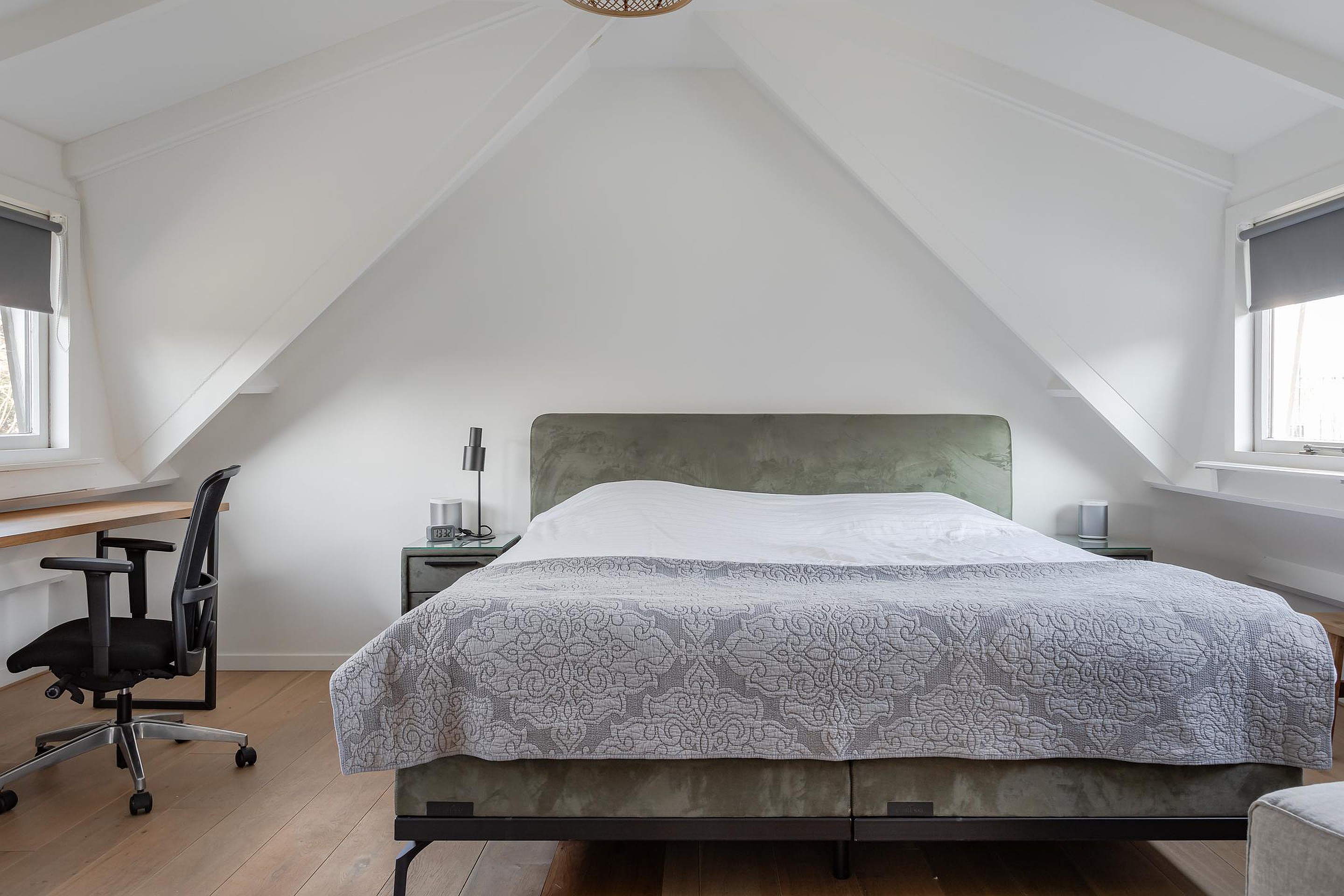 1e Slaapkamer – voorheen waren hier 2 kamers en in 2024 is er 1 grote slaapkamer gerealiseerd. De deur zit er nog dus het kan indien nodig ook weer worden gesplitst. De wanden zijn gestuukt, zowel aan de tuinzijde als aan de waterzijde zijn dakkapellen geplaatst waarvan alle ramen open kunnen en radiatoren verwarmen de slaapkamer.