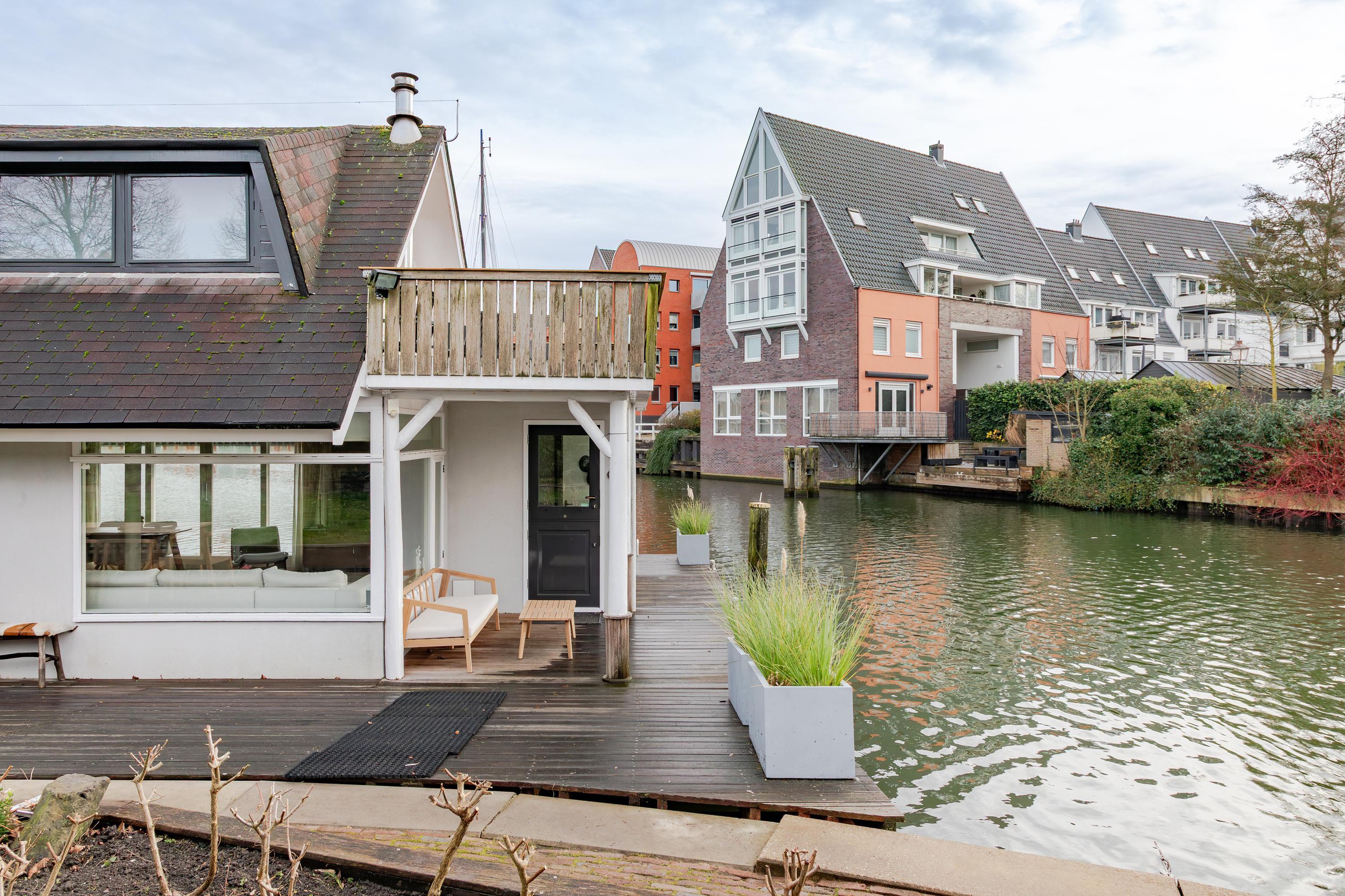 Aan de korte zijde van het waterterras kunt u een eigen boot aanleggen voor een vaste ligplaats en aan de lange zijde kunnen gasten aanleggen.