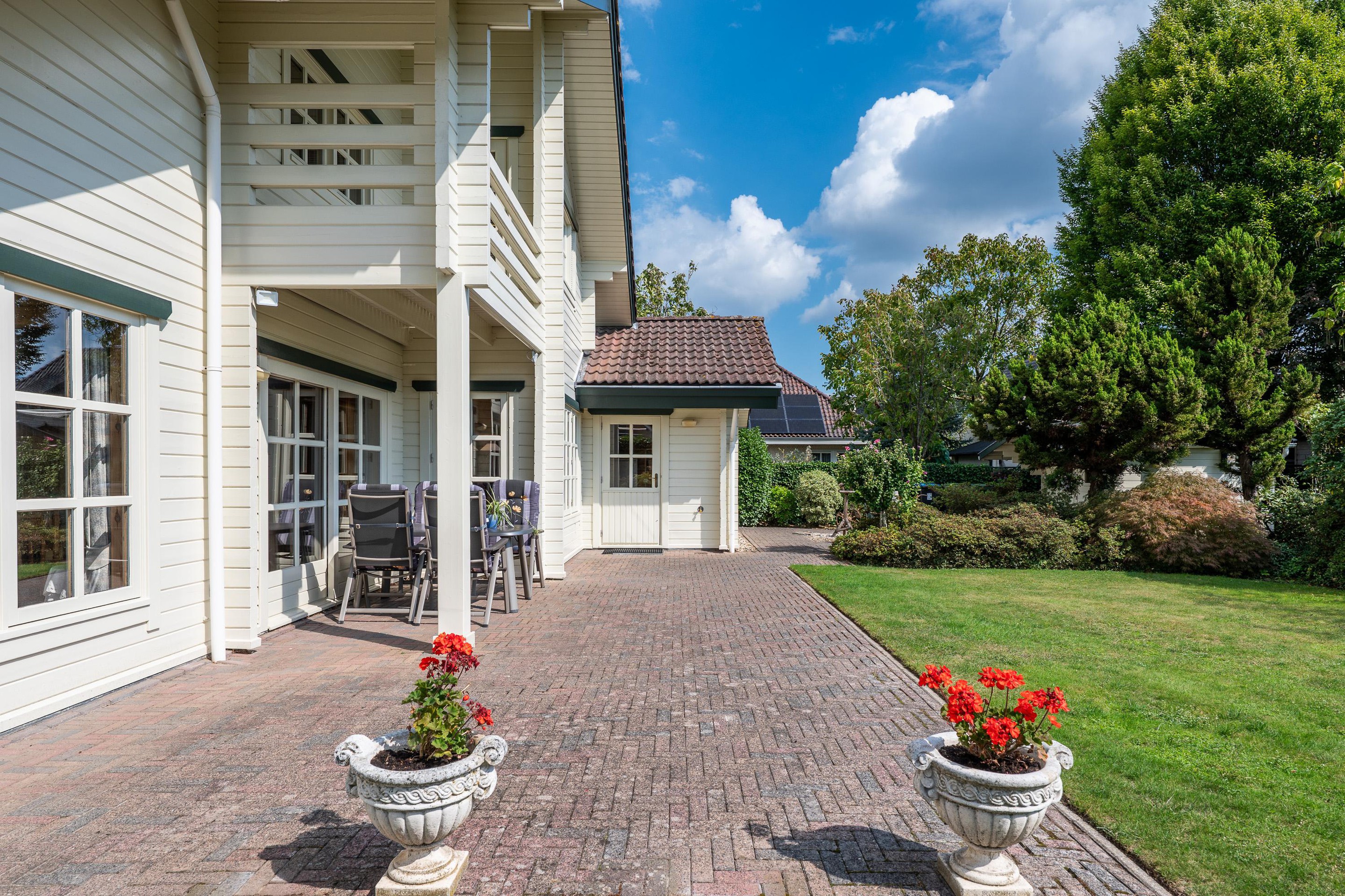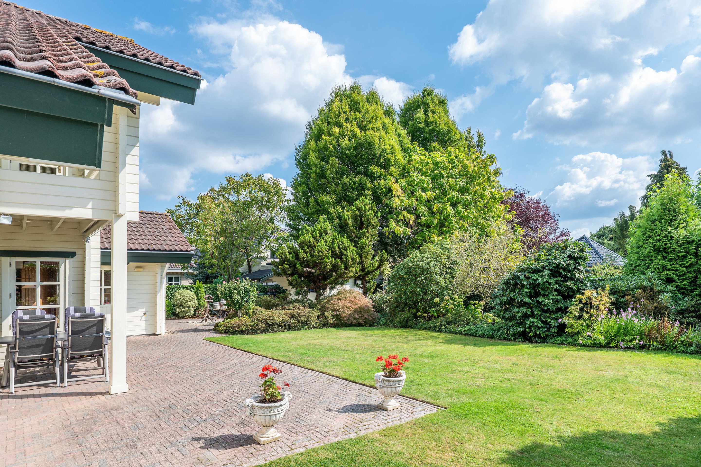 Tuin De buitenruimte van deze woning, georiënteerd op het zonnige zuiden, is ruim van formaat en fraai aangelegd. De combinatie van diverse bestrating en een gevarieerde beplanting maakt de tuin zowel praktisch als sfeervol. Direct vanuit de woonkamer onder het balkon is er een ruime plek beschikbaar waar een tuintafel met stoelen prima tot zijn recht komt. Deze plek is ideaal om te verbinden met de binnenruimte, waardoor je gemakkelijk van binnen naar buiten kunt stappen middels de grote schuifpui. Aan de achterzijde van het perceel bevindt zich een tuinhuis, handig voor het tuingereedschap en het stallen van niet dagelijks te gebruiken spullen maar voegt ook een charmant element toe aan de buitenruimte. De achterzijde van het perceel is aan beide zijden vanuit de voortuin/oprit toegankelijk.