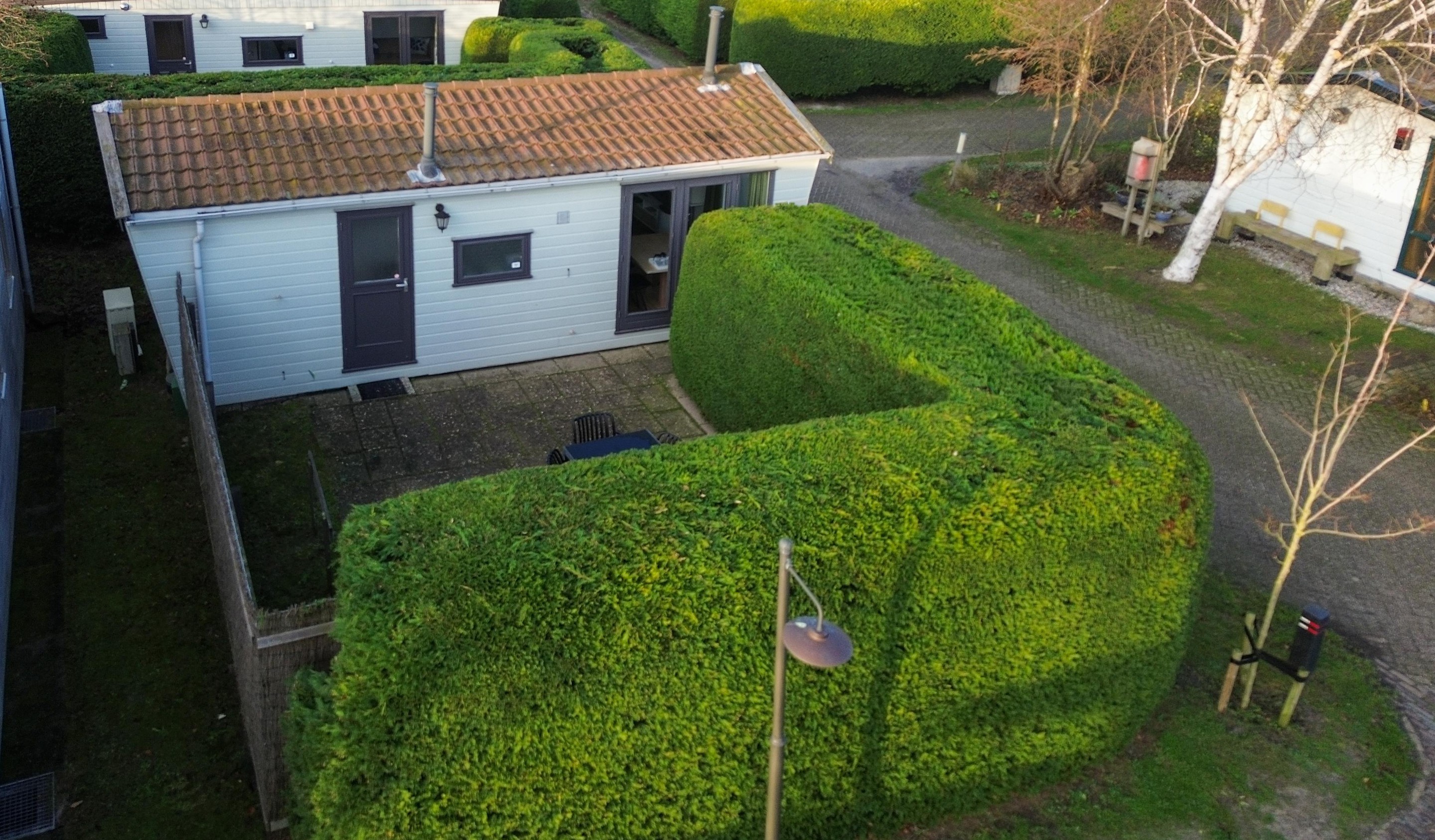 Tuin Chalet 'Paal 8' beschikt over een besloten tuin op het zuiden. De tuin is in overleg te vergroten op het eigen perceel middels het aanpassen van de coniferenhaag en schutting.