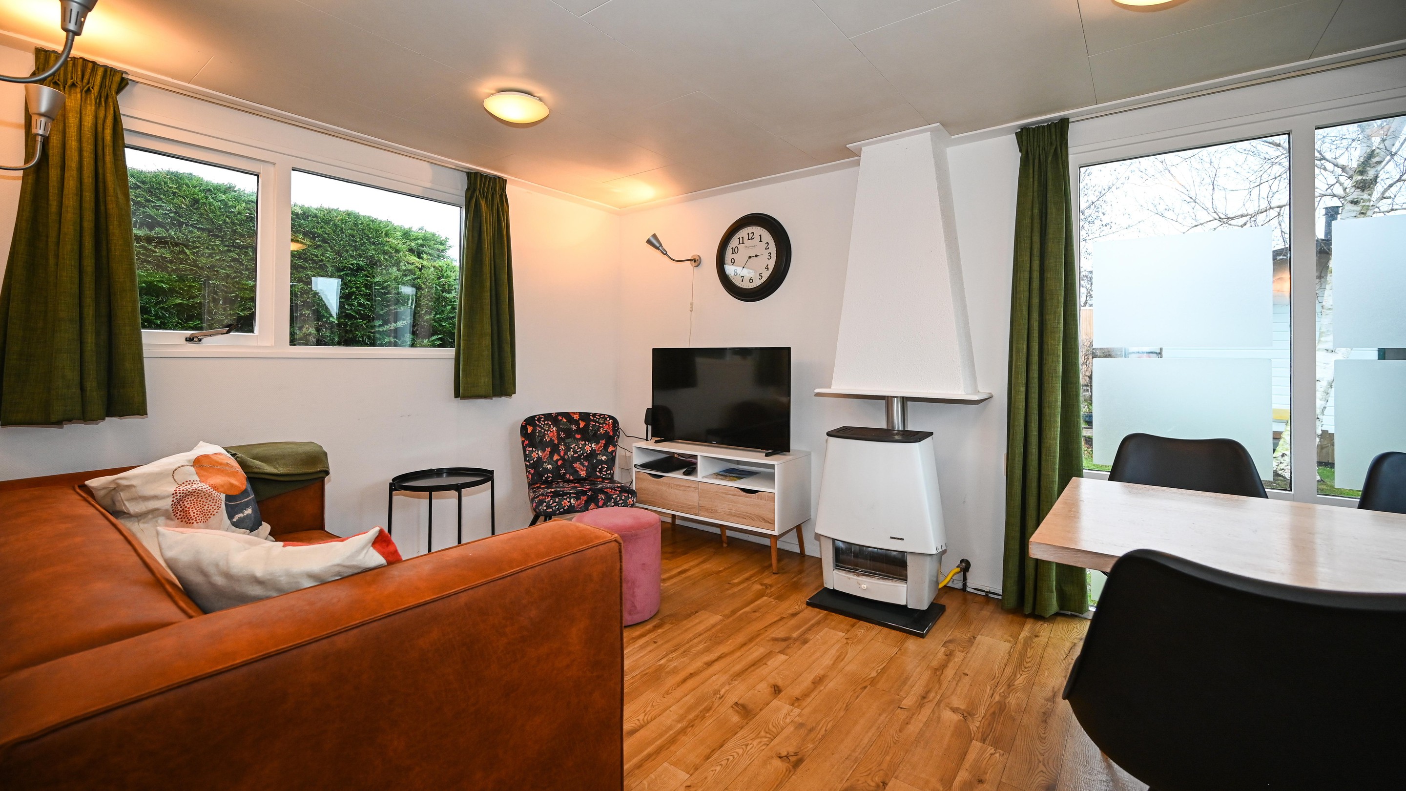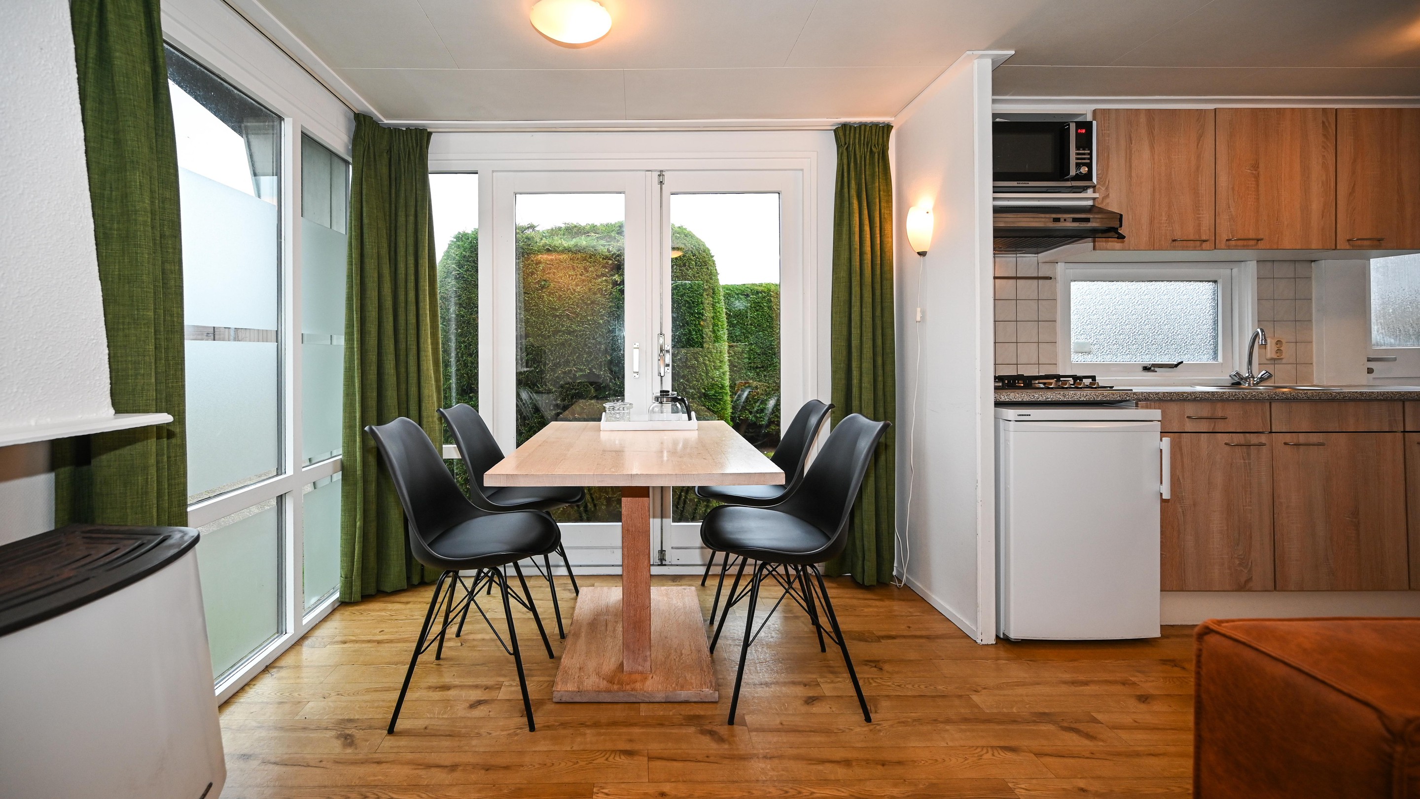 ‘’Paal 8’’ beschikt over een woonkamer met een modern interieur en een eettafel gelegen aan de openslaande deuren. De keuken is praktisch ingericht en uitgerust met een combimagnetron, een koelkast met vriesvak en een gasfornuis. Het chalet telt twee slaapkamers, waarvan één met een tweepersoonsbed en één met een stapelbed. Naast de slaapkamers bevindt zich de badkamer met toilet, wastafel en douchecabine. Aan de zuidzijde beschikt ‘’Paal 8’’ over een aangelegd terras, omheind met een coniferenhaag voor volop privacy. De tuin is in overleg te vergroten op het eigen perceel.