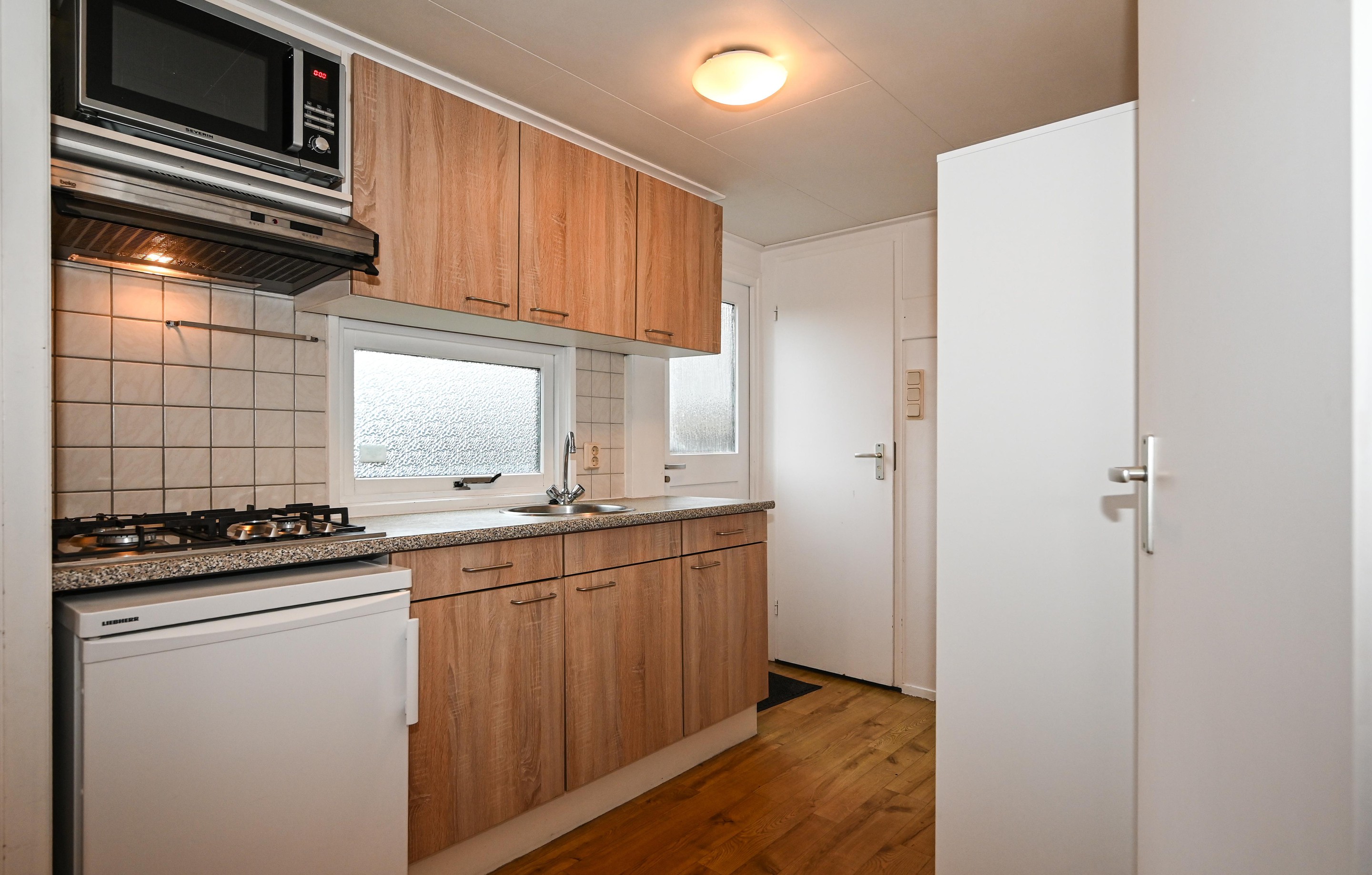 Begane grond Middels de entree aan de zuidzijde betreedt u het chalet in de hal/open keuken die overloopt in de woonkamer. De hal/open keuken biedt toegang tot twee slaapkamers en de badkamer.