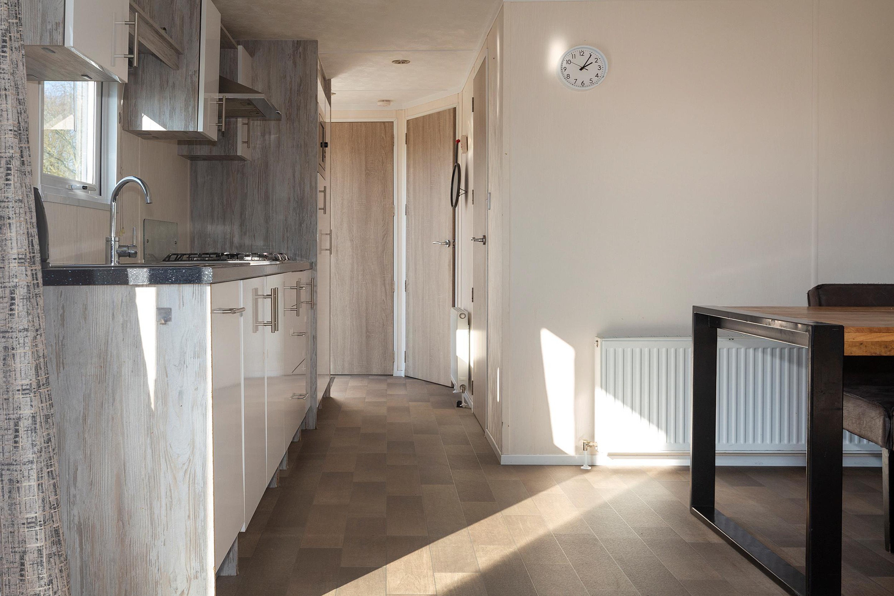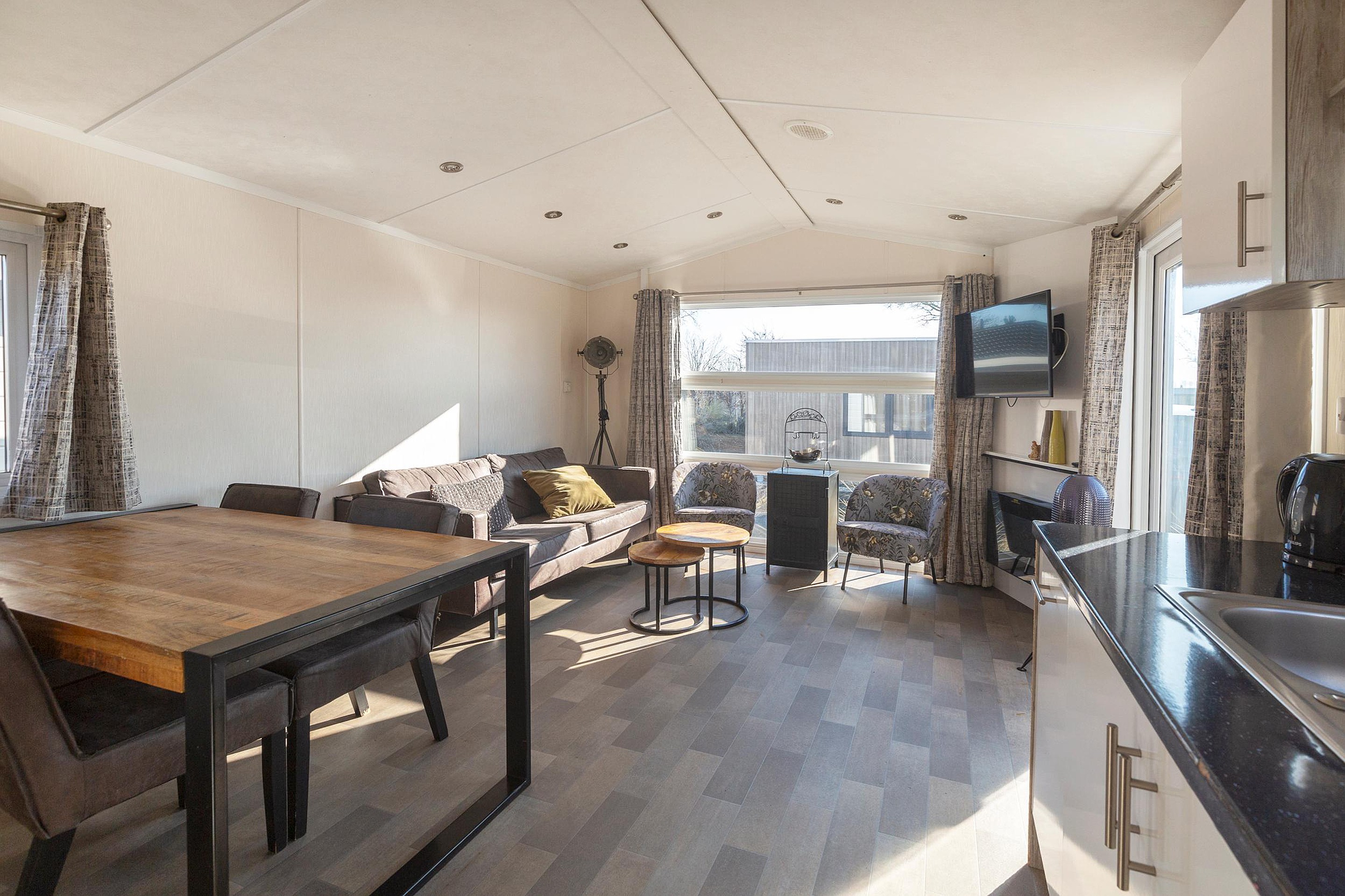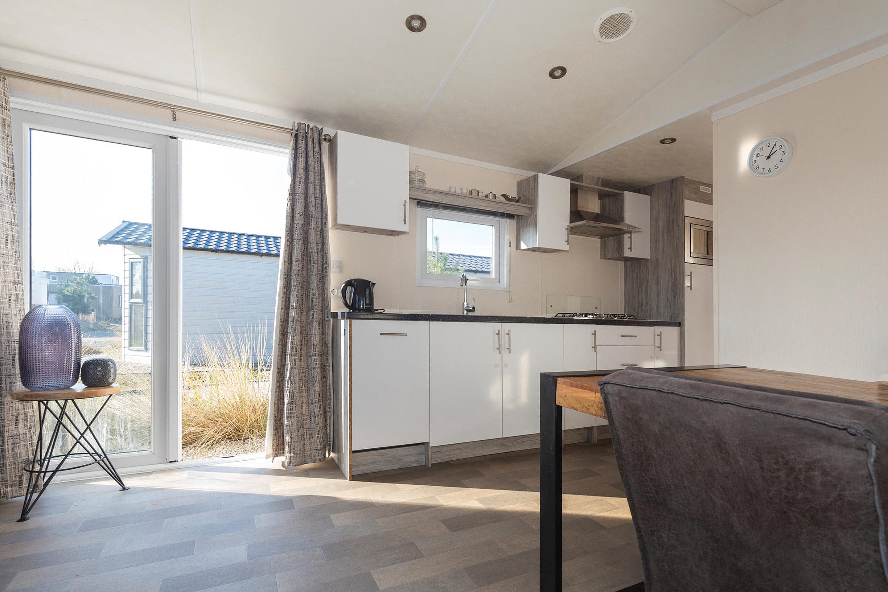 Bij binnenkomst in de chalet valt direct de lichte en ruime woonkamer op. Dankzij de grote raampartijen komt er veel daglicht binnen, wat zorgt voor een aangename sfeer. De open keuken is compleet uitgerust met diverse inbouwapparatuur, waaronder een gasfornuis, koel-vriescombinatie en combi-oven/magnetron, en biedt voldoende opbergruimte.