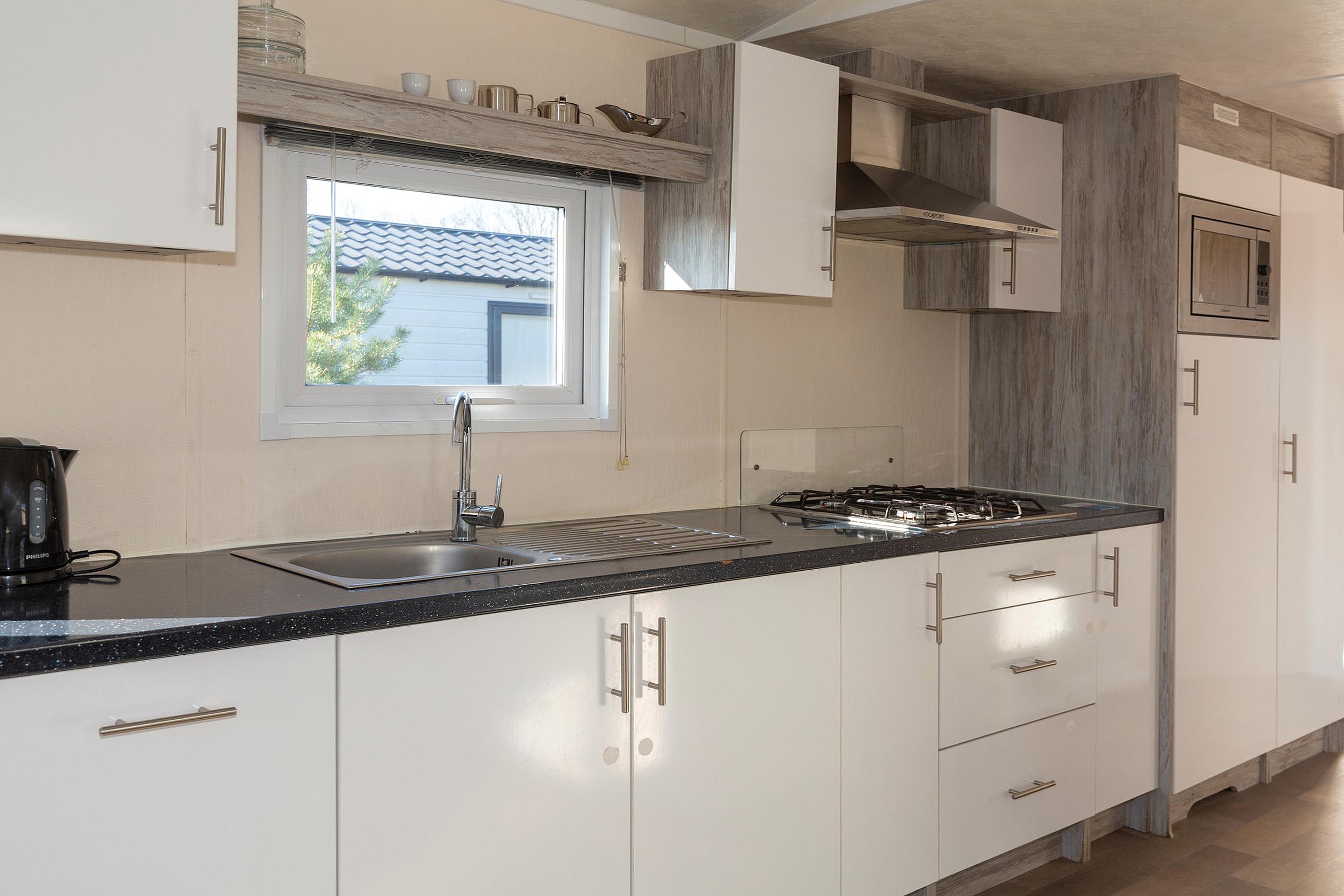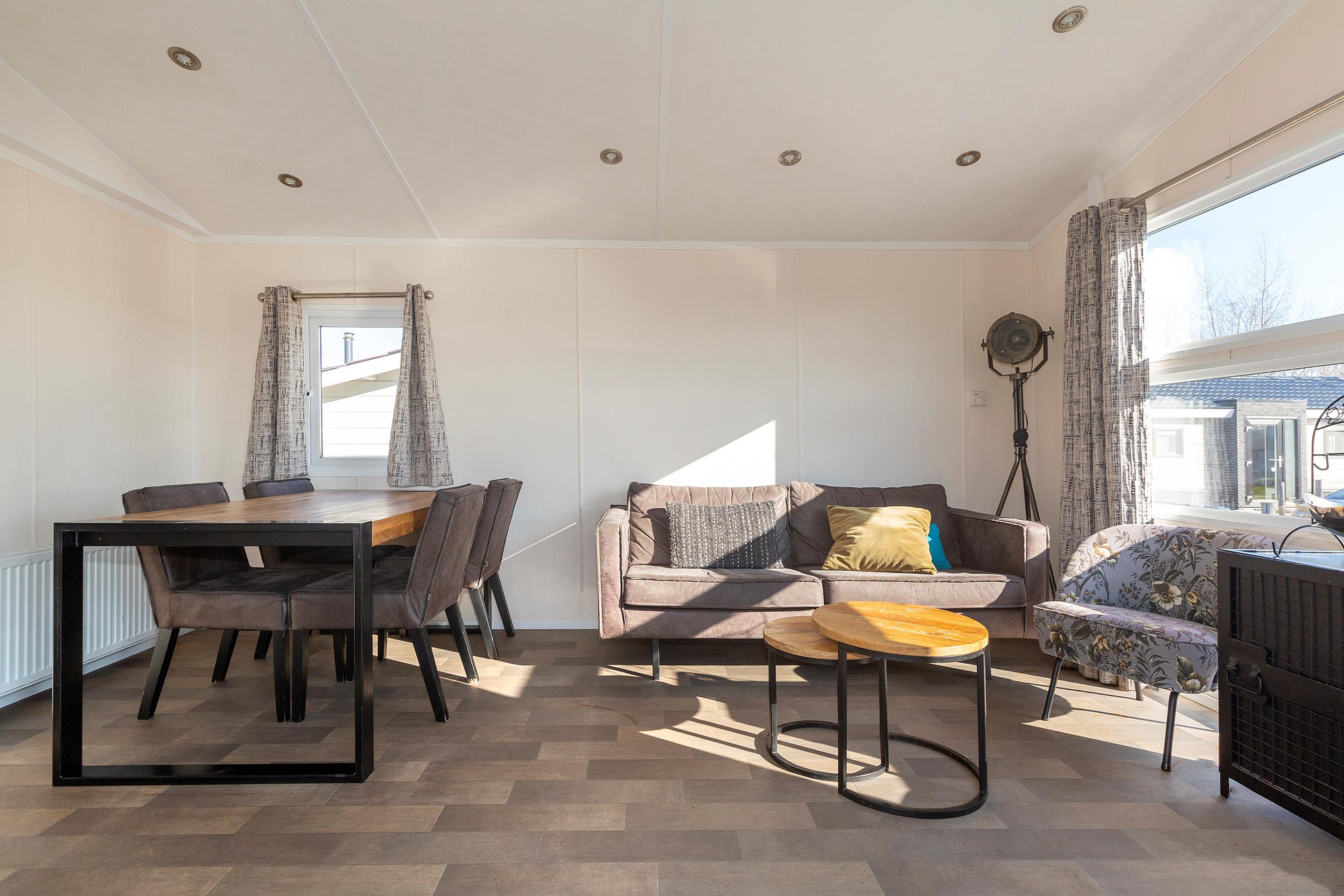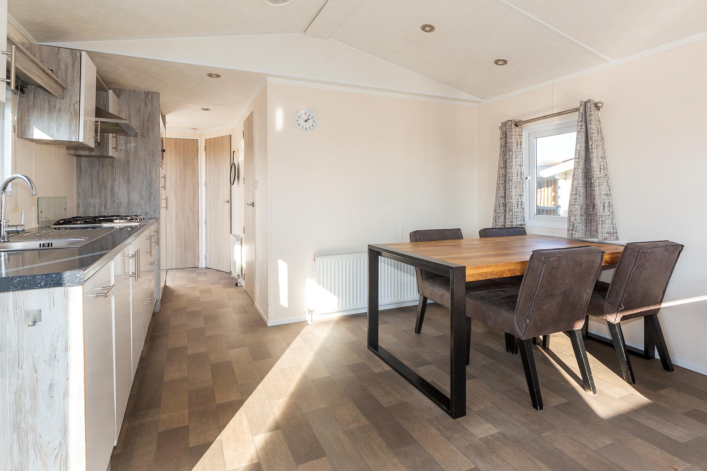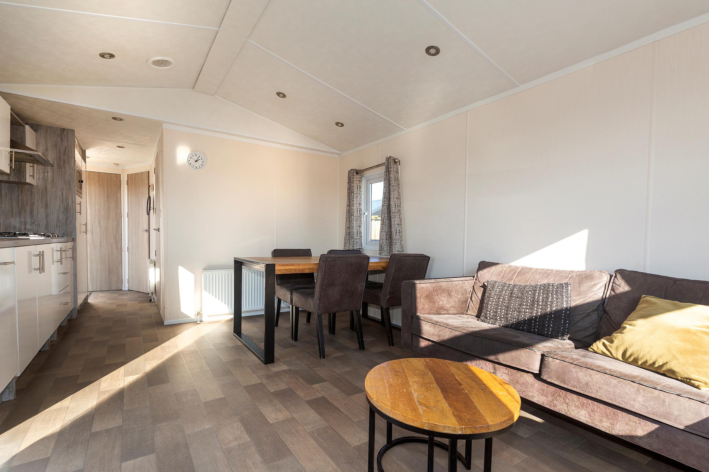 Bij binnenkomst in de chalet valt direct de lichte en ruime woonkamer op. Dankzij de grote raampartijen komt er veel daglicht binnen, wat zorgt voor een aangename sfeer. De open keuken is compleet uitgerust met diverse inbouwapparatuur, waaronder een gasfornuis, koel-vriescombinatie en combi-oven/magnetron, en biedt voldoende opbergruimte.