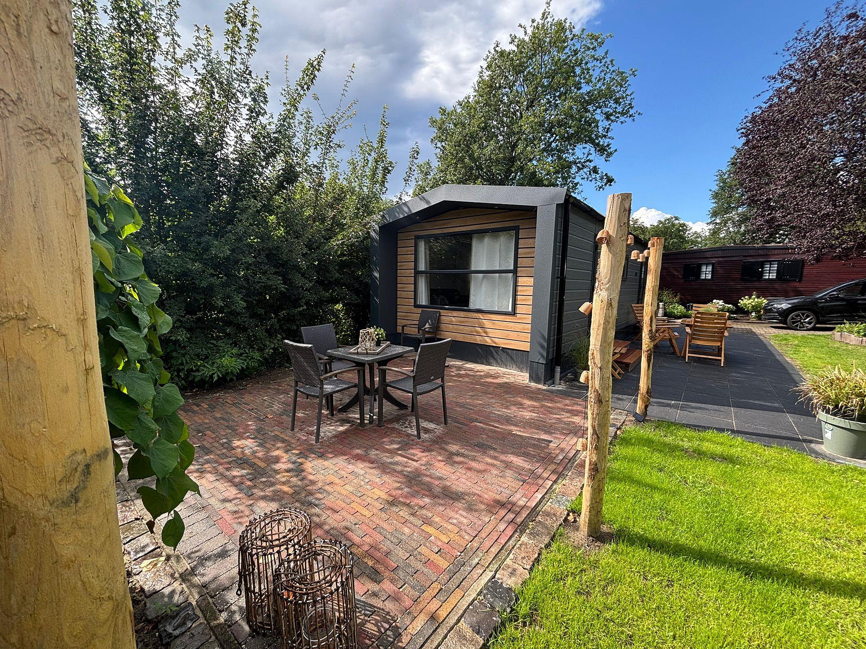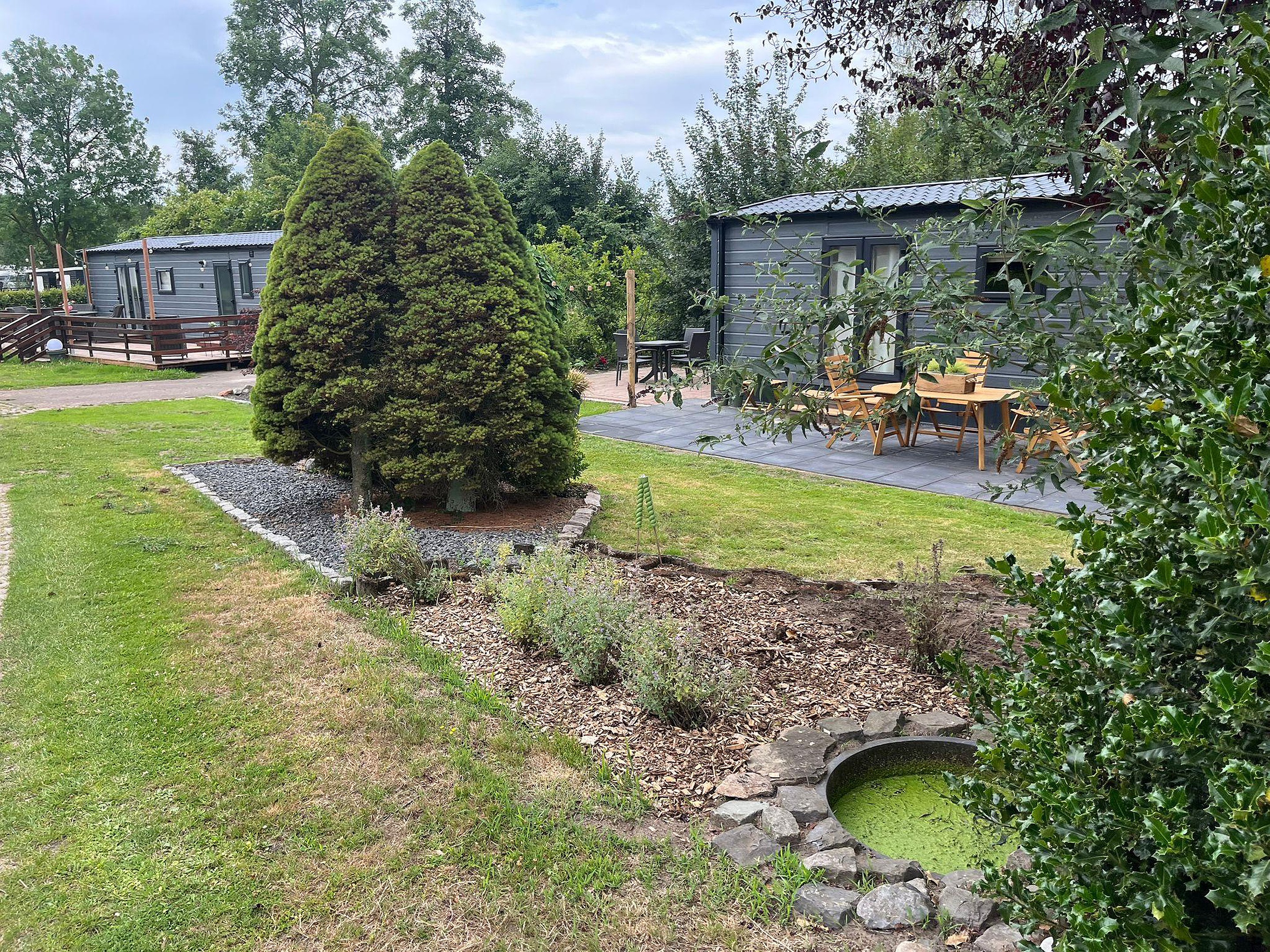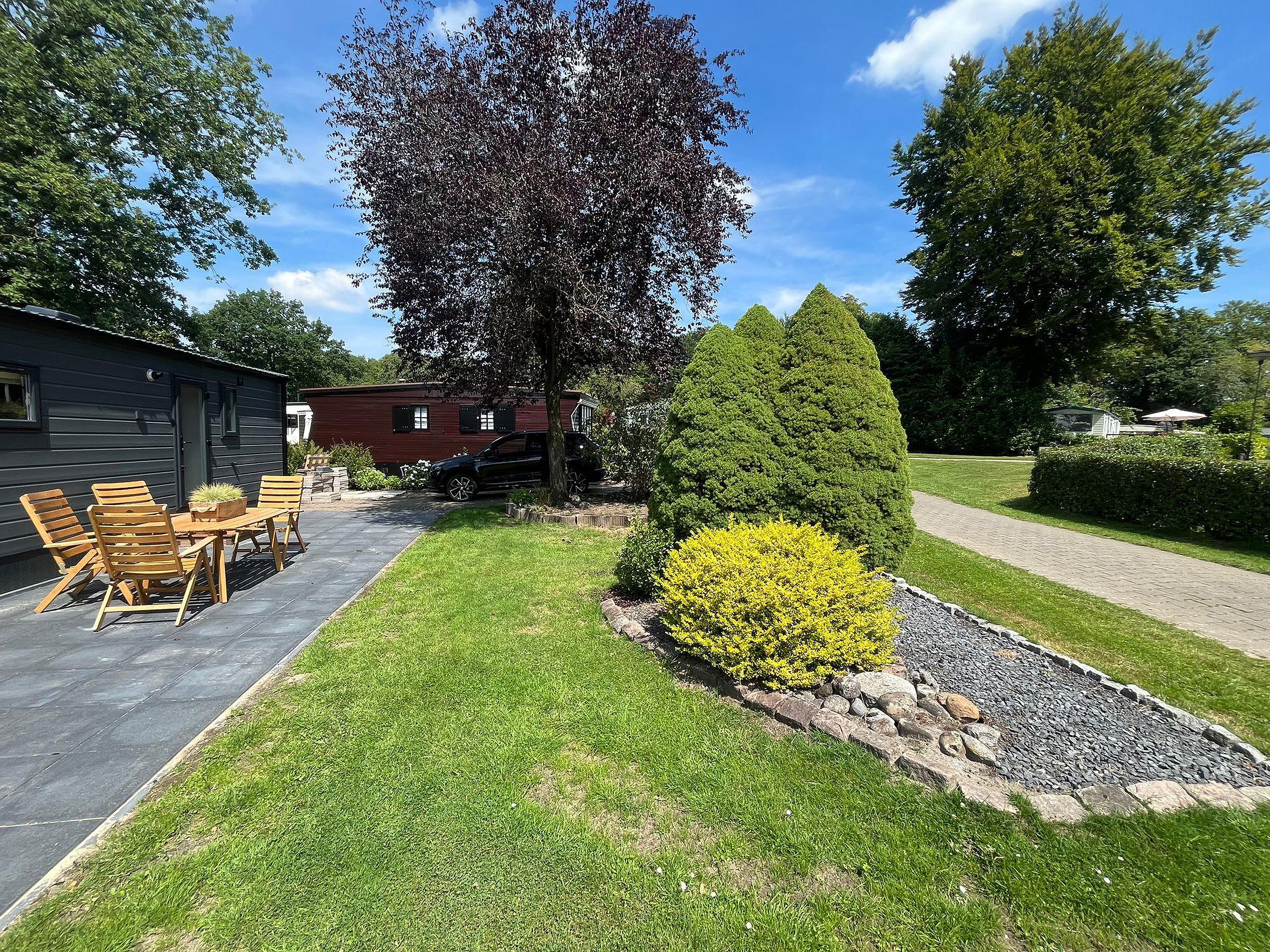 Tuin Je kunt via de openslaande tuindeuren in de woonkamer het zonnige ruime terras aan gehele voorzijde, maar ook aan de zijkant bereiken. Ook vanuit de entree is het royale terras toegankelijk en biedt plaats voor verschillende zitjes. Voor het chalet en terras bevindt zich een stuk groen en een ruim eigen oprit.