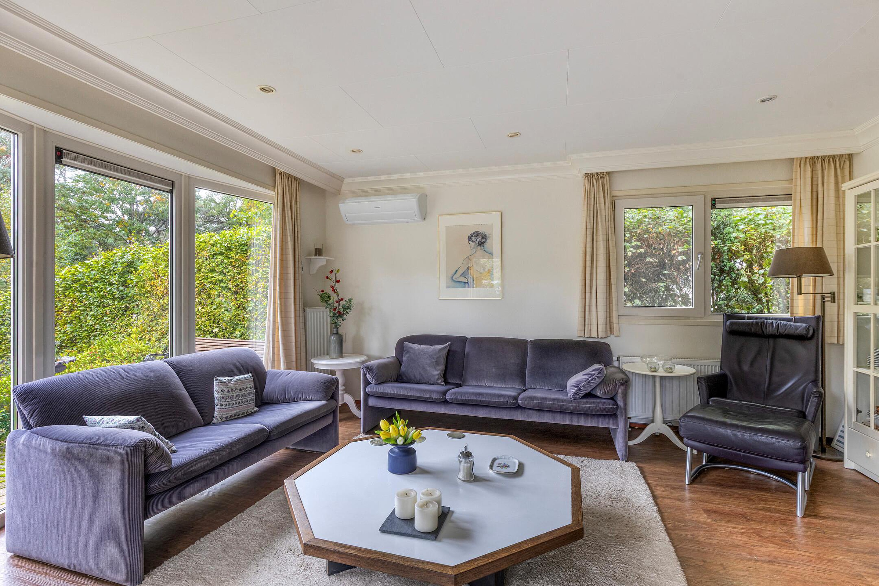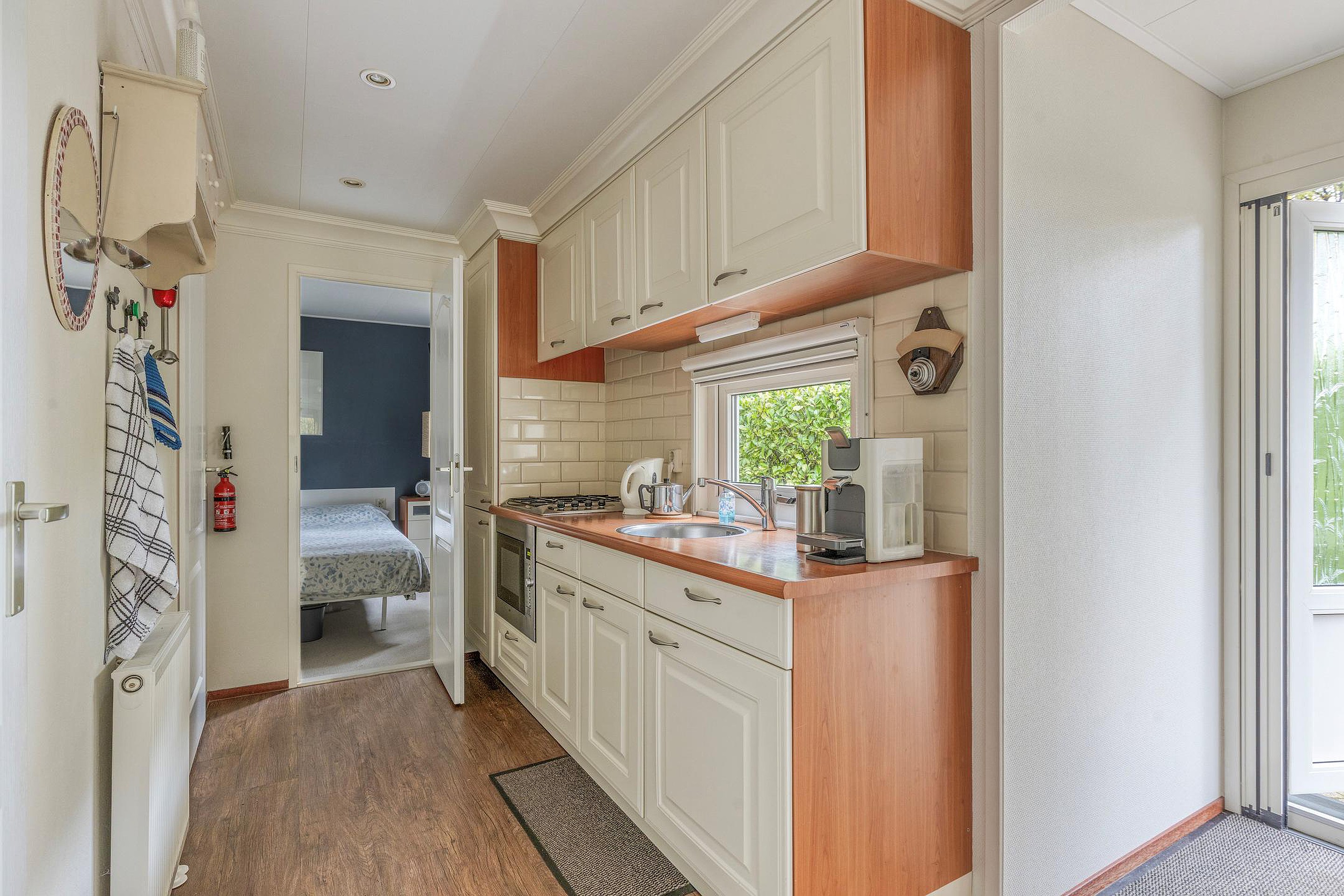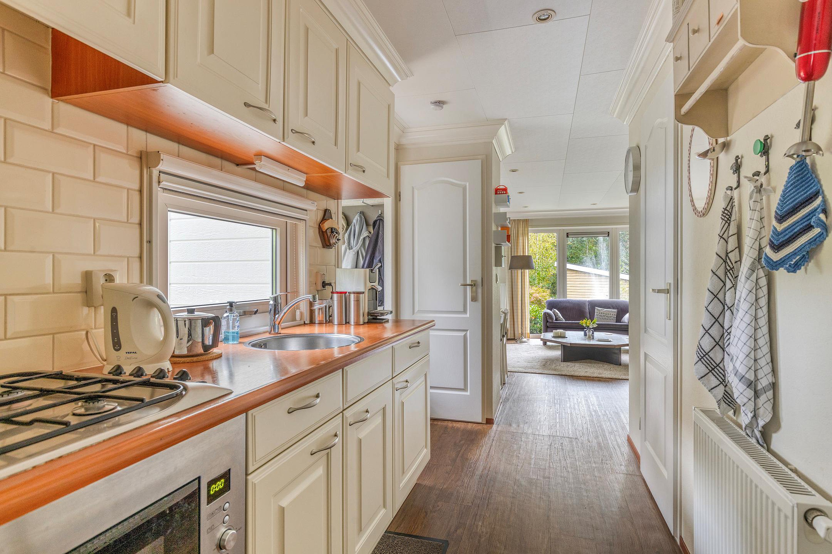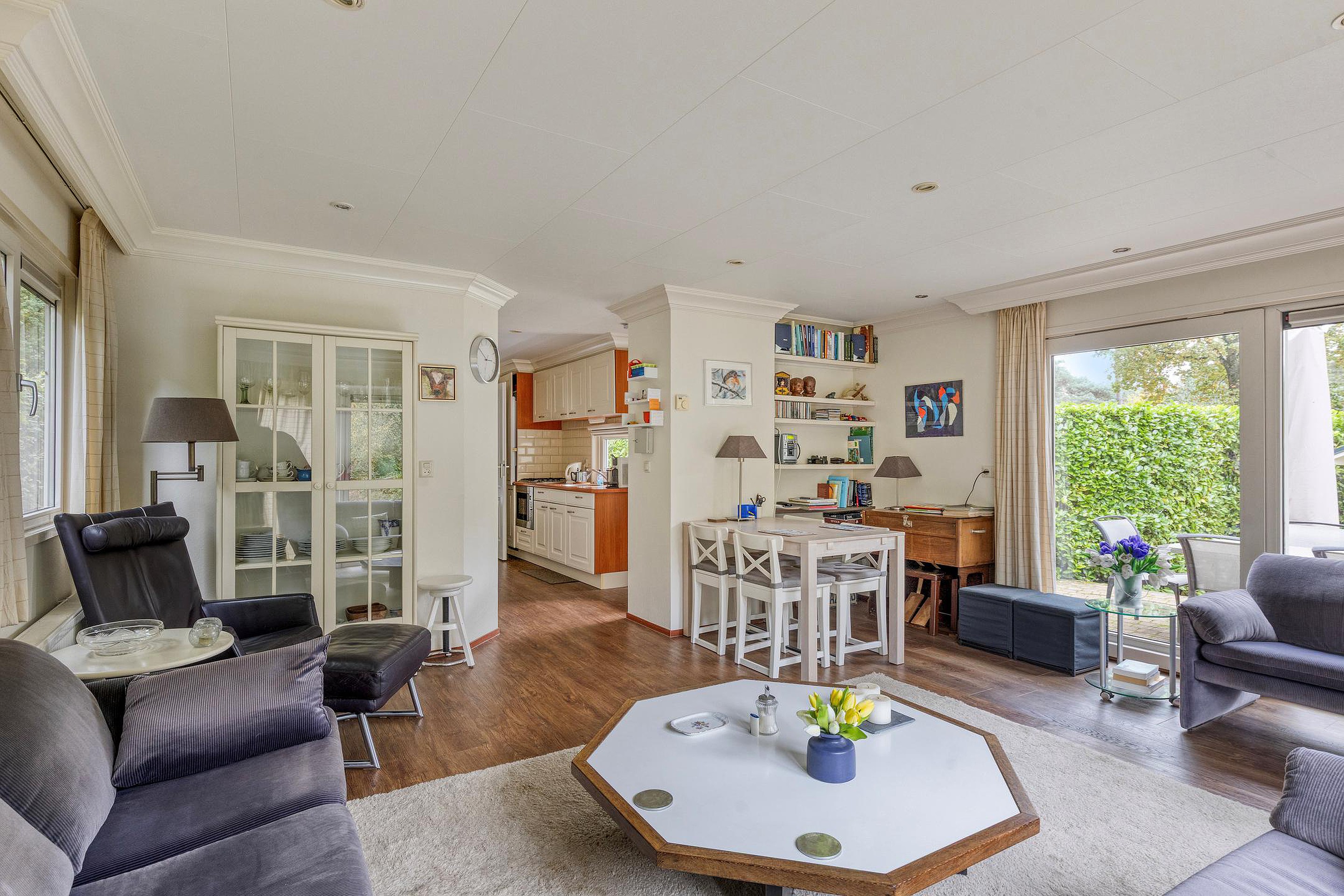U stapt binnen in een lichte, verzorgde ruimte waar direct de warme sfeer opvalt. De woonkamer is voorzien van grote ramen met zicht op de tuin rondom, waardoor het buitengevoel overal aanwezig is. De zithoek is ruim genoeg voor een comfortabele bank en eettafel, terwijl de open keuken praktisch is ingericht met een gaskookplaat, oven, afzuigkap, koelkast en diepvries.