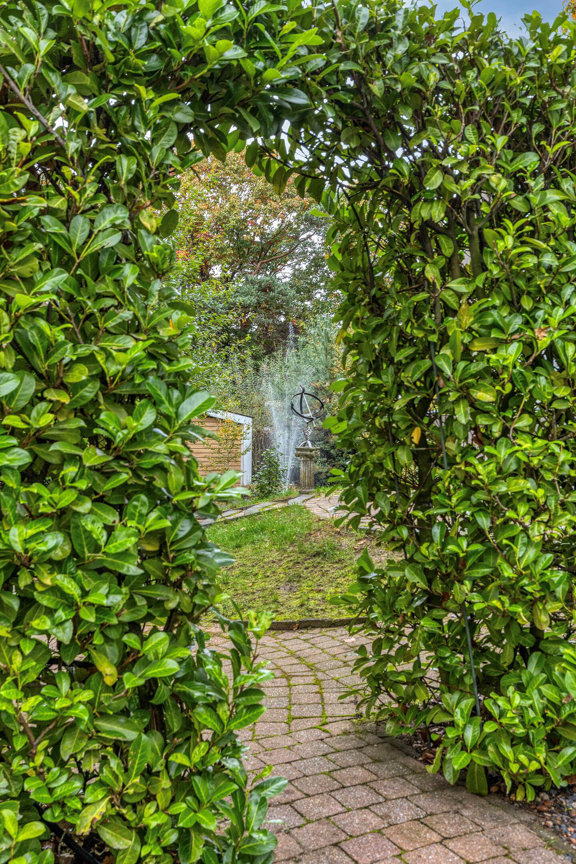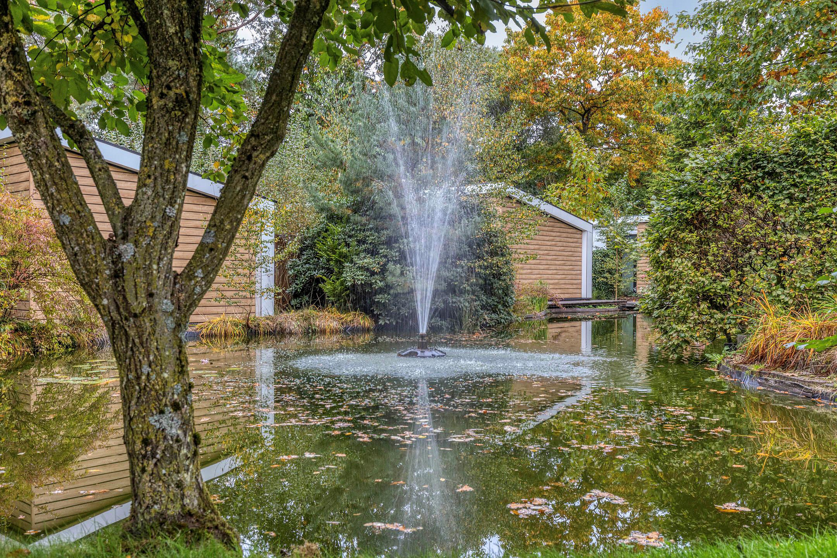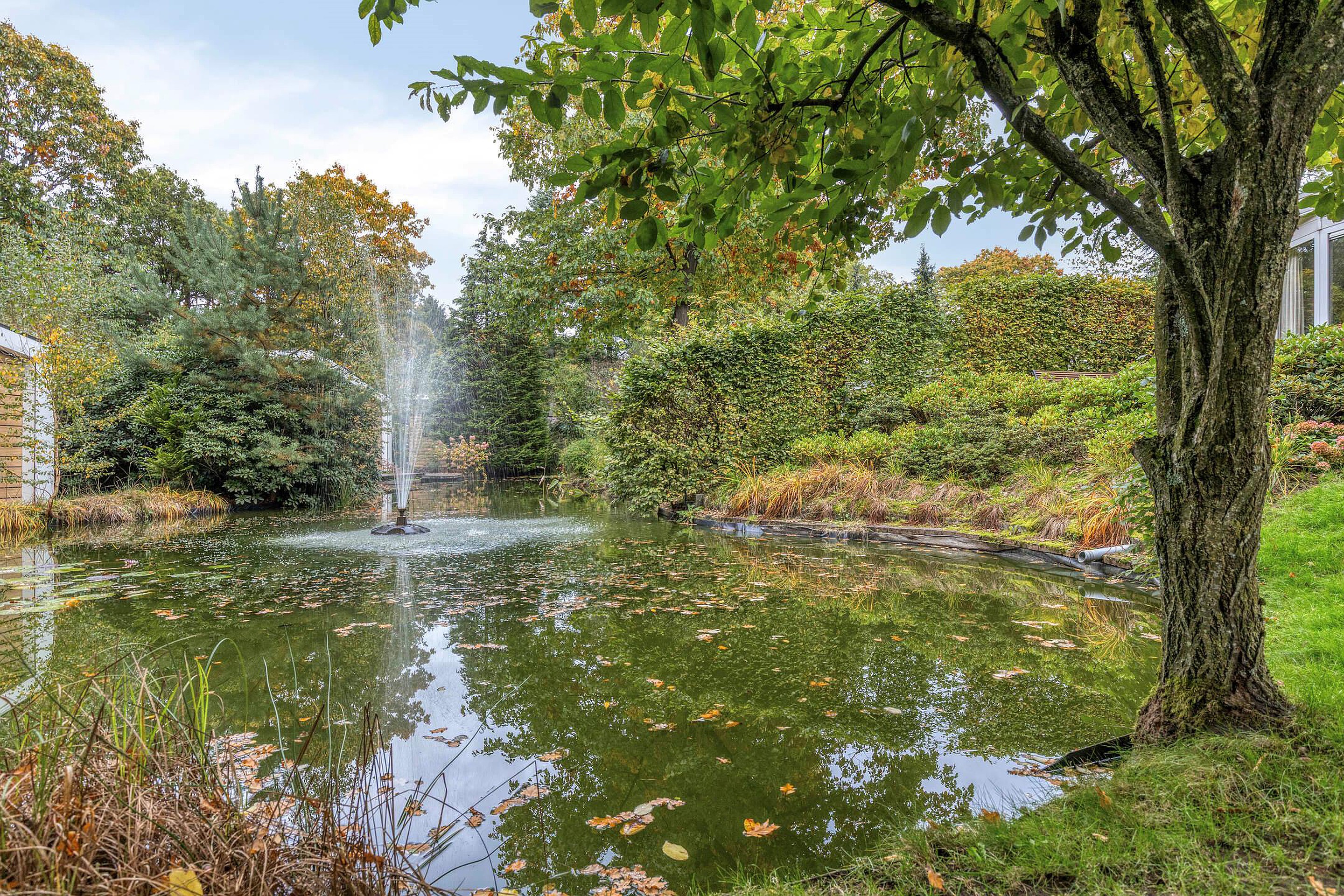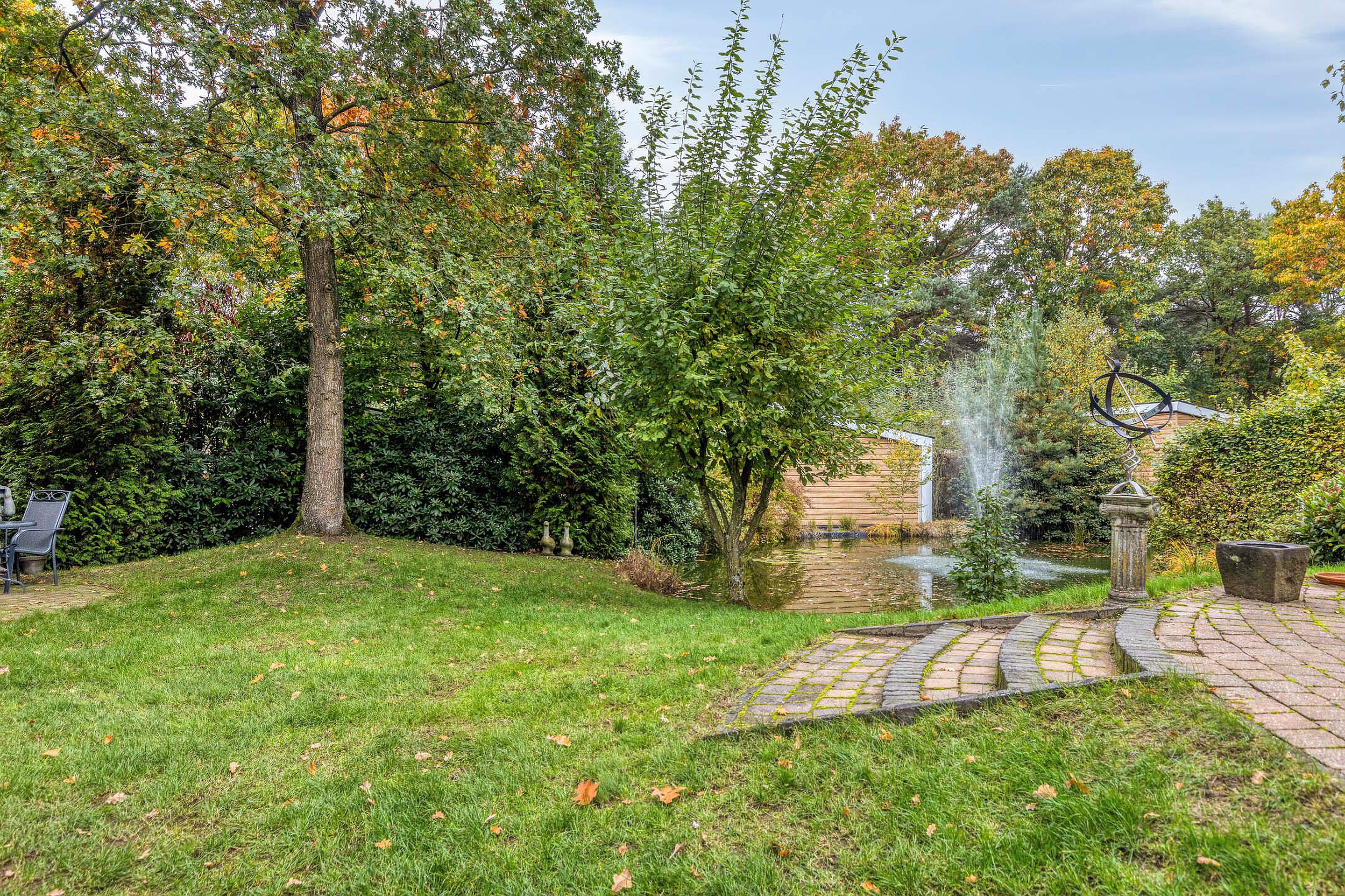 De tuin is een waar rustpunt en biedt volop privacy dankzij de groene hagen en volwassen beplanting. Er zijn meerdere terrassen, waaronder één direct grenzend aan de woonkamer waar u de hele dag door van de zon kunt genieten. Een paar treden lager vindt u een sfeervol zitgedeelte met uitzicht op een vijver met fontein – een schilderachtig plekje dat elke dag anders oogt door het spel van licht en water. Verder is er een houten berging voor tuingereedschap en fietsen. Dankzij de royale perceelgrootte is er ruimte genoeg om te tuinieren, loungen of buiten te dineren.