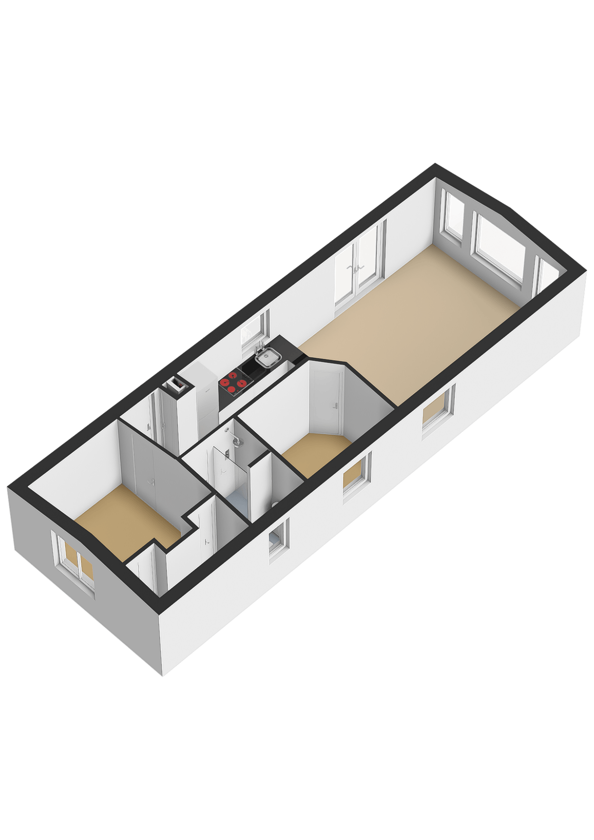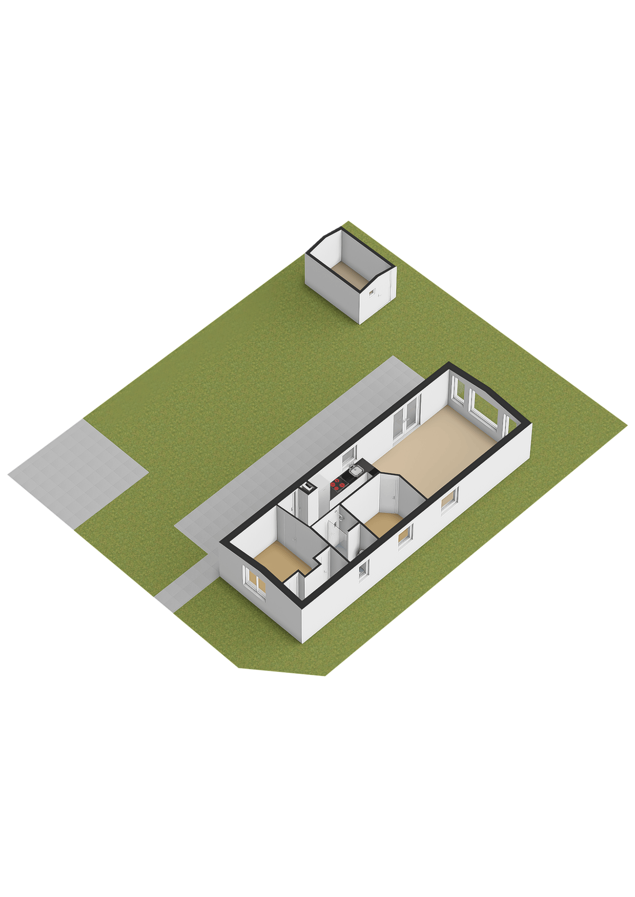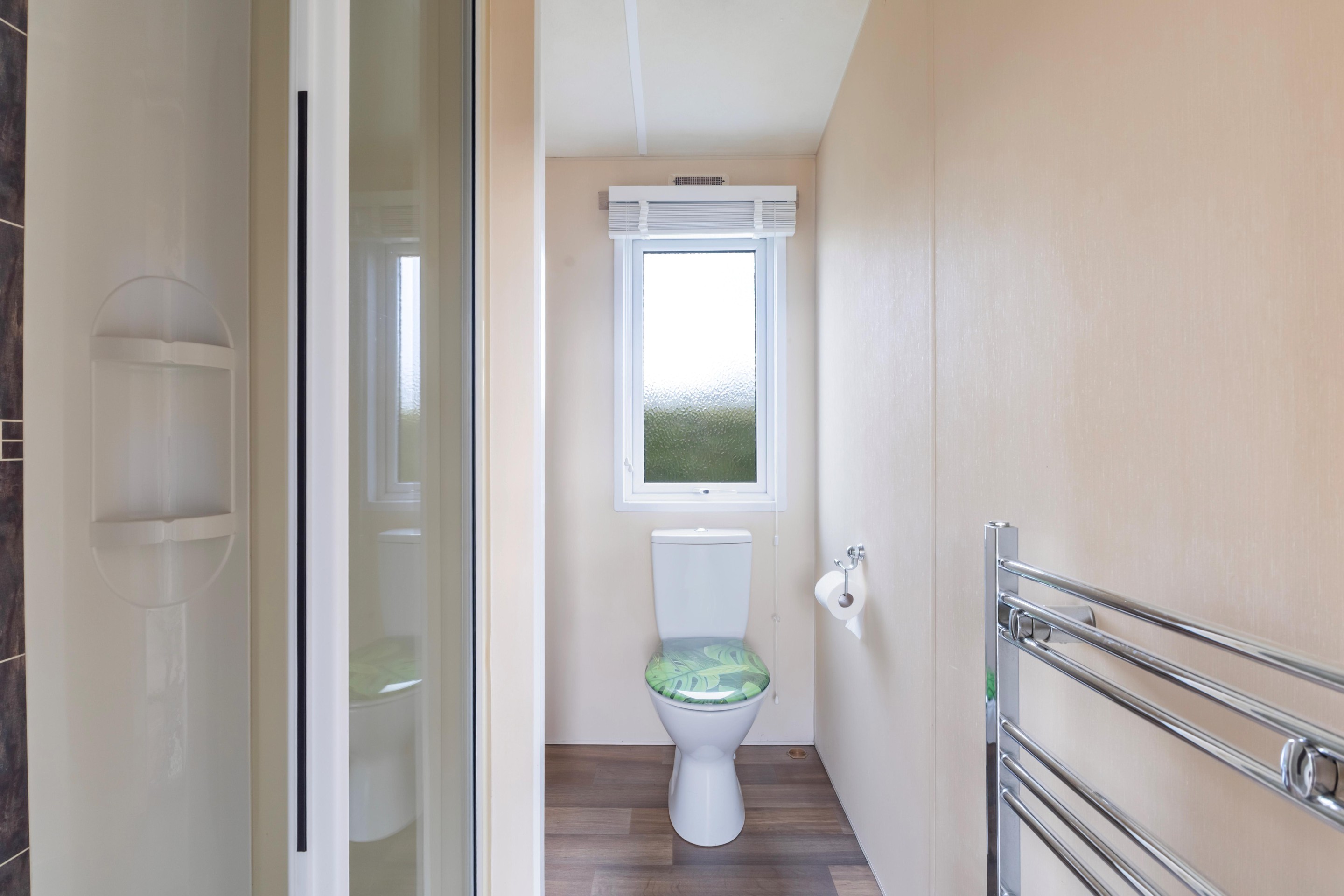 Je komt binnen in de keuken met volop kastruimte en een gaskookplaat met oven. Het geheel is netjes en praktisch ingericht. De woonkamer is verrassend ruim, heeft grote ramen en openslaande deuren naar het terras, waardoor binnen en buiten mooi in elkaar overlopen. Via de hal bereik je de slaapkamers: één royale slaapkamer met vaste kastenwand. De kastenwand is een echte meerwaarde: strak ingebouwd, volledig op maat en voorzien van een praktische indeling met hangruimte, legplanken, lades en zelfs een compacte toilettafel. Daarnaast beschikt de slaapkamer over een extra diepe kast, ideaal voor het netjes opbergen van kleding, koffers of seizoensspullen. Kortom: een fijne, rustige slaapkamer met veel opbergruimte en een slimme inrichting. De tweede slaapkamer heeft twee separate bedden en is slim ingericht met vaste kastruimte én extra opbergruimte boven het hoofdeinde. Door het raam komt er prettig daglicht binnen en kijk je uit op het groen rondom het chalet. Een praktische kamer die zich uitstekend leent als logeerkamer, kinderslaapkamer of werkkamer. De badkamer is voorzien van een douche, toilet en wastafelmeubel.