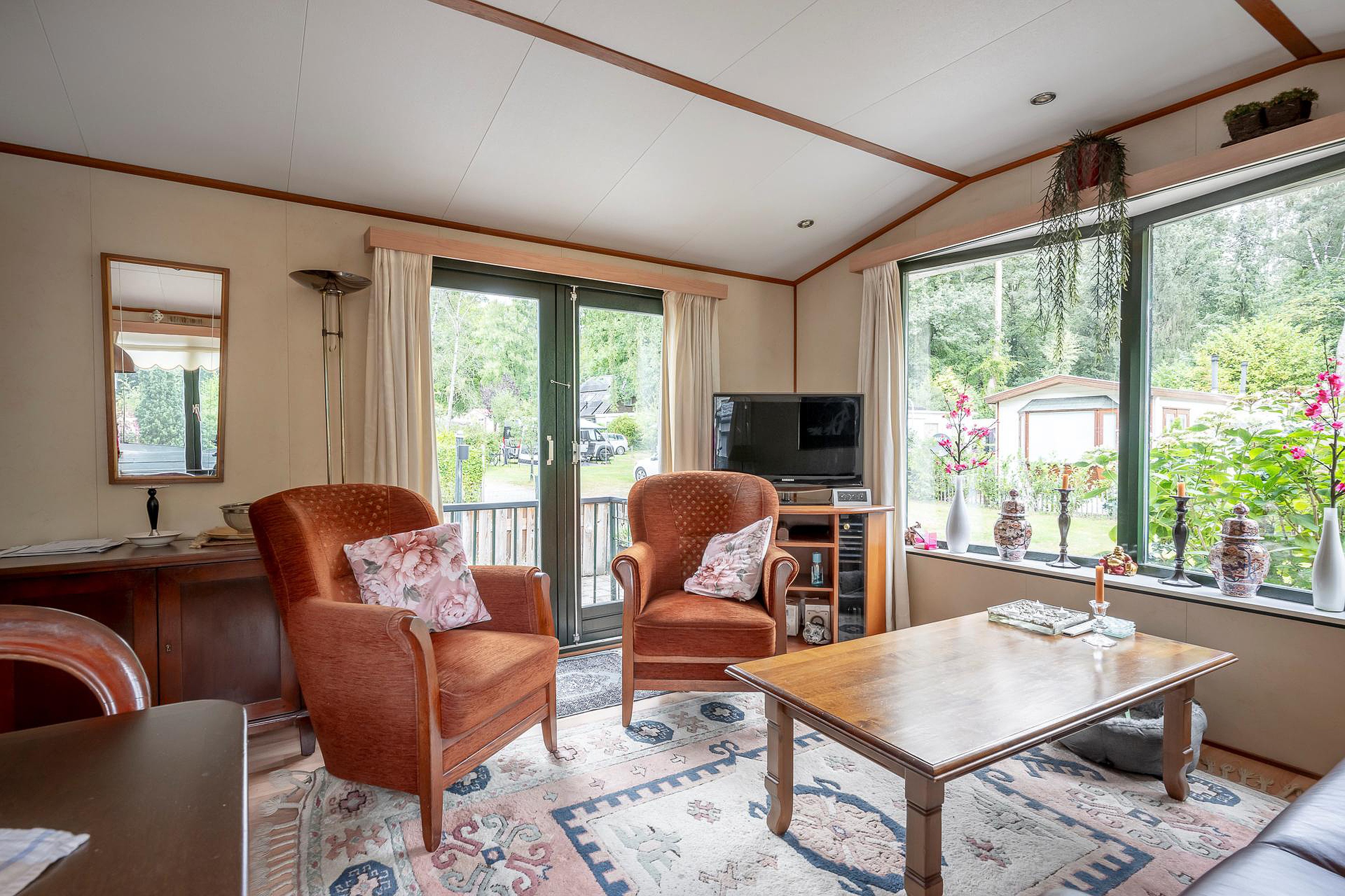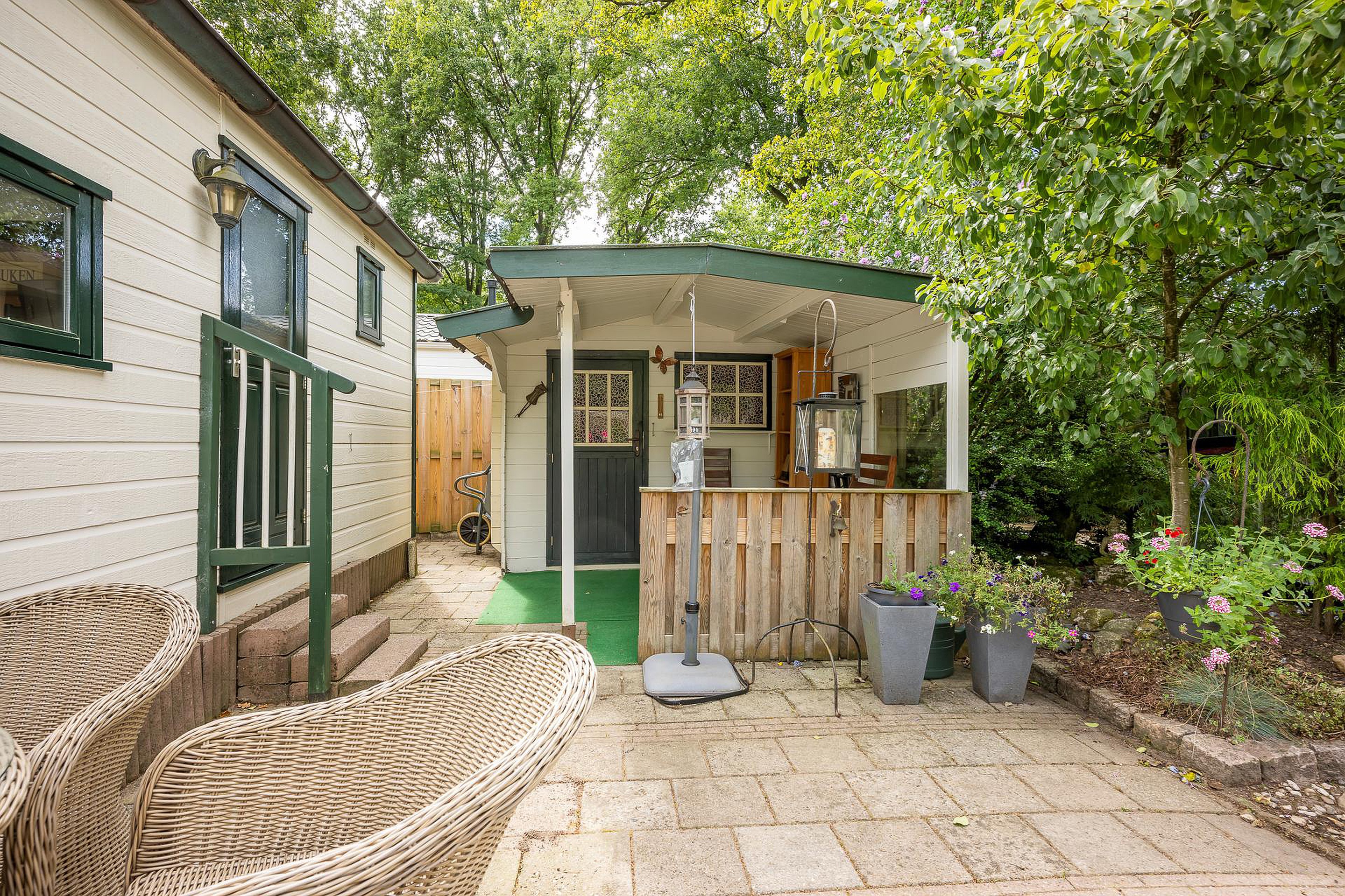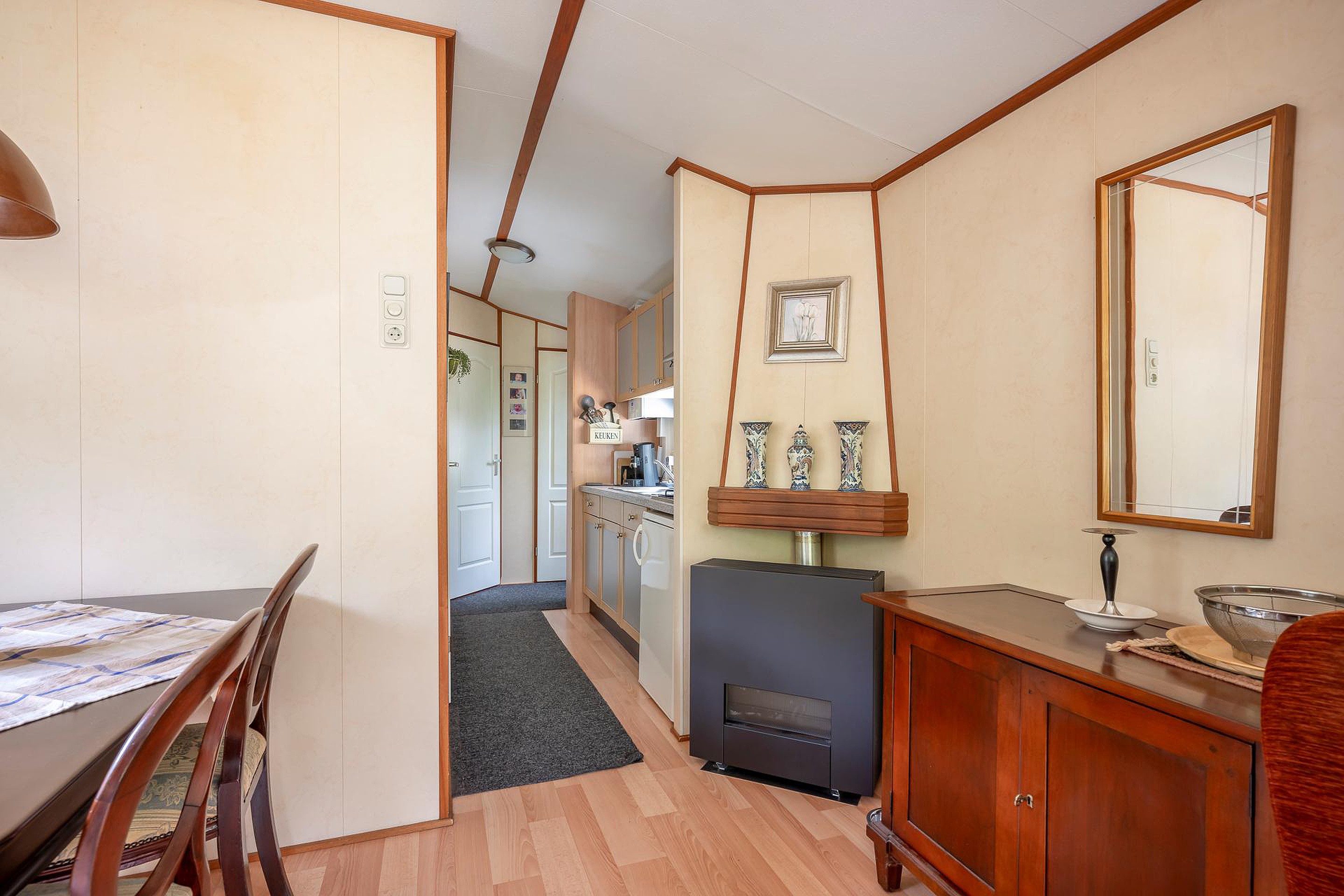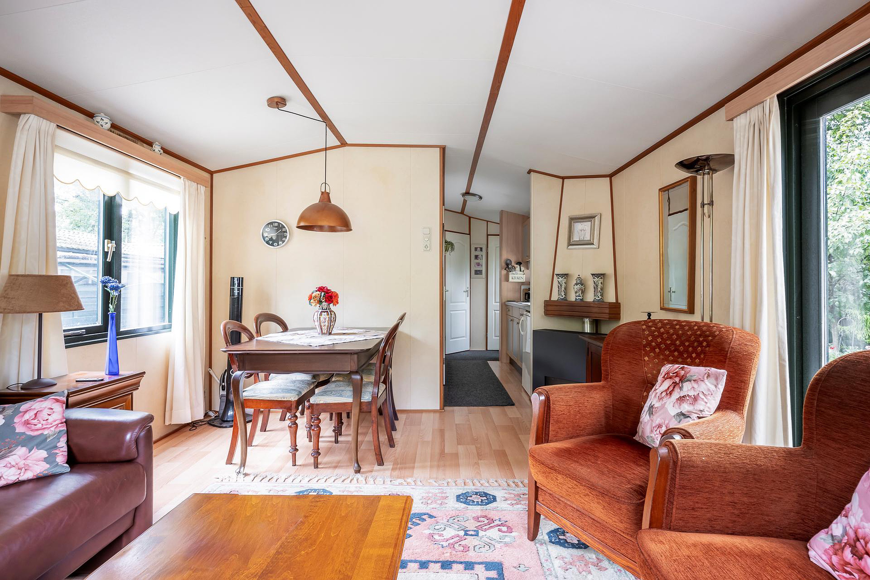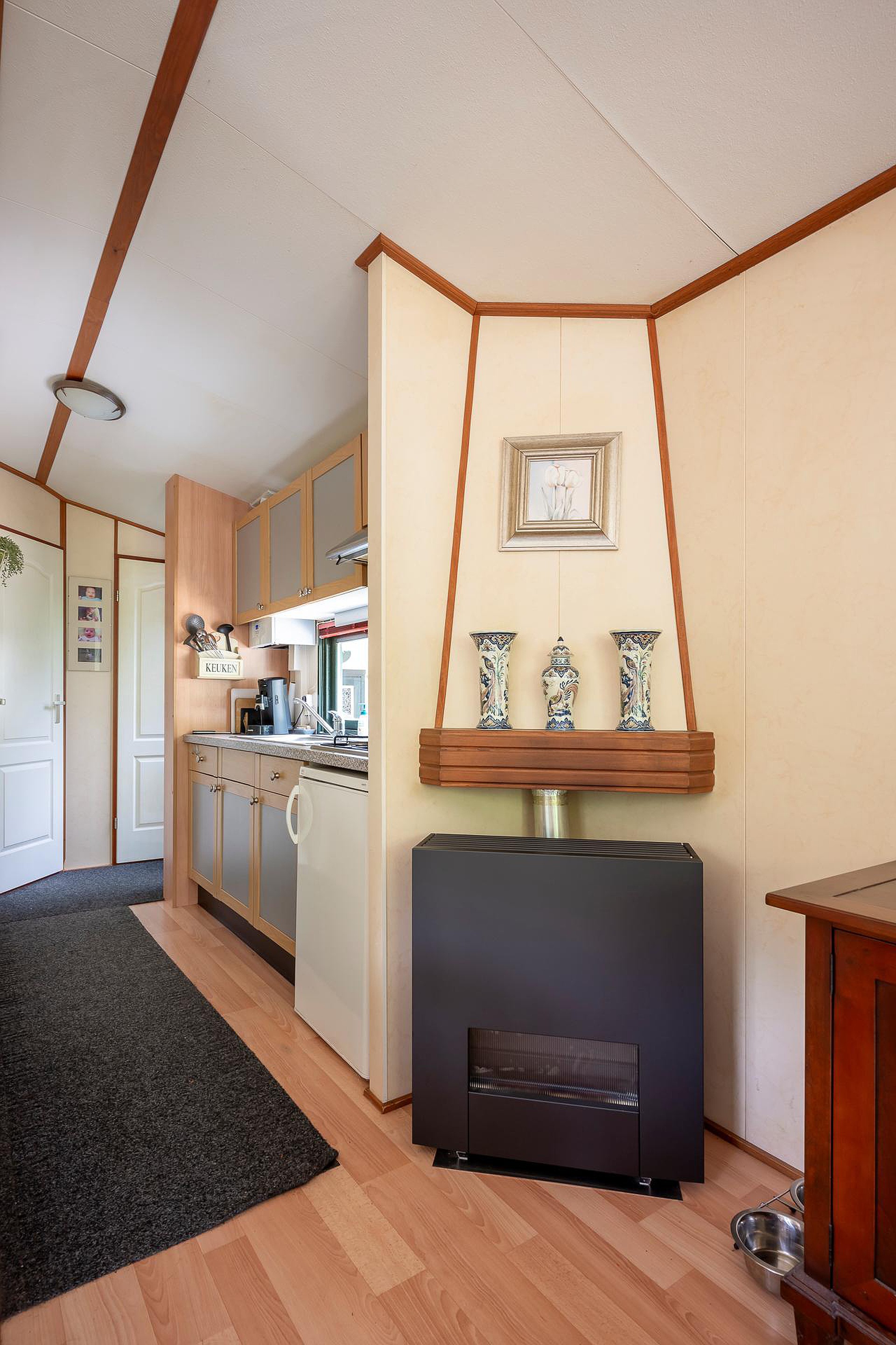 Begane grond naast de eigen parkeerplaats loop je door het hek naar zijkant chalet, opstap naar entree met garderobe-nis, 1 grote slaapkamer incl. vaste kast en 1 kleinere slaapkamer met 2 bedden en vaste kast, badkamer met douche-instap, toilet en wastafelmeubel/spiegel, keukeninrichting met 4-pits gaskookplaat en wasemkap, koelkast, geiser (Vaillant 2024), mooie living met gashaard en vrij nieuwe meubels, openslaande terrasdeuren (hardhout), erker aan voorzijde, vrijstaande tuinberging met overkapping.