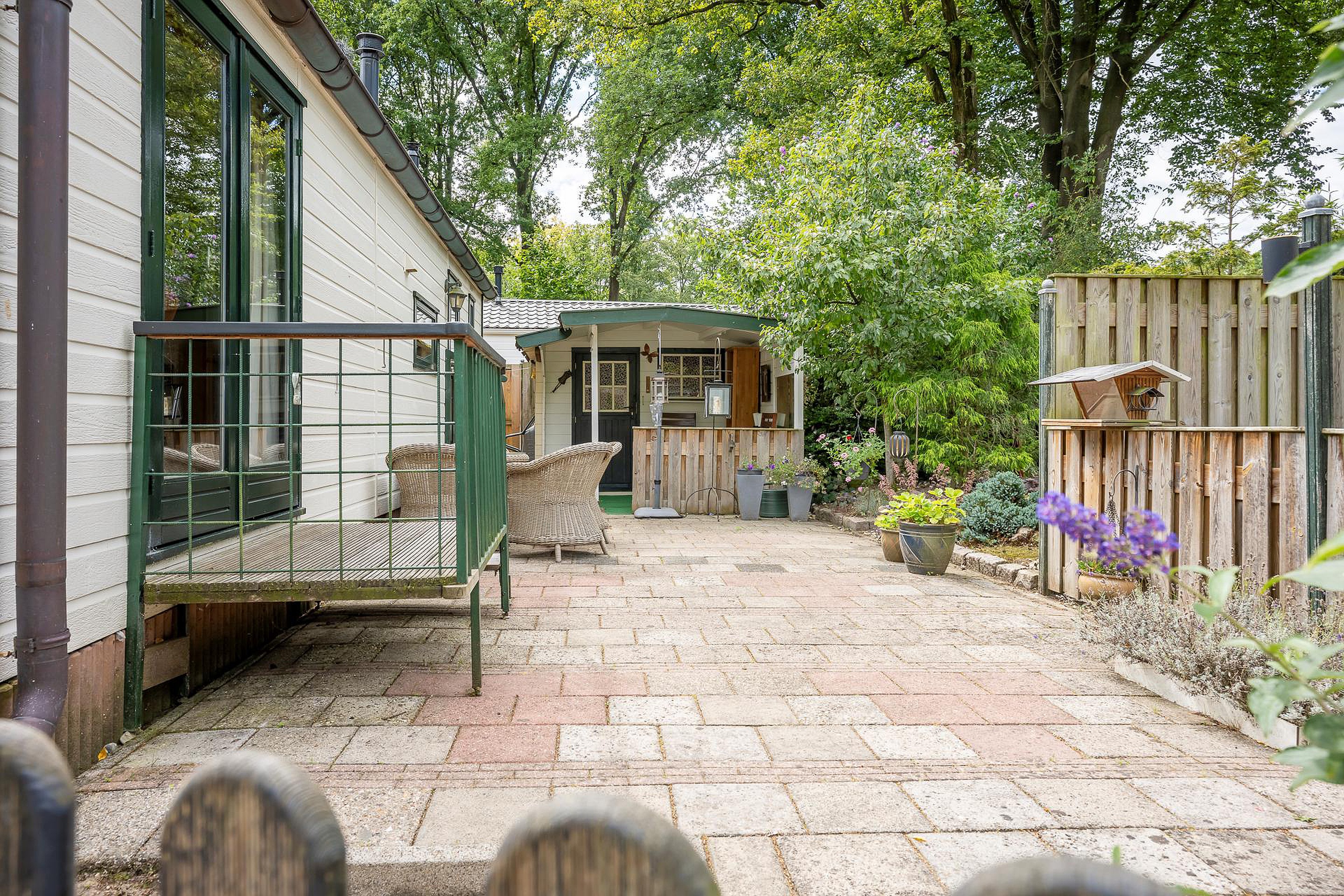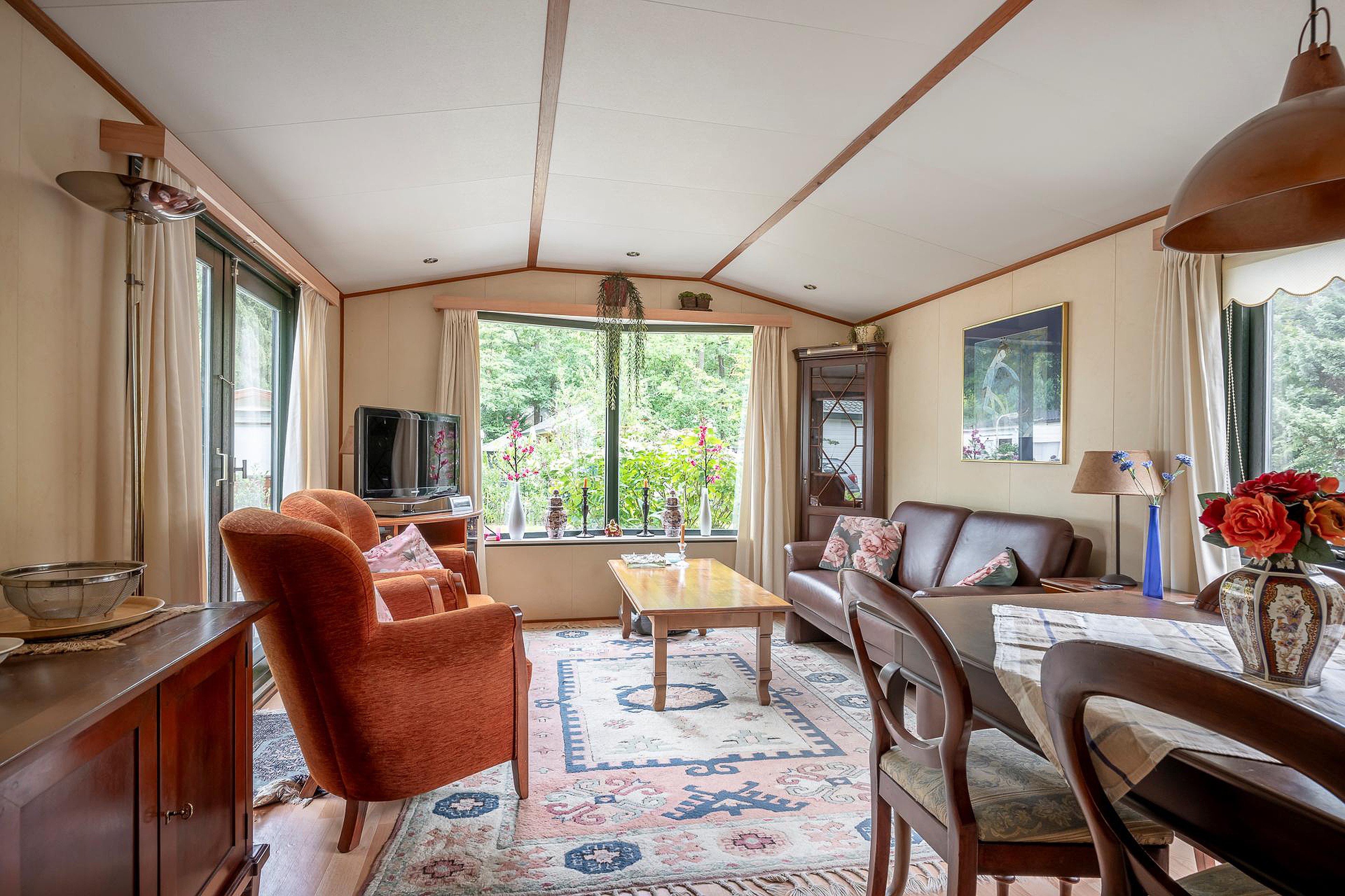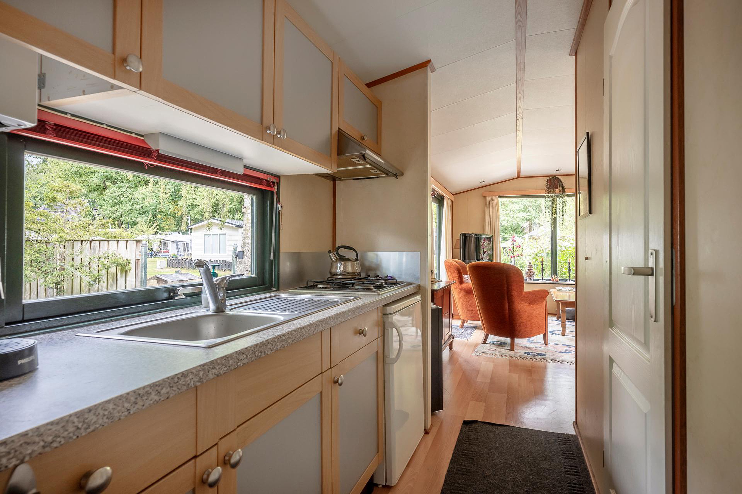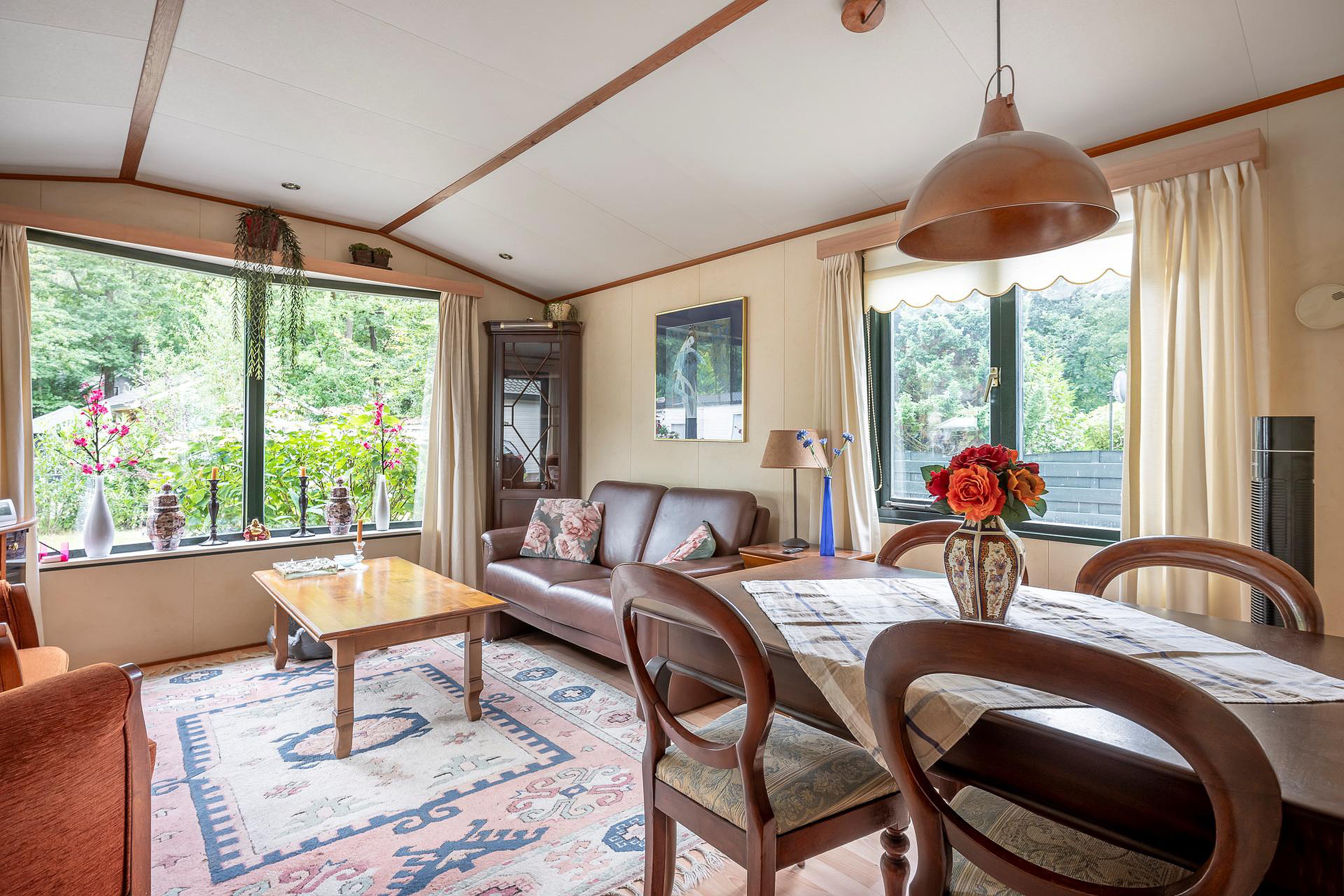 Begane grond naast de eigen parkeerplaats loop je door het hek naar zijkant chalet, opstap naar entree met garderobe-nis, 1 grote slaapkamer incl. vaste kast en 1 kleinere slaapkamer met 2 bedden en vaste kast, badkamer met douche-instap, toilet en wastafelmeubel/spiegel, keukeninrichting met 4-pits gaskookplaat en wasemkap, koelkast, geiser (Vaillant 2024), mooie living met gashaard en vrij nieuwe meubels, openslaande terrasdeuren (hardhout), erker aan voorzijde, vrijstaande tuinberging met overkapping.
