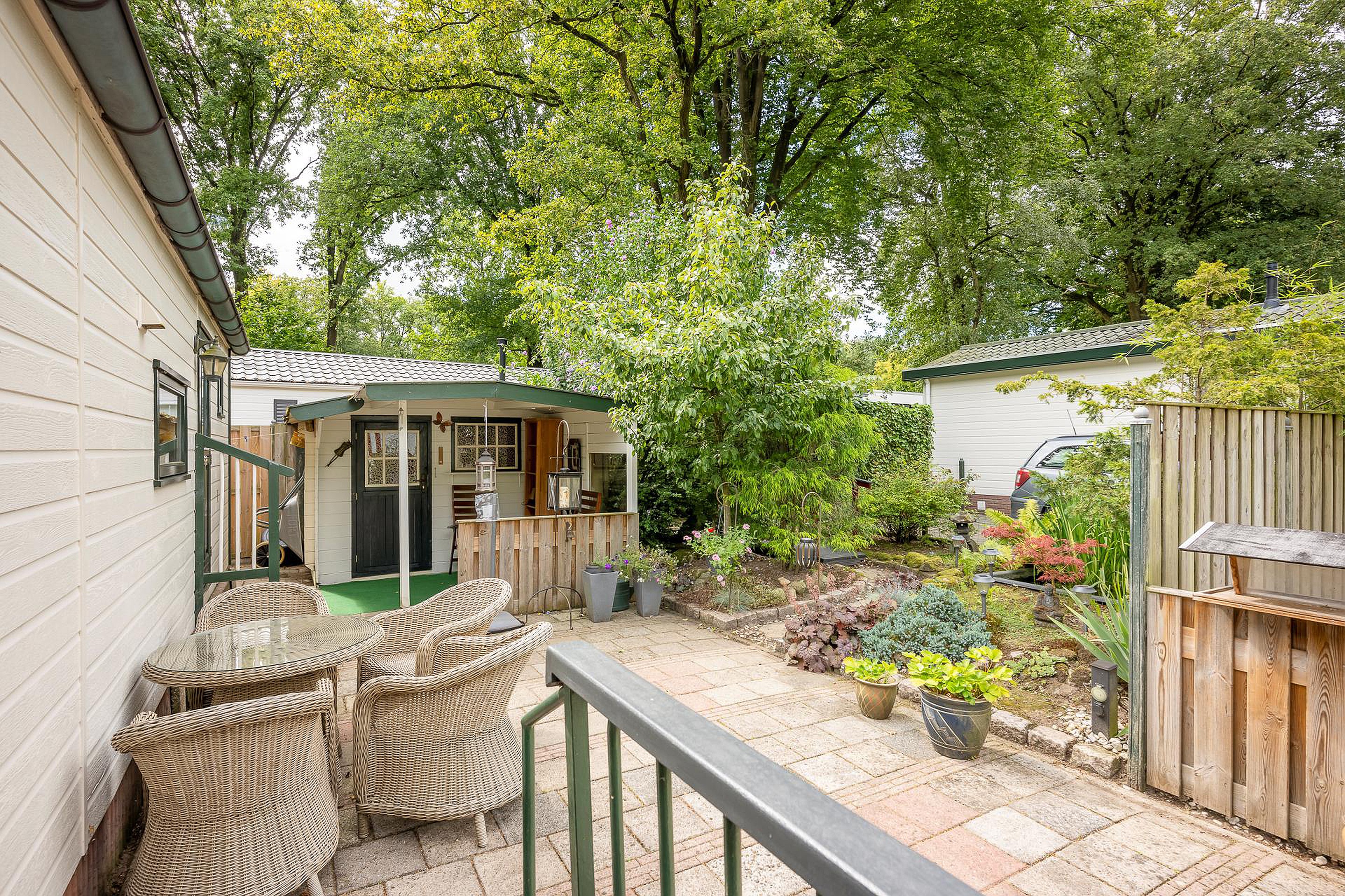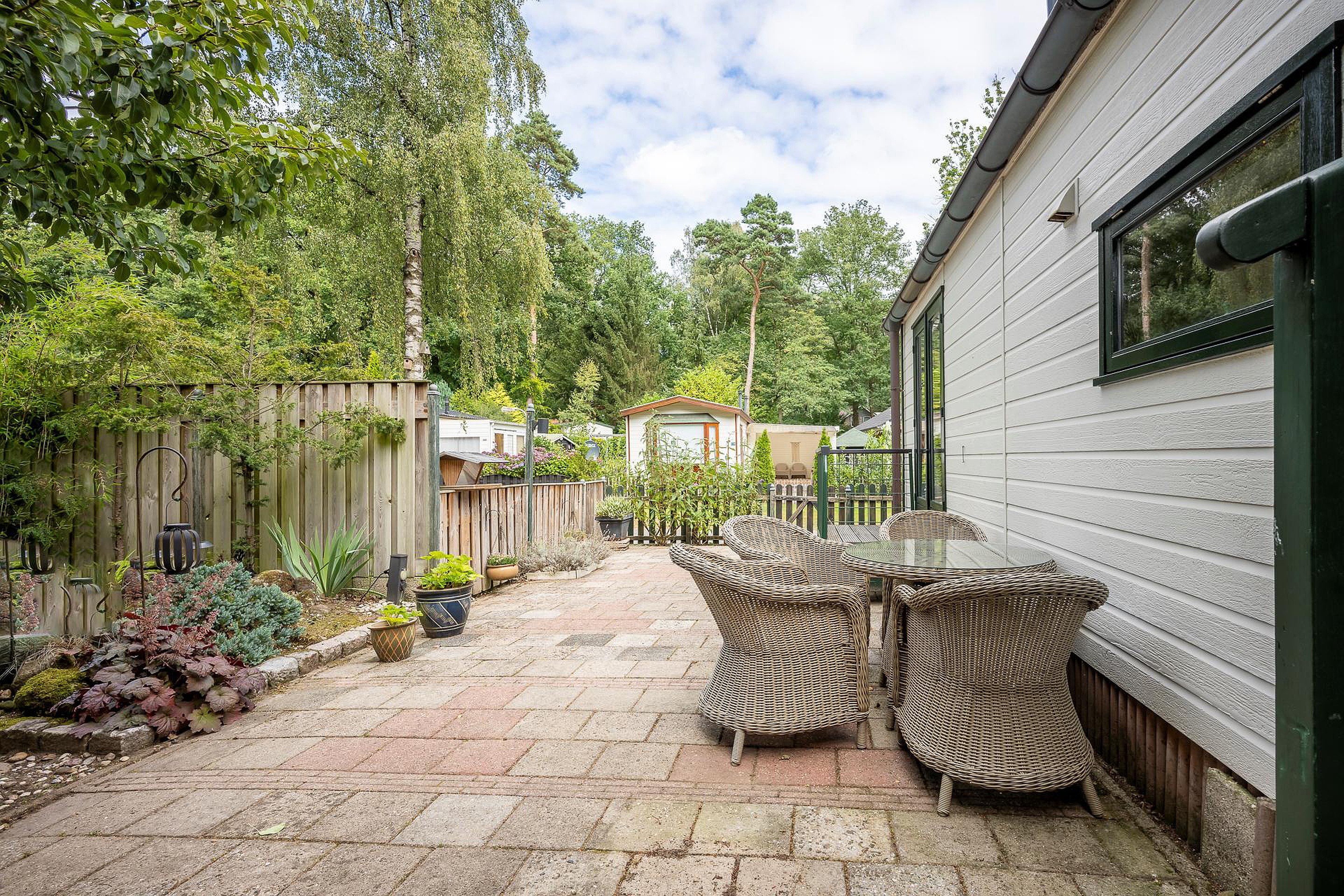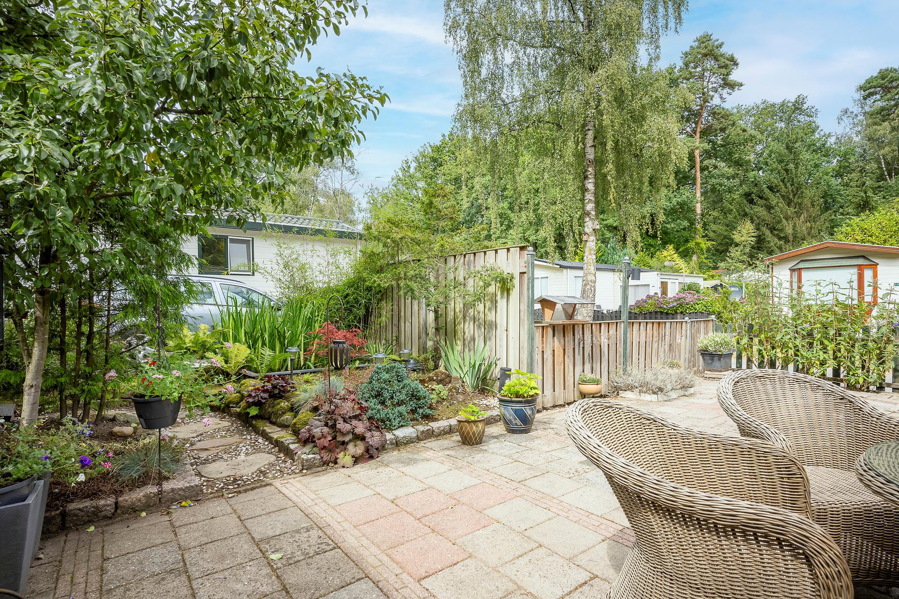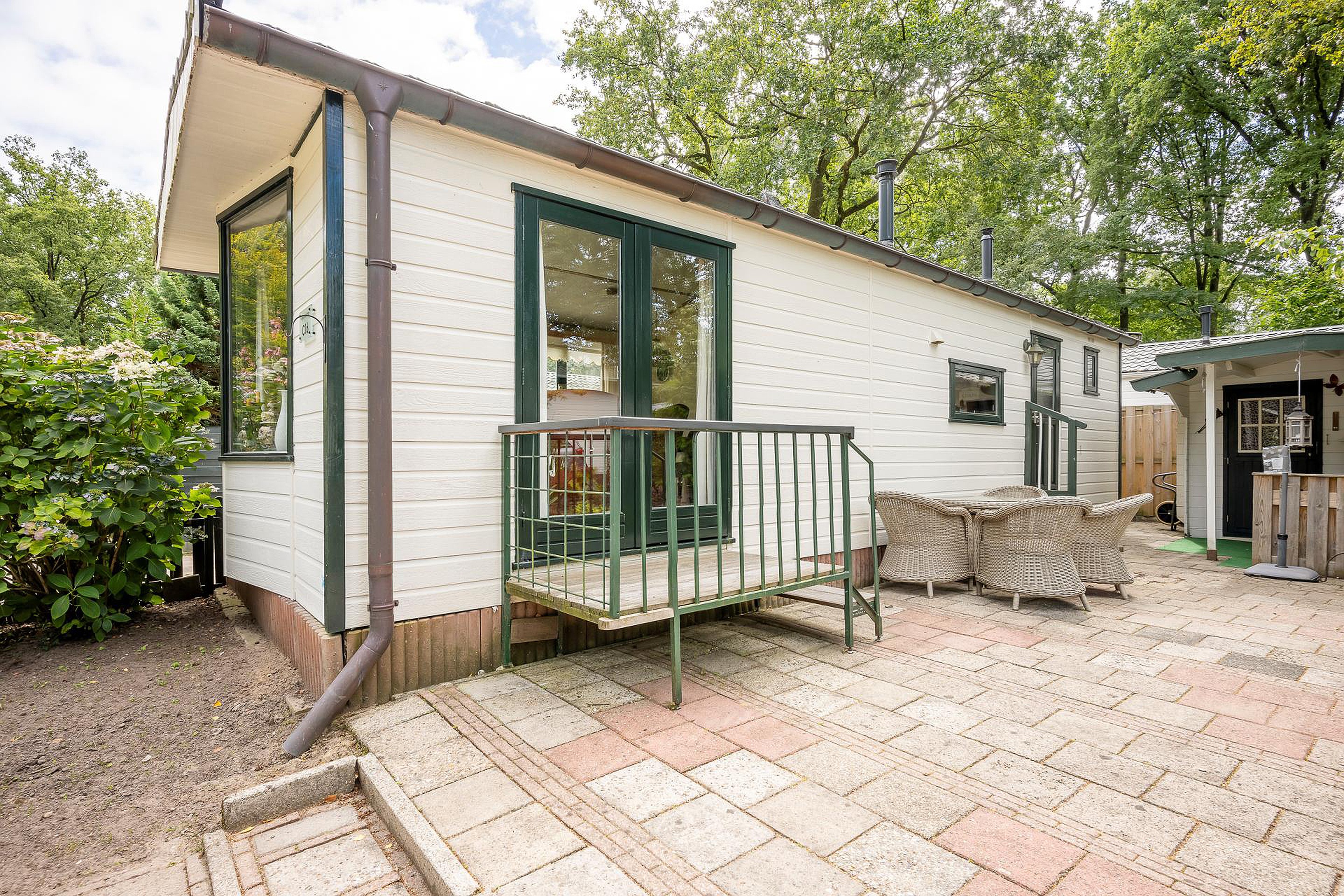 Begane grond naast de eigen parkeerplaats loop je door het hek naar zijkant chalet, opstap naar entree met garderobe-nis, 1 grote slaapkamer incl. vaste kast en 1 kleinere slaapkamer met 2 bedden en vaste kast, badkamer met douche-instap, toilet en wastafelmeubel/spiegel, keukeninrichting met 4-pits gaskookplaat en wasemkap, koelkast, geiser (Vaillant 2024), mooie living met gashaard en vrij nieuwe meubels, openslaande terrasdeuren (hardhout), erker aan voorzijde, vrijstaande tuinberging met overkapping.