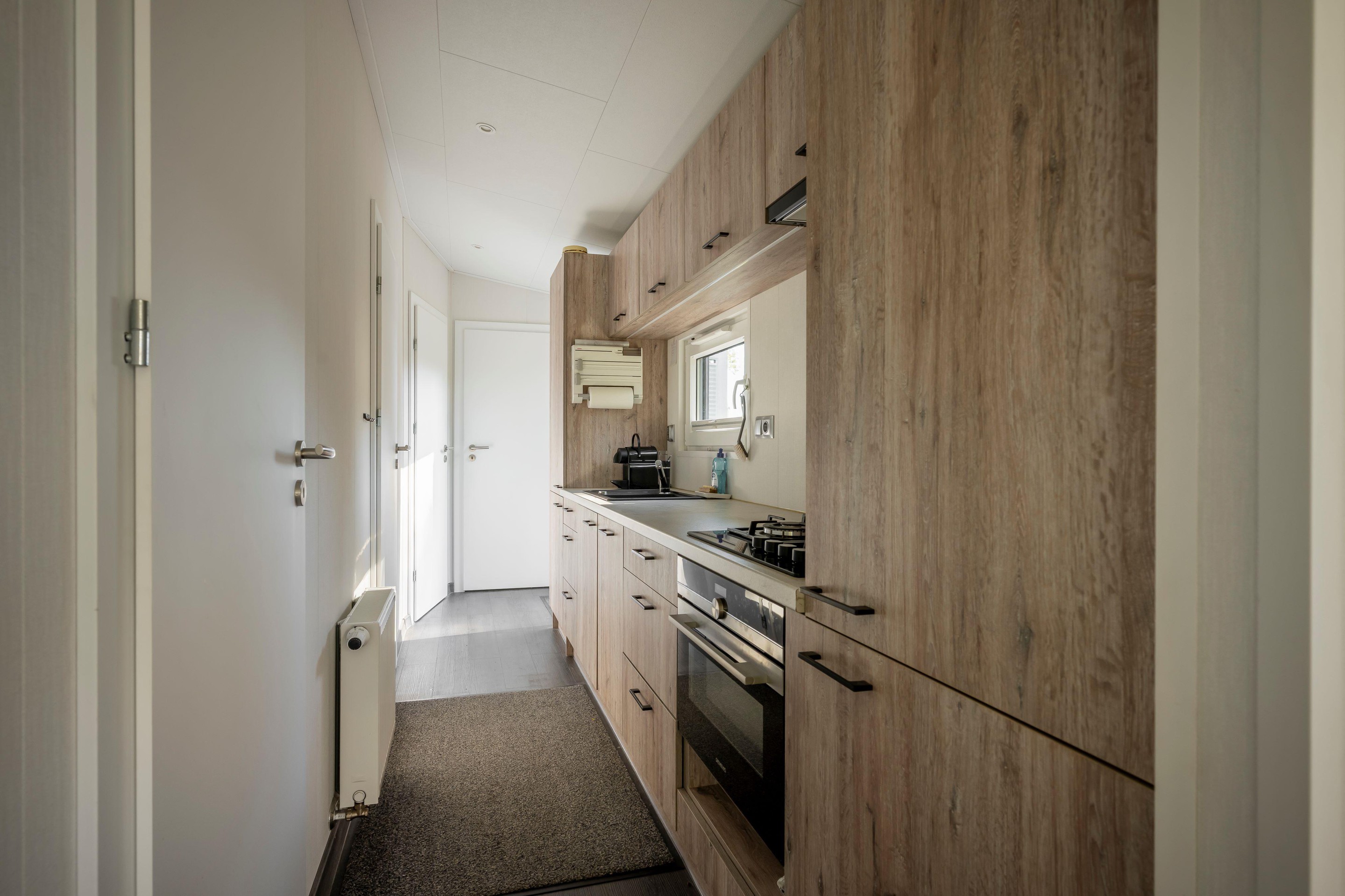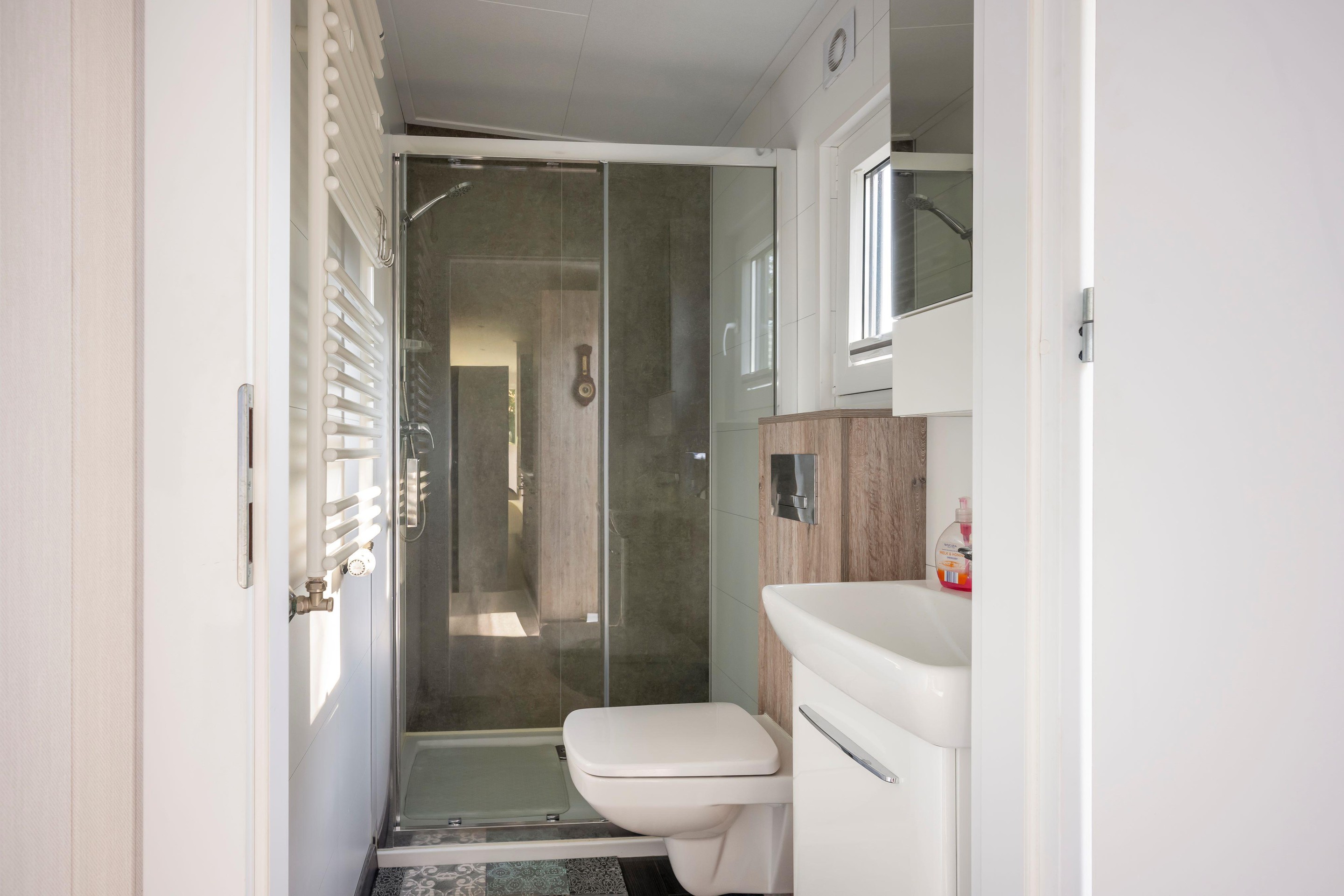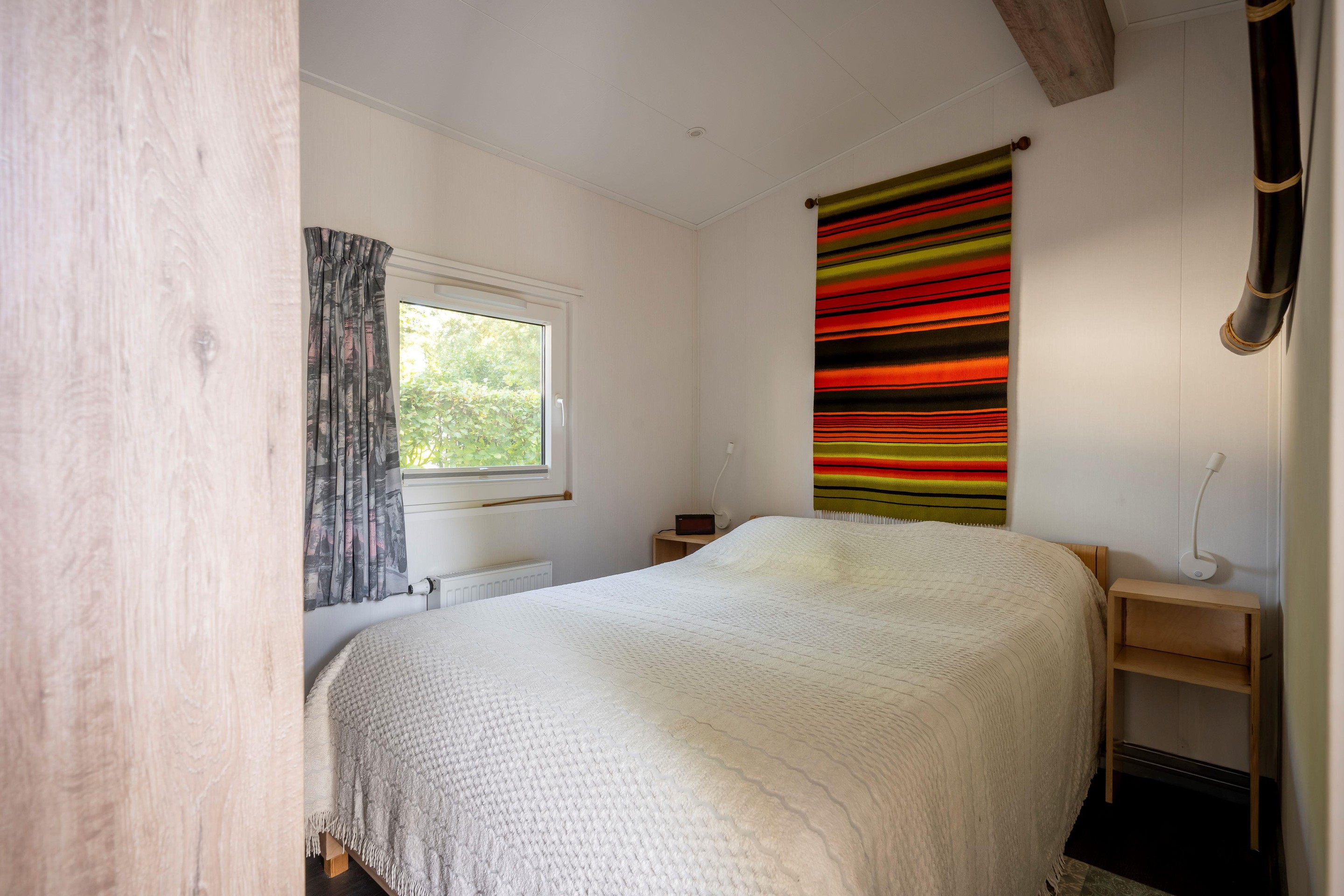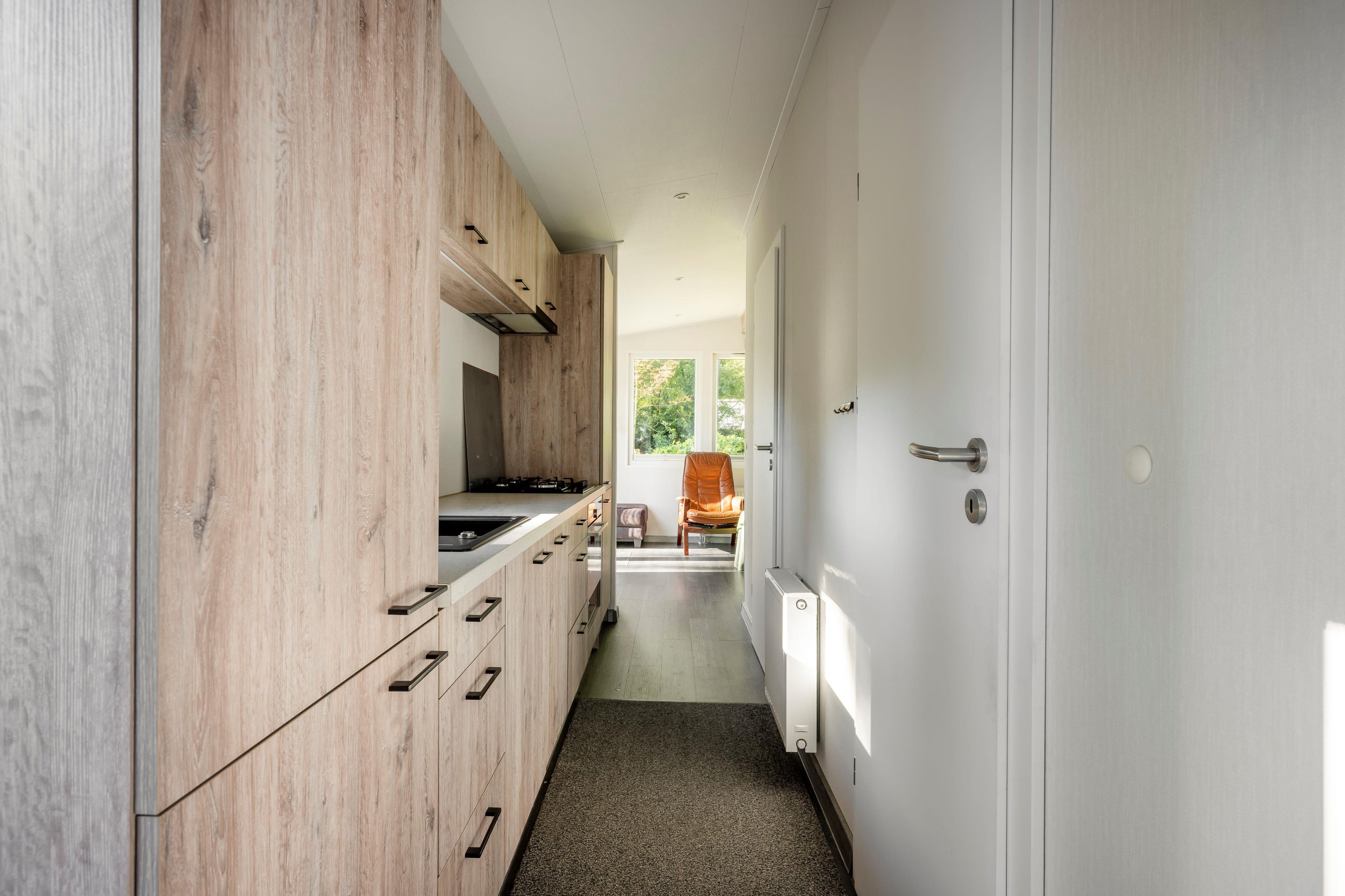 Begane grond naast de ruime eigen parkeerplaats loop je door naar het terras aan zijkant chalet, entree met garderobe-nis, 1 grote slaapkamer incl. vaste schuifdeurkasten en 2 kleinere slaapkamers met 2 bedden en vaste wandkasten, badkamer met douche-instap, toilet, wastafelmeubel/spiegel, designradiator, keukeninrichting met 4-pits gaskookplaat en wasemkap, vaatwasser, koelkast, geiser, mooie living met openslaande terrasdeuren, vrijstaande tuinberging