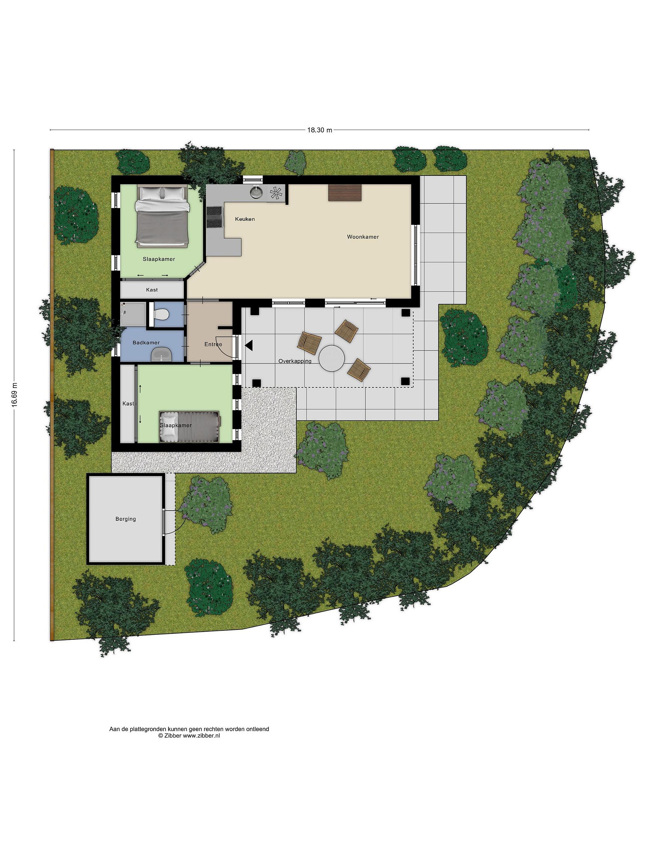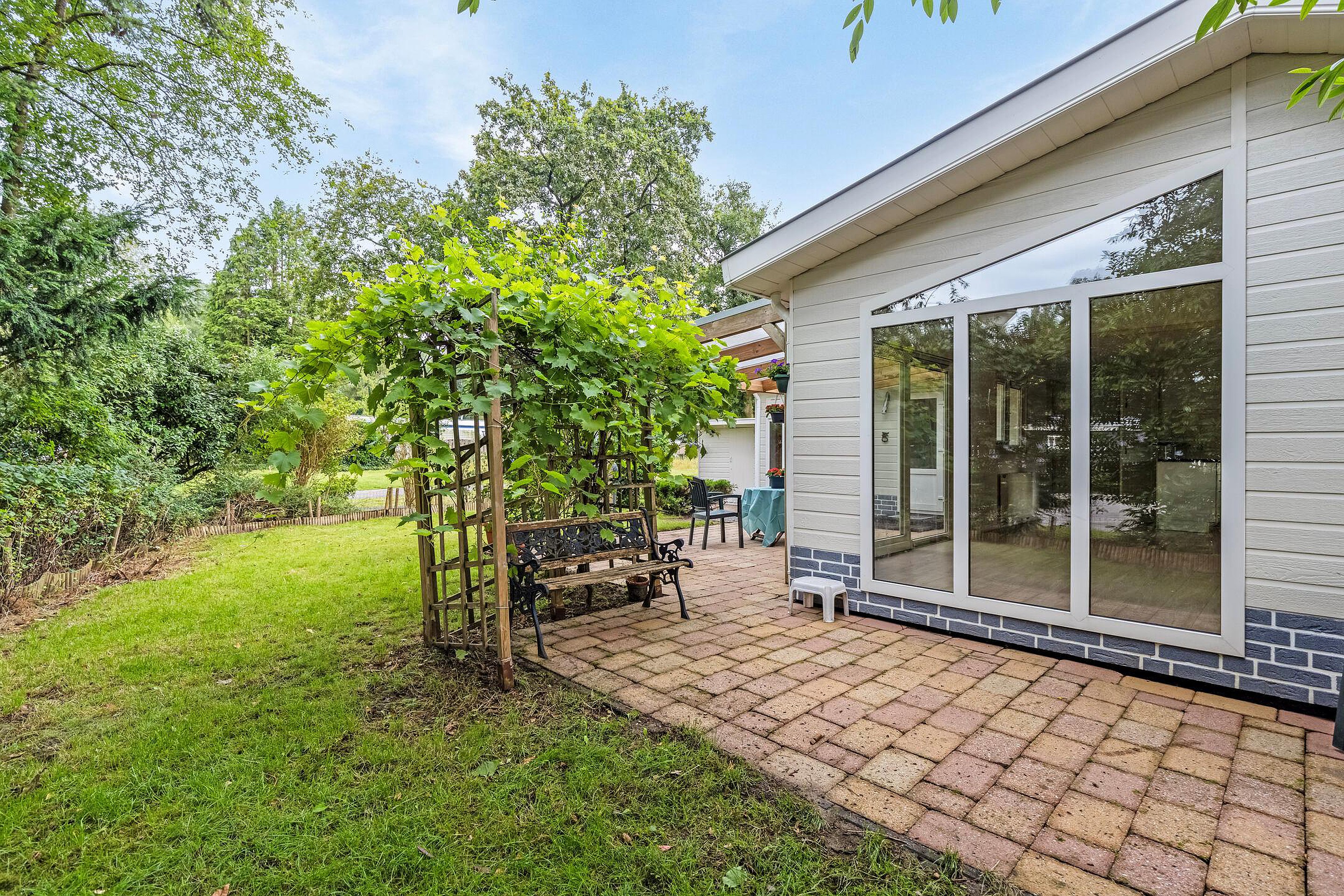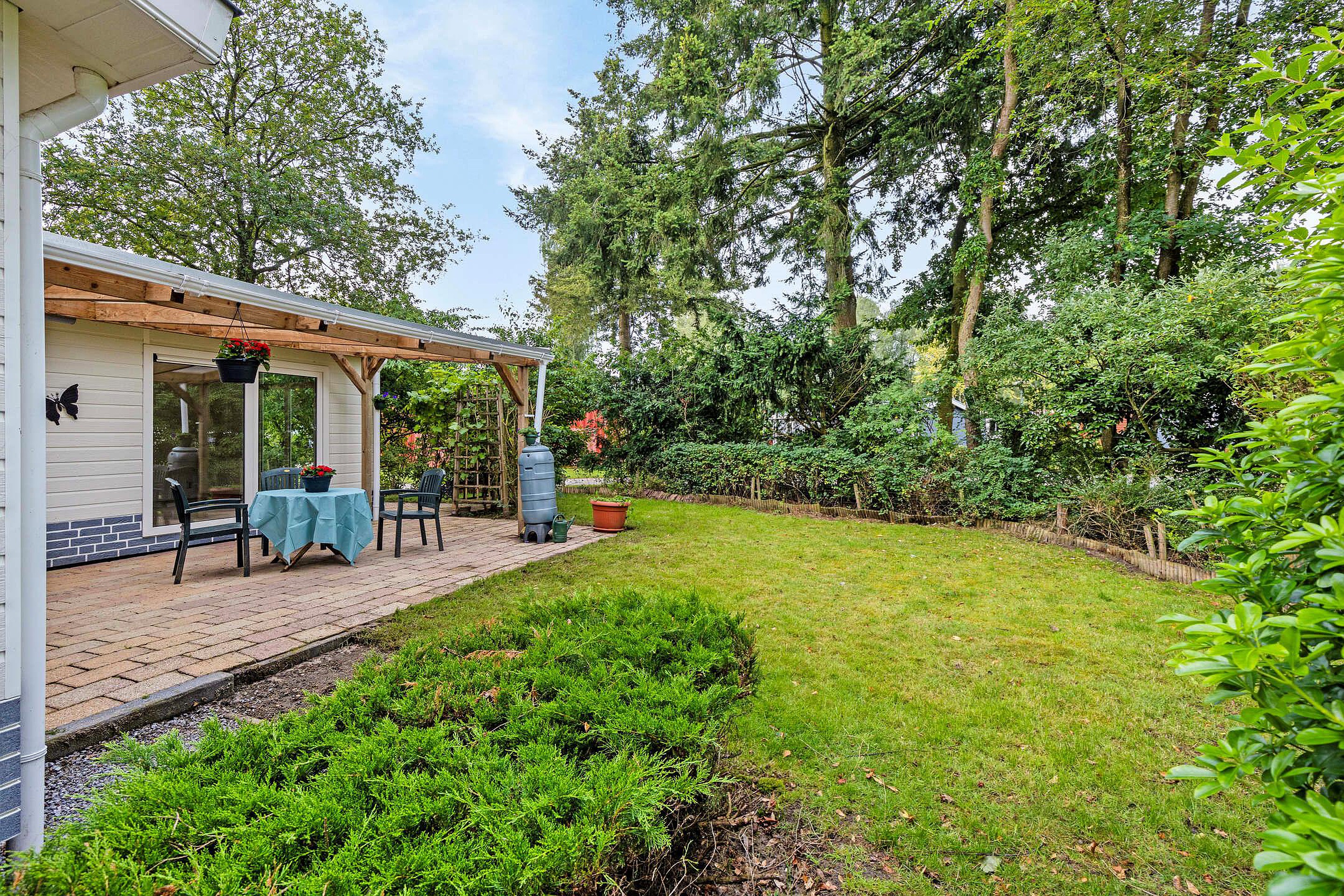 Rondom de chaletwoning is een groene tuin aanwezig. De tuin is goed onderhouden en voorzien van een terras. Hiermee is het geschikt voor een lounge set of buitentafel en vormt het de ideale plek om te ontspannen. Het terras is overkapt, waardoor u geniet u van veel privacy. De ligging is ideaal om volop van de zonuren te genieten. Een extra berging maakt het mogelijk om tuinspullen te stallen. U auto kunt u op eigen terrein parkeren. Het chalet is gelegen op een perceel met erfpacht tot 2043 ( verlenging in overleg).