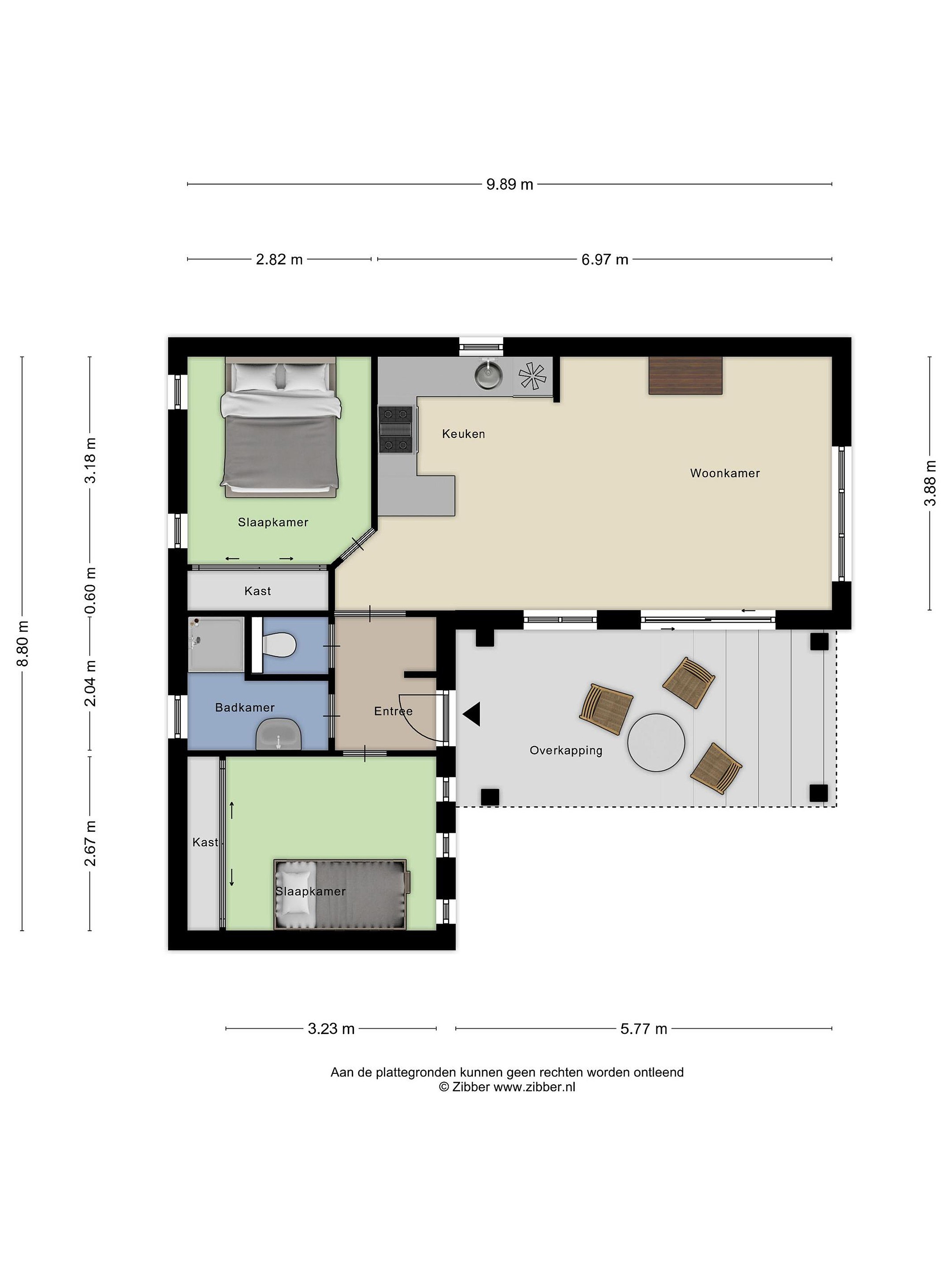 Vanaf het eigen terras betreedt u de woning. Daarbij arriveert u in een afgesloten hal. Deze grenst aan twee slaapkamers, de toilet, badkamer en de woonkamer met open keuken. De hal is ruim genoeg om een kapstok of opbergmeubel te plaatsen.