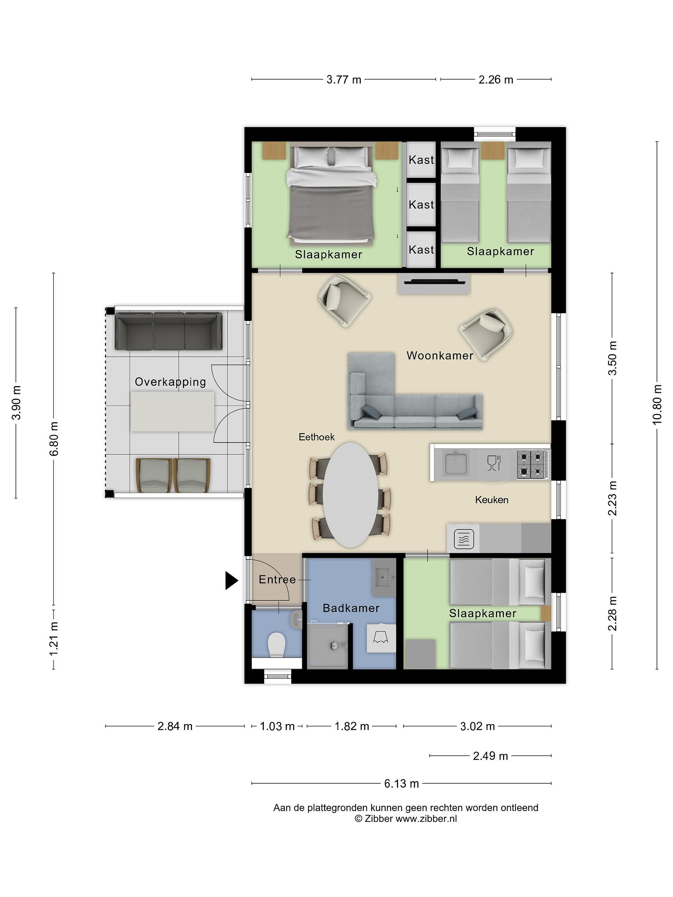 De bungalow beschikt over drie slaapkamers, elk met een eigen karakter en geschikt voor verschillende doeleinden. De hoofdslaapkamer is rustig gelegen en biedt voldoende ruimte voor een tweepersoonsbed en er is een ruime inbouwkast aanwezig. De twee overige slaapkamers zijn ideaal als logeer- of kinderkamer en beiden voorzien van handige bovenkasten. De badkamer is modern uitgevoerd en voorzien van een douche, wastafelmeubel en aansluitingen voor de wasmachine. Daarnaast is er een separaat toilet, wat het comfort compleet maakt.