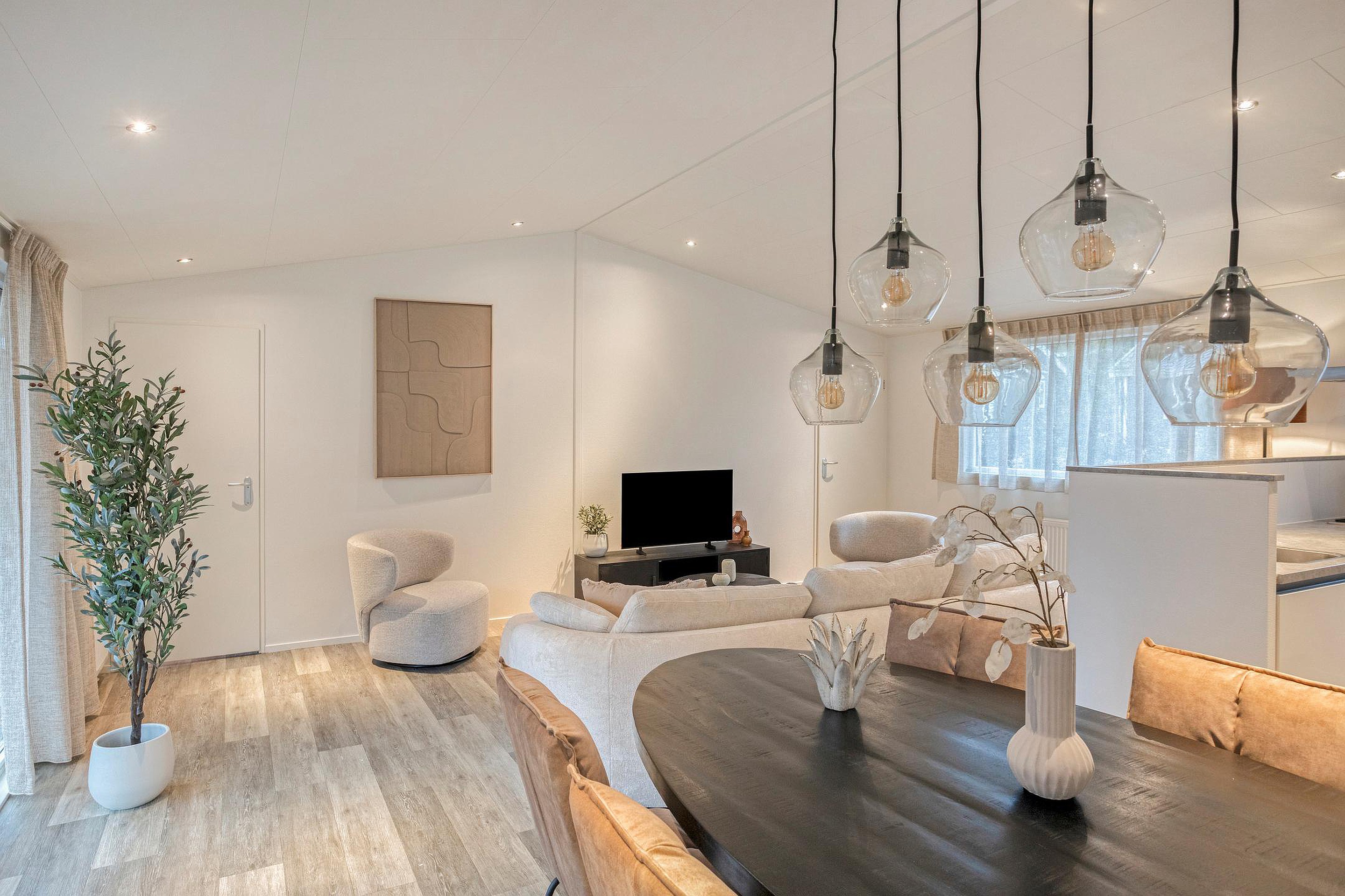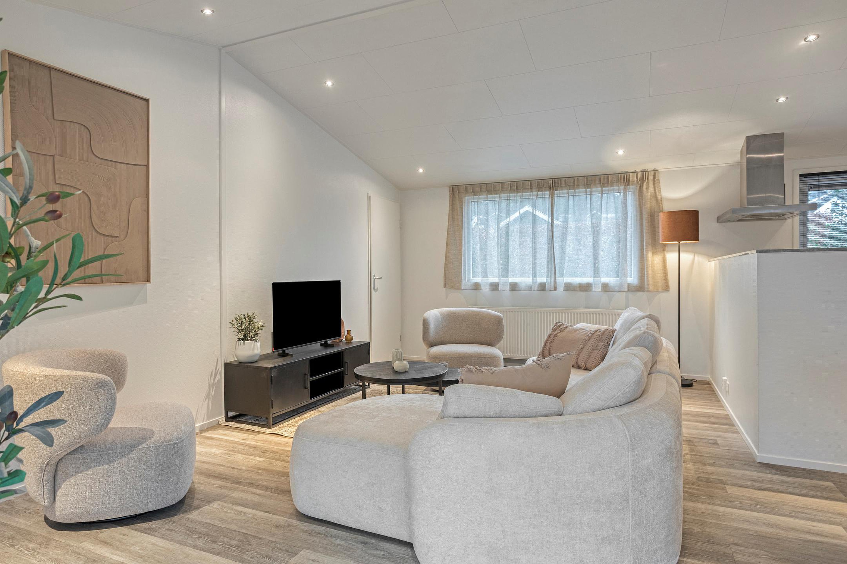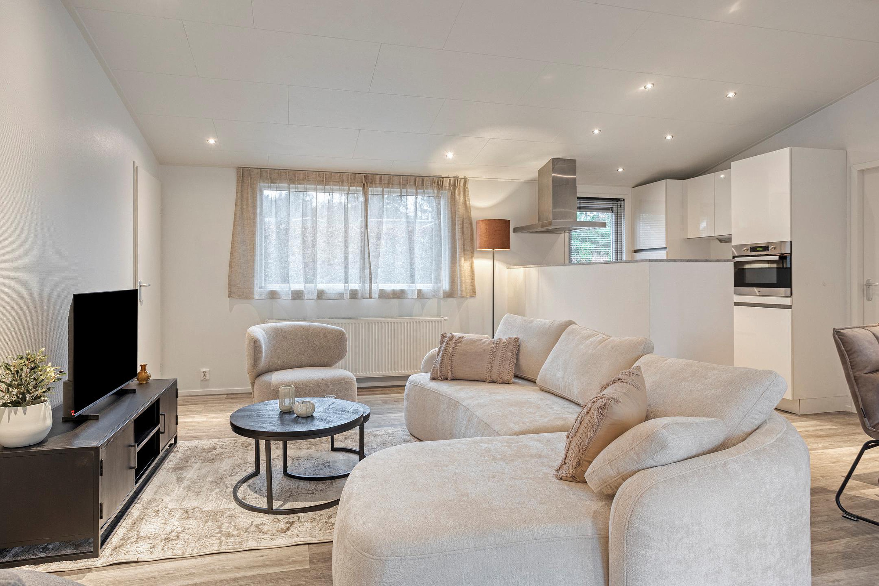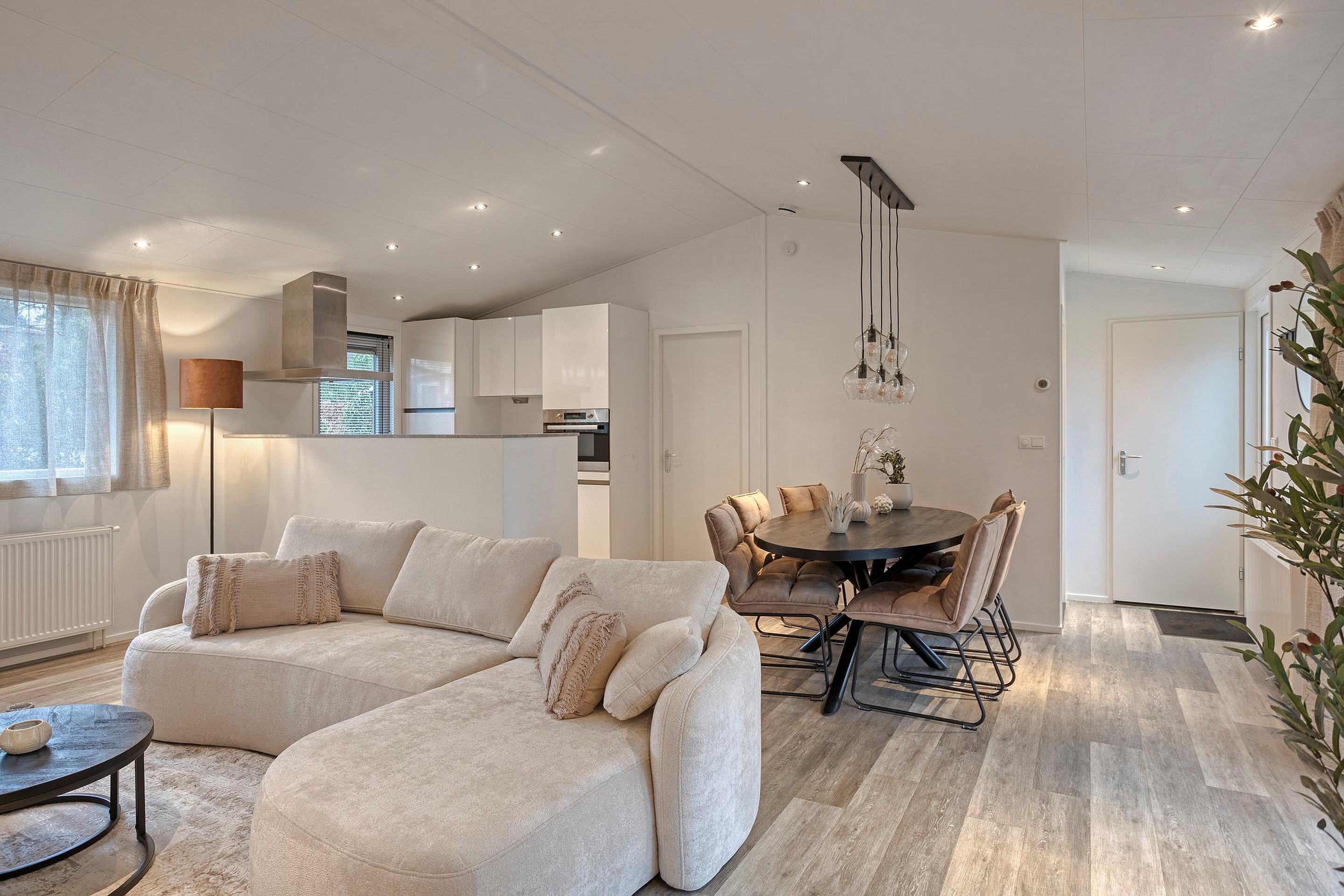 Via de entree stapt u binnen in een lichte en prettig ingedeelde bungalow. De woonkamer vormt samen met de eetruimte een open leefgedeelte, waar grote ramen zorgen voor een fijne lichtinval en zicht op het groen rondom. De zithoek is ruim genoeg voor een comfortabele opstelling en sluit logisch aan op de eethoek en de open keuken.