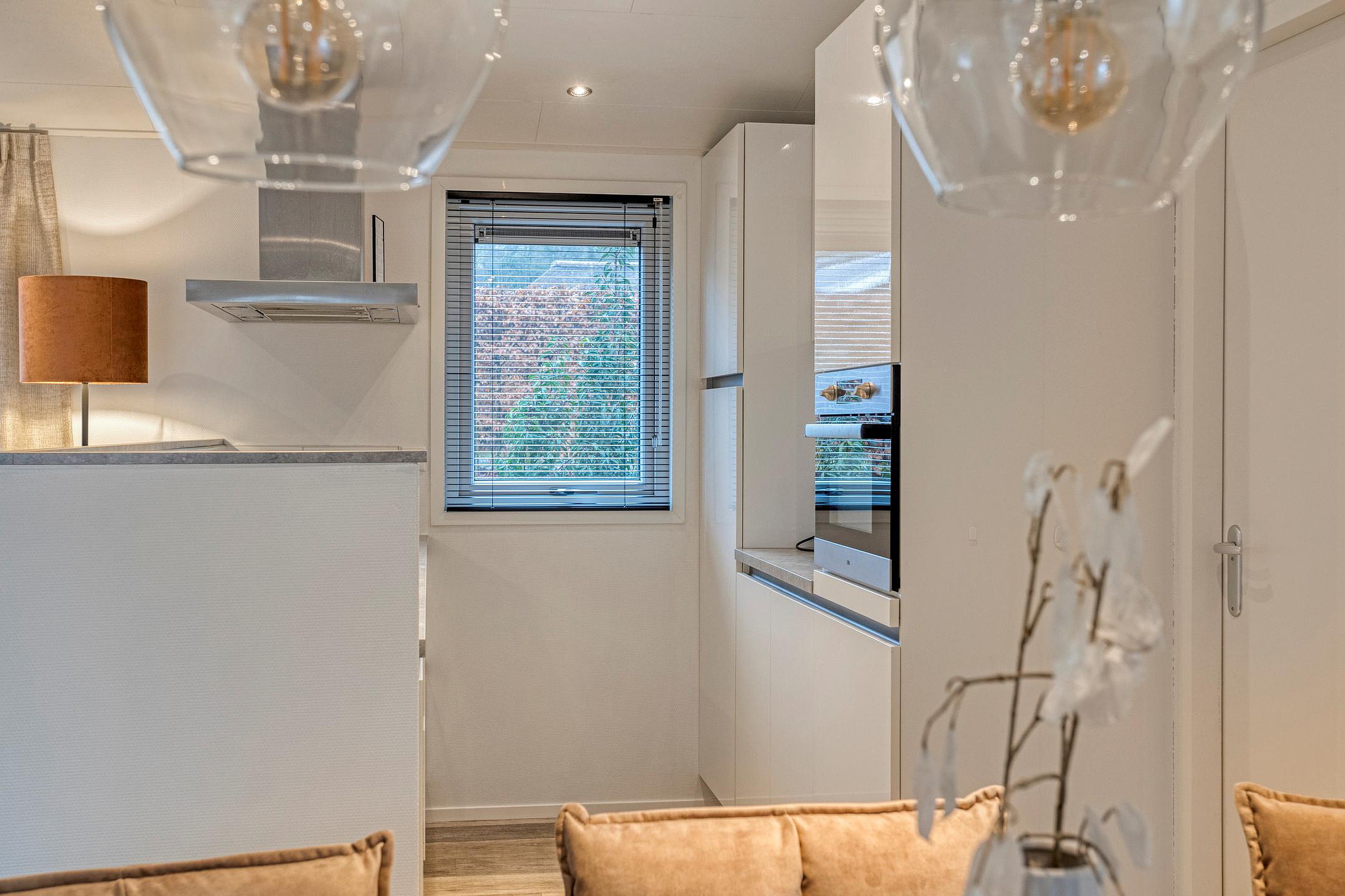 De keuken is strak uitgevoerd en voorzien van moderne inbouwapparatuur zoals een gaskookplaat, afzuigkap, combi-oven, koelkast en een vaatwasser. Daarnaast is er voldoende werk- en bergruimte. Vanuit de woonkamer is er direct toegang tot de overdekte veranda, waardoor binnen en buiten moeiteloos in elkaar overlopen.