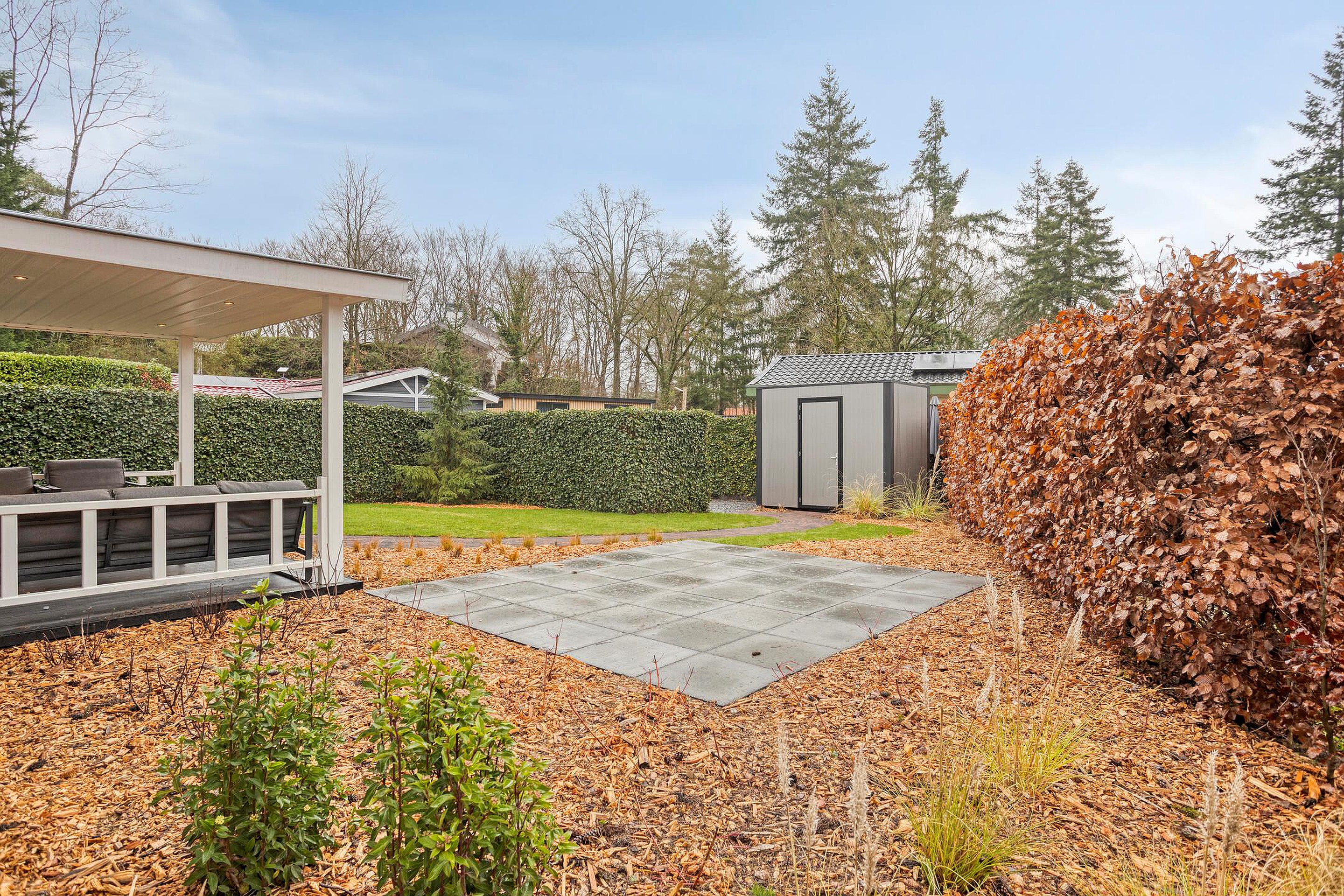 Rondom de woning ligt een ruime tuin met meerdere terrassen en een overdekte veranda waar u beschut kunt zitten, ongeacht het seizoen. De tuin is fraai aangelegd met gazon, hagen en volwassen beplanting, wat zorgt voor een groene en rustige uitstraling. Dankzij de ligging en de erfafscheiding geniet u hier van veel privacy. Achter op het perceel staat een vrijstaande berging, ideaal voor fietsen, tuinmeubilair of opslag, en u parkeert eenvoudig op eigen terrein. De combinatie van open ruimte en beschutte plekken maakt de buitenruimte veelzijdig en uitnodigend.