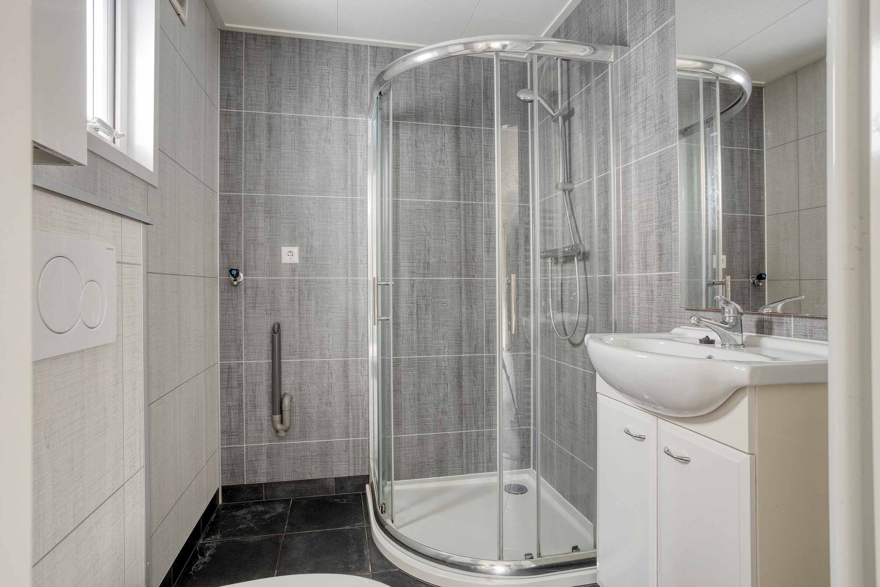 De moderne badkamer grenst aan de keuken en is netjes afgewerkt. U vindt hier een halfronde douchecabine, een zwevend toilet en een wastafel met opbergmeubel. Daarnaast is er een aansluiting voor witgoed aanwezig, wat het geheel extra praktisch maakt.