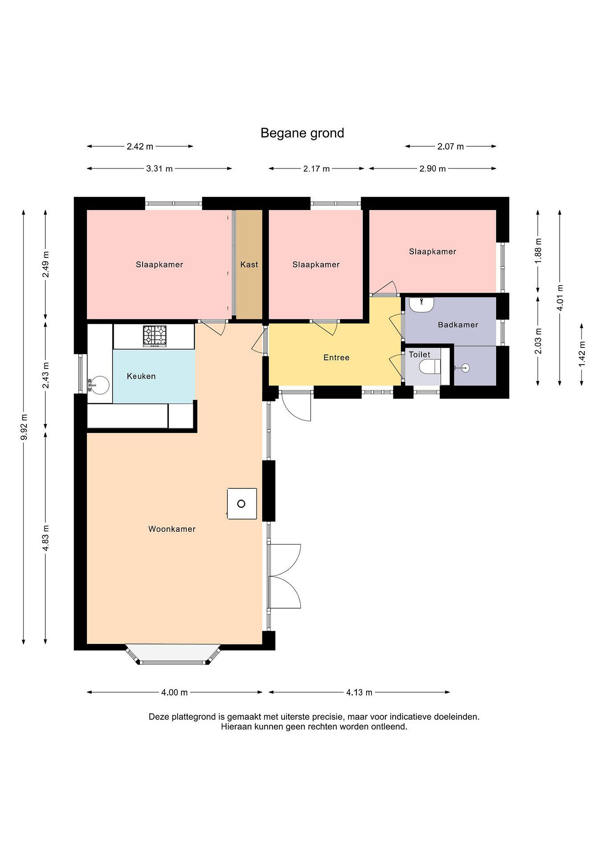 Begane grond entree, woonkamer met openslaande deuren, palletkachel en airco. U-vormige keuken voorzien van 4 pits gasfornuis met afzuigkap en vaatwasser. Verder zijn er 3 slaapkamers, een separaat toilet en een badkamer voorzien van wastafel en douchecabine.