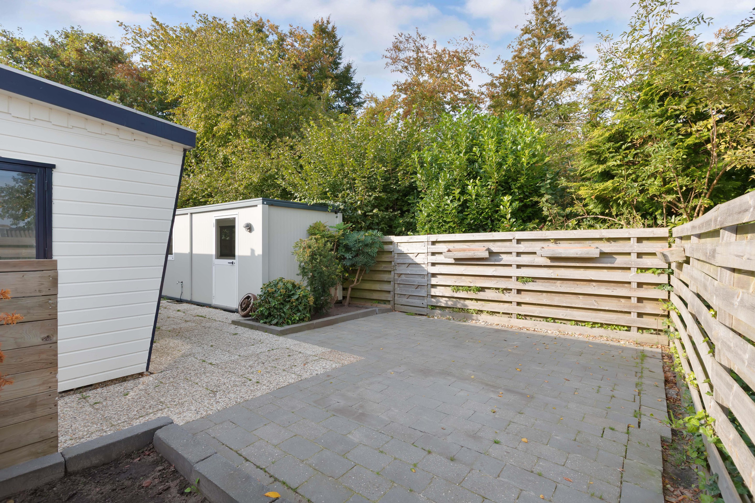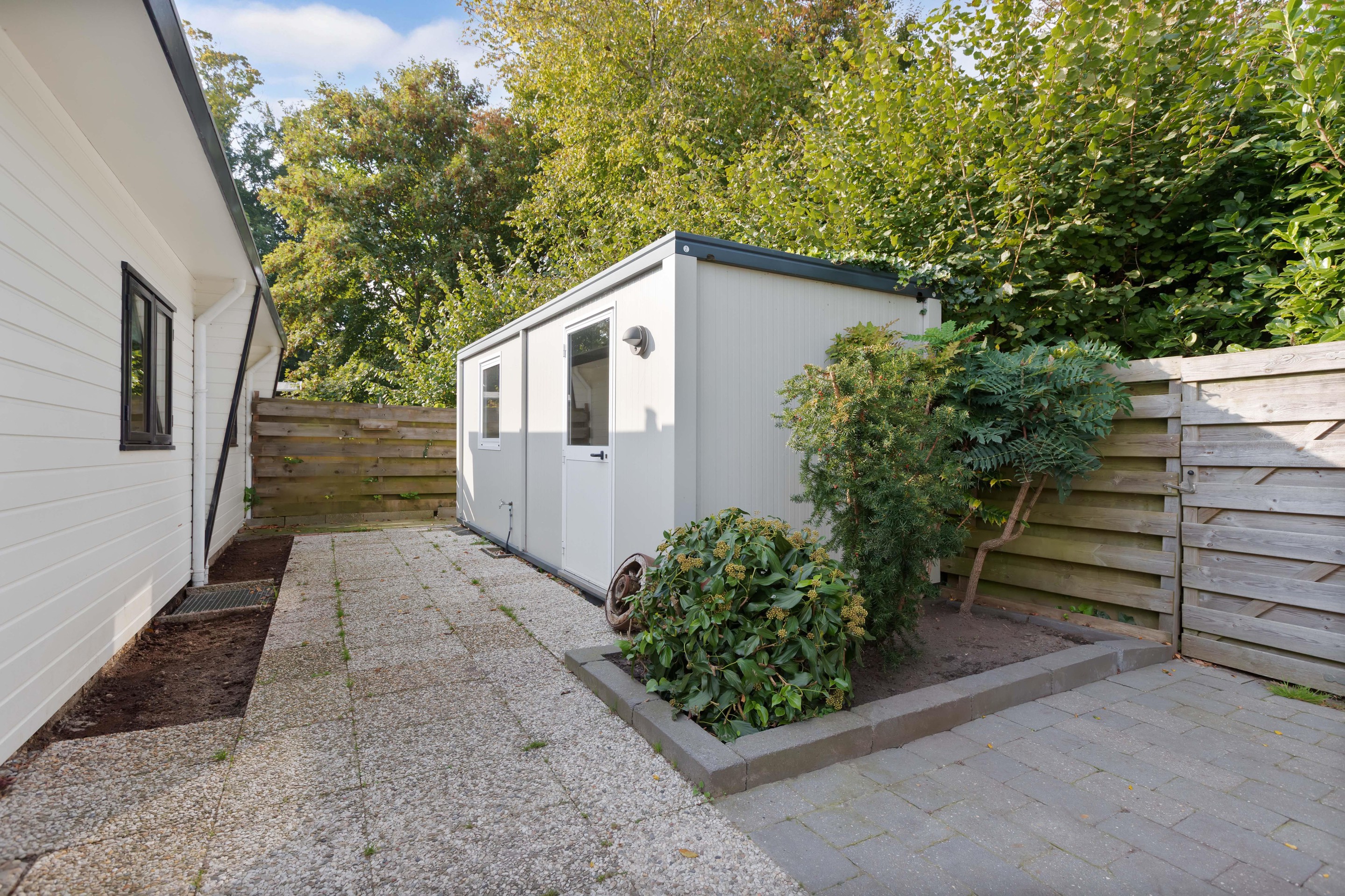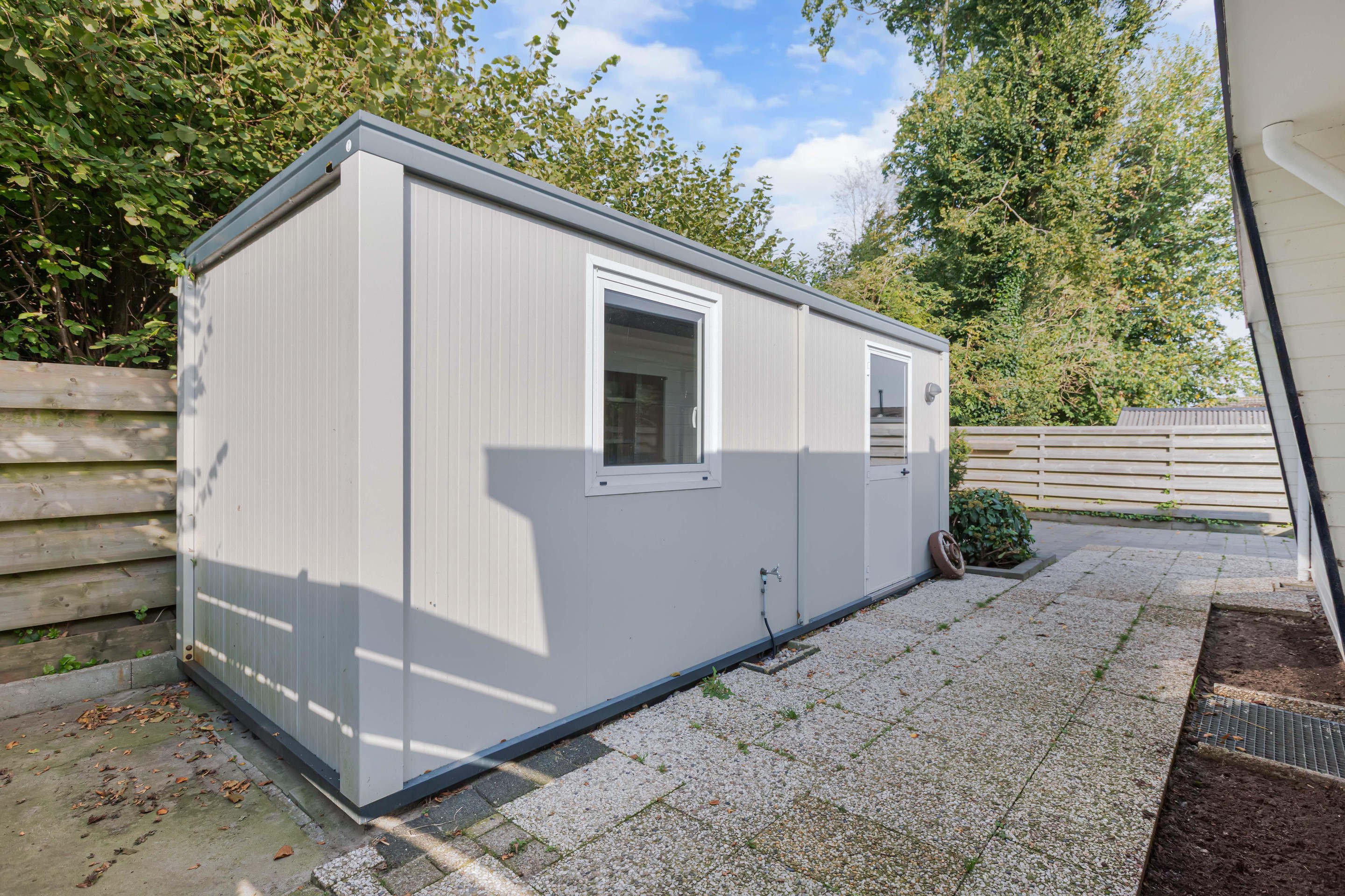De tuin rondom biedt volop ruimte om buiten te zitten of te tuinieren, en de onderhoudsvriendelijke kunststof berging met witgoedaansluitiing is handig voor het opbergen van fietsen of tuingereedschap.