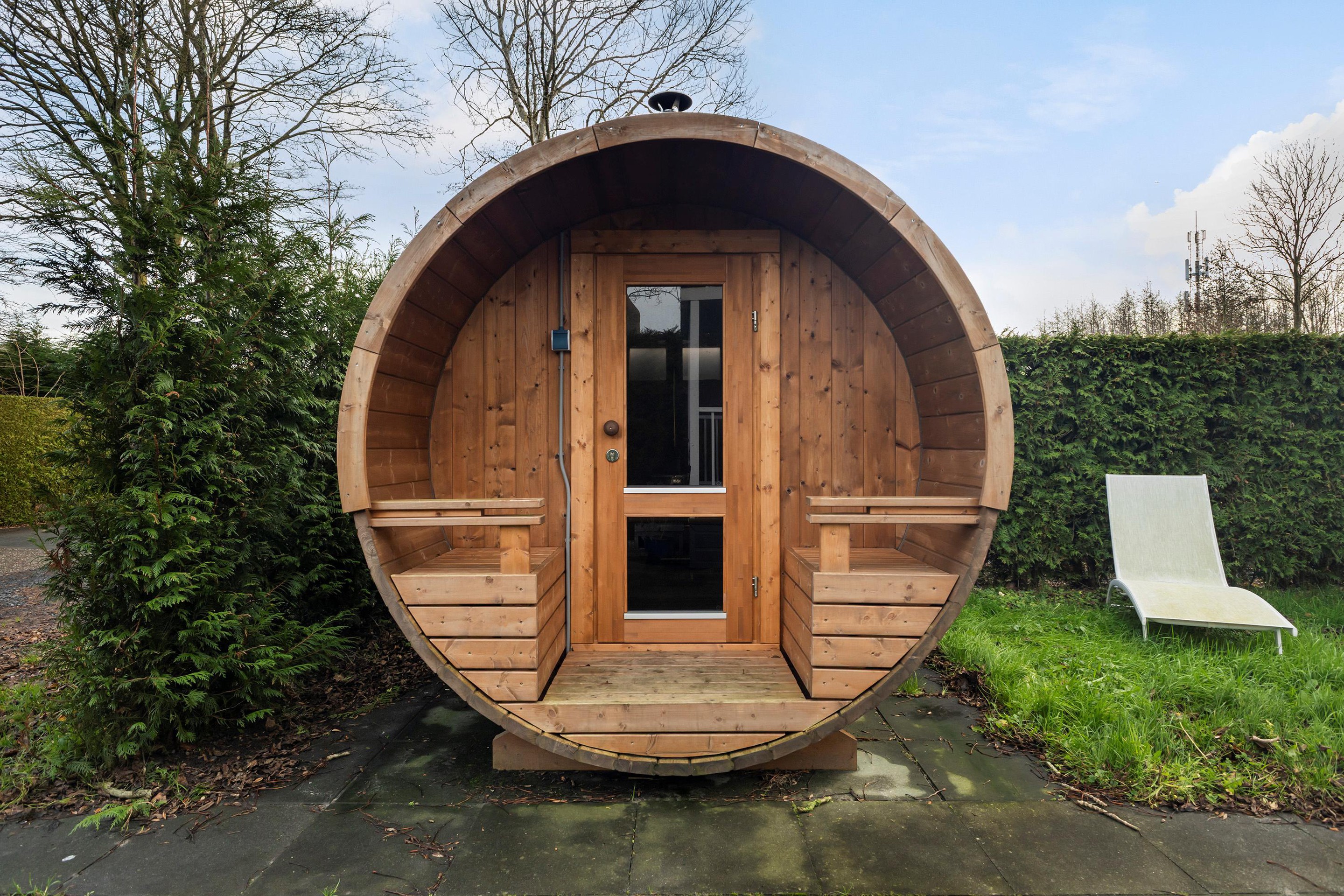 De tuin is een heerlijke plek om écht tot rust te komen. Rondom de woning ligt een strak aangelegde, volledig omsloten tuin met veel privacy, omgeven door groene hagen. Het ruime terras biedt volop plek voor een loungeset of eettafel en vormt een fijne verbinding tussen binnen en buiten. Wat deze tuin extra bijzonder maakt, zijn de wellnessvoorzieningen. Zo is er een houten barrelsauna waar je op elk moment van de dag kunt ontspannen, en een hottub voor lange avonden onder de sterren. Op het gazon liggen ligbedden klaar om in alle rust van de zon te genieten. Dankzij de beschutte ligging en de praktische indeling voelt de tuin als een privé buitenruimte, perfect passend bij het recreatieve karakter van de woning. Een plek waar ontspannen, comfort en vakantiegevoel samenkomen.